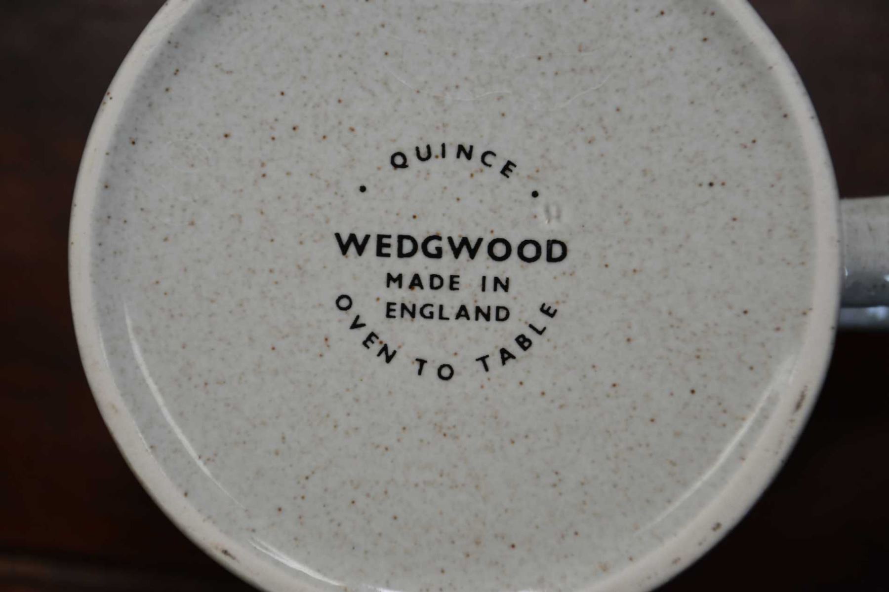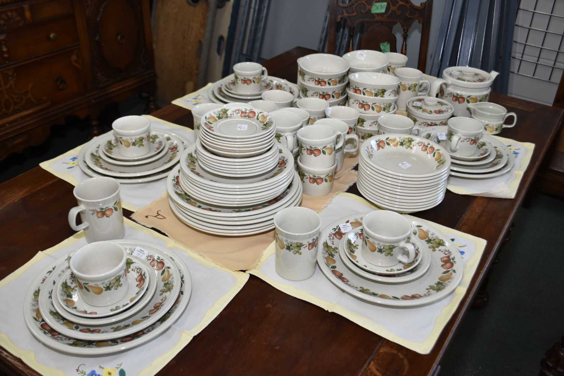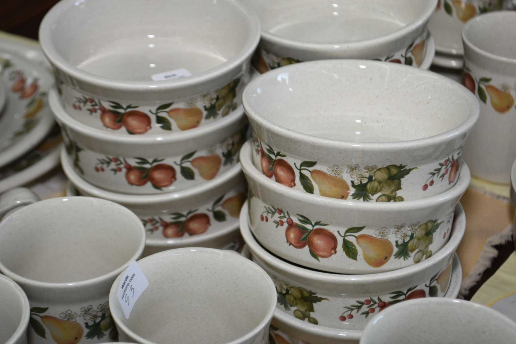 This item is not available for shipping. Local pickup only. Large selection of Wedgwood "Quince" stoneware dinnerware including setting for twelve of dinner plates, side plates, bread and butter plates, cereal and soup bowls, teacups and saucers plus coffee mugs, teapot, cream and lidded sugar