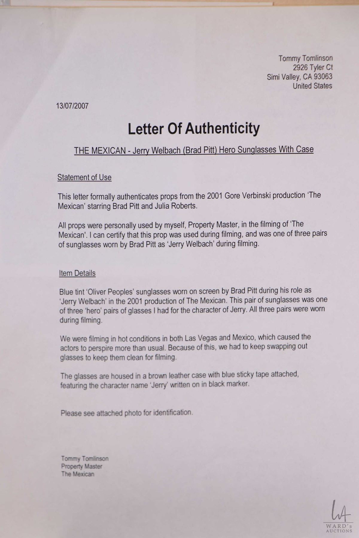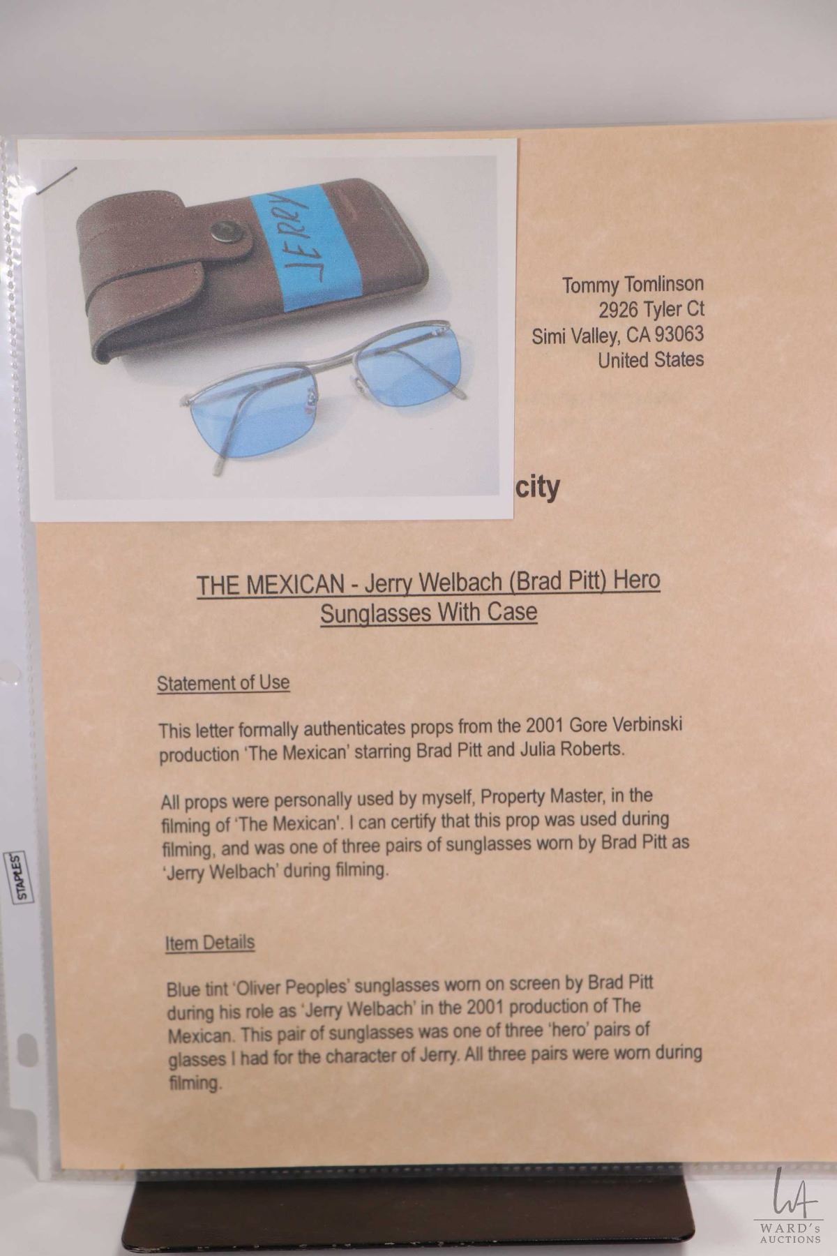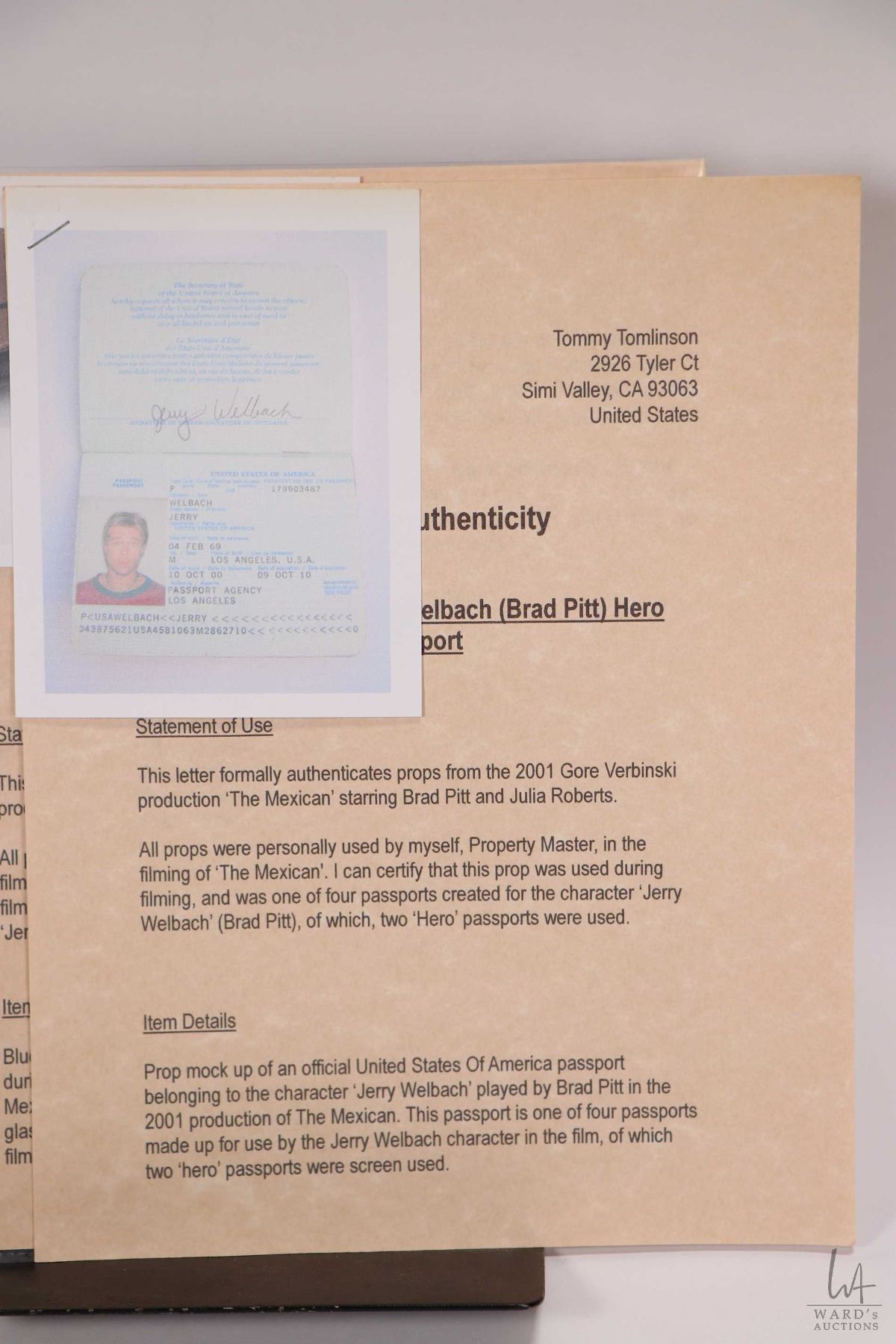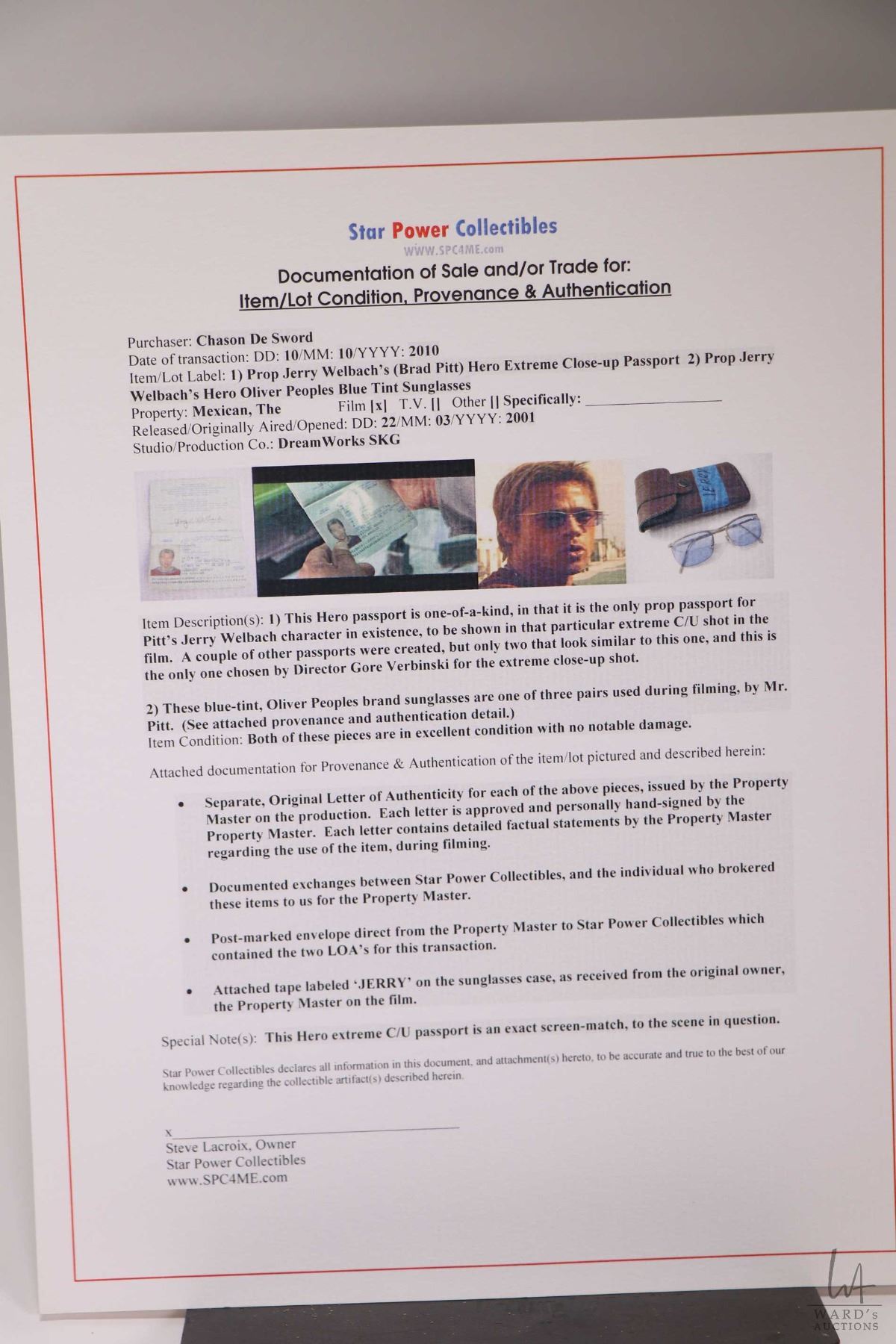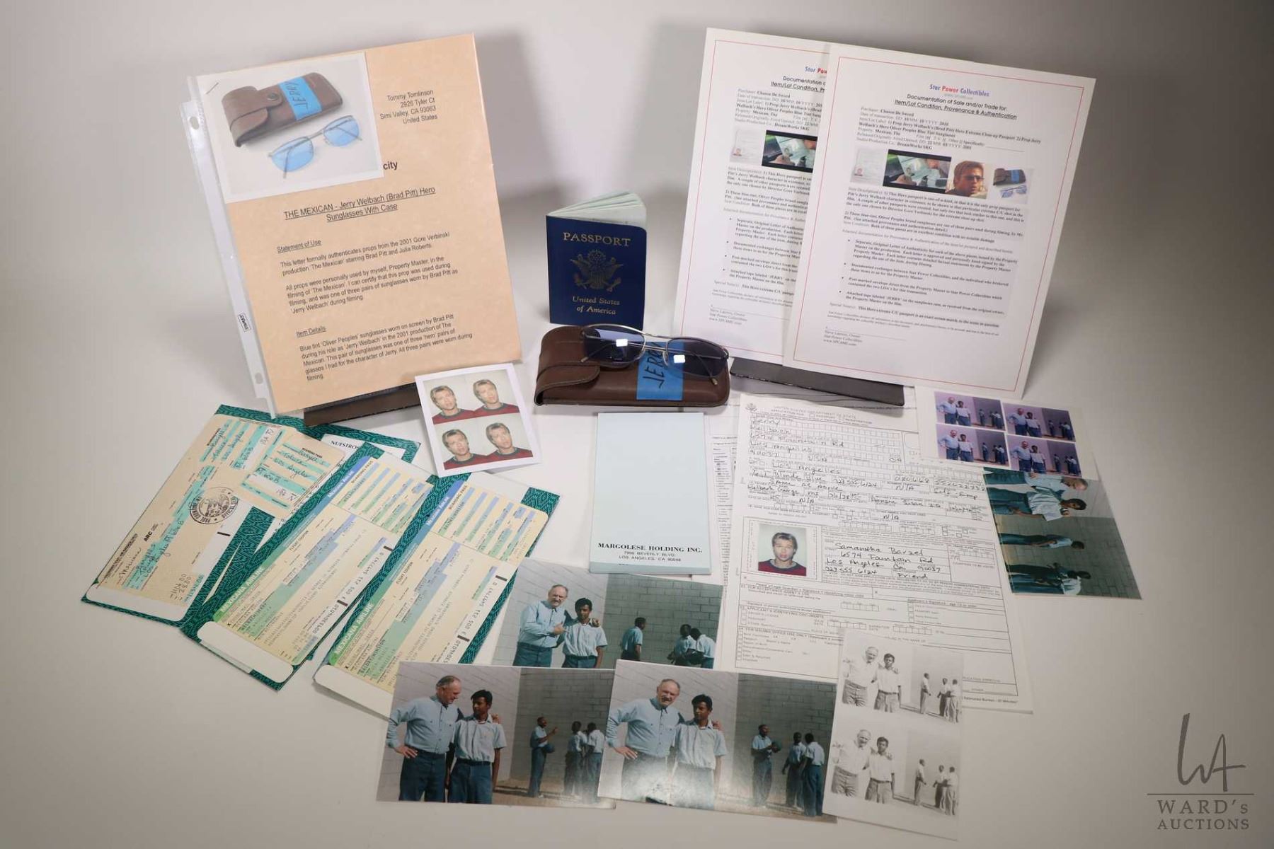 Large selection of authentic movie props from 2001 Gore Verbinski's production of "The Mexican" including the sunglasses, passport, airline ticket and boarding pass for Brad Pitt's character 'Jerry Welbach' plus Winston Baldry's (James Gandolfini) boarding pass, original photos of Arnold Margolese (Gene Hackman) and Brad Pitt's passport photos and a notepad from Margolese Holding Inc. Includes letters of authenticity and correspondence between the consignor and Tommy Tomlinson ( Property Master for the movie) including negotiation of a price of $2500.00 USD for passport and sunglasses