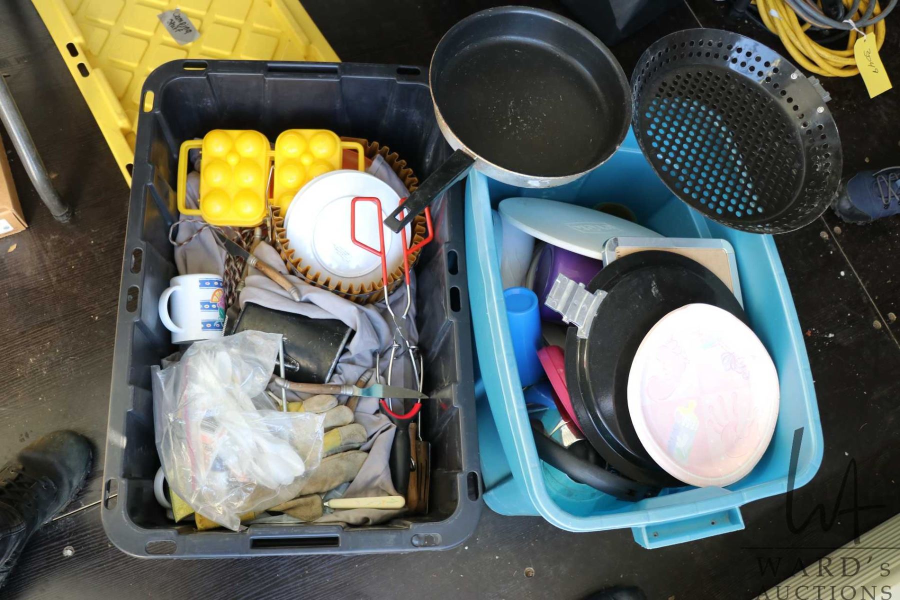 Large selection of camping supplies including pots and pans, dishes, cutlery, and other cooking related items