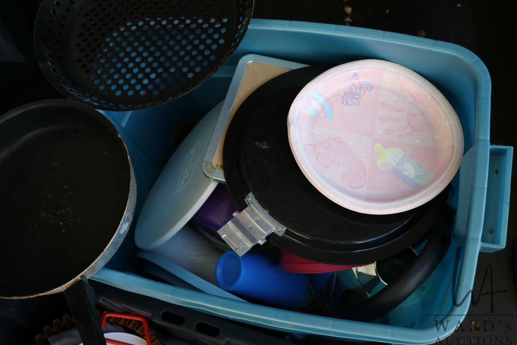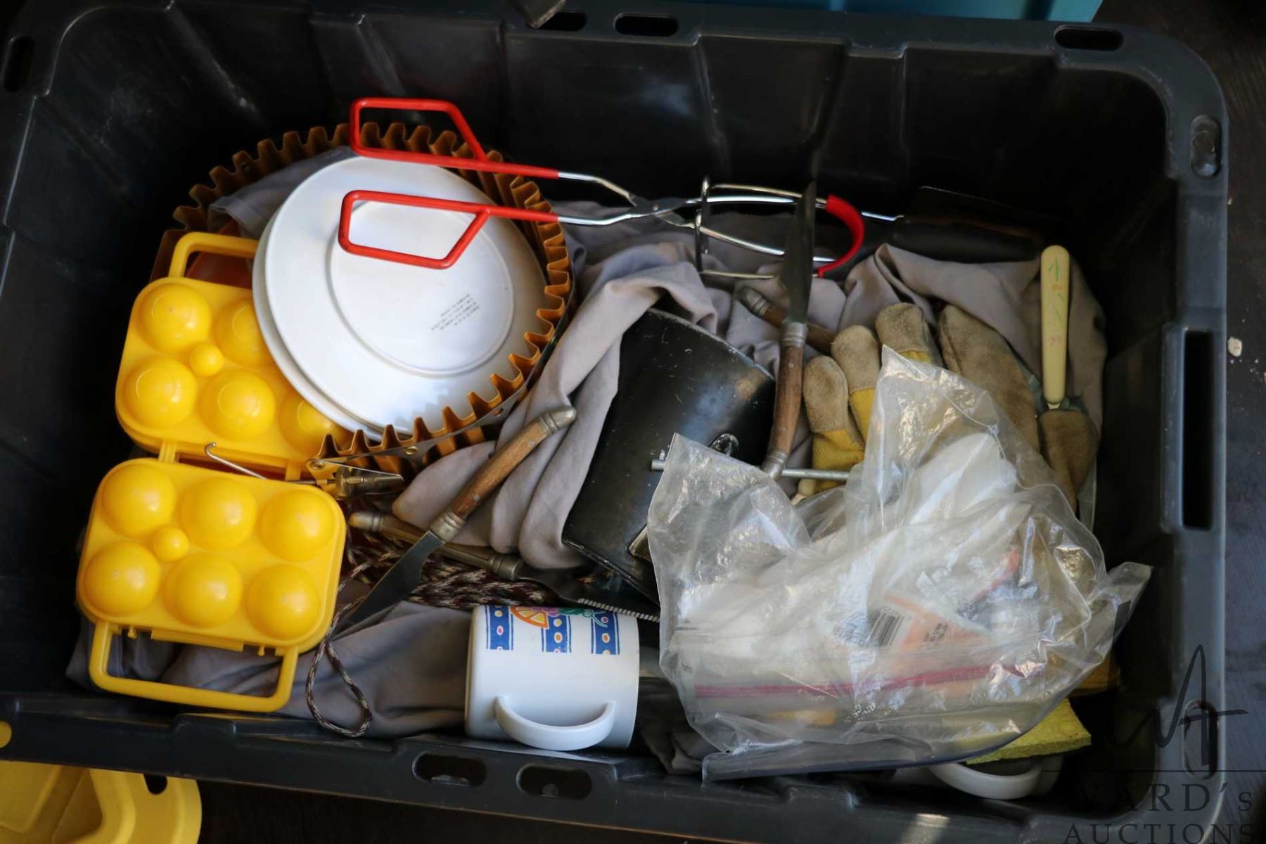 Large selection of camping supplies including pots and pans, dishes, cutlery, and other cooking rela