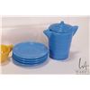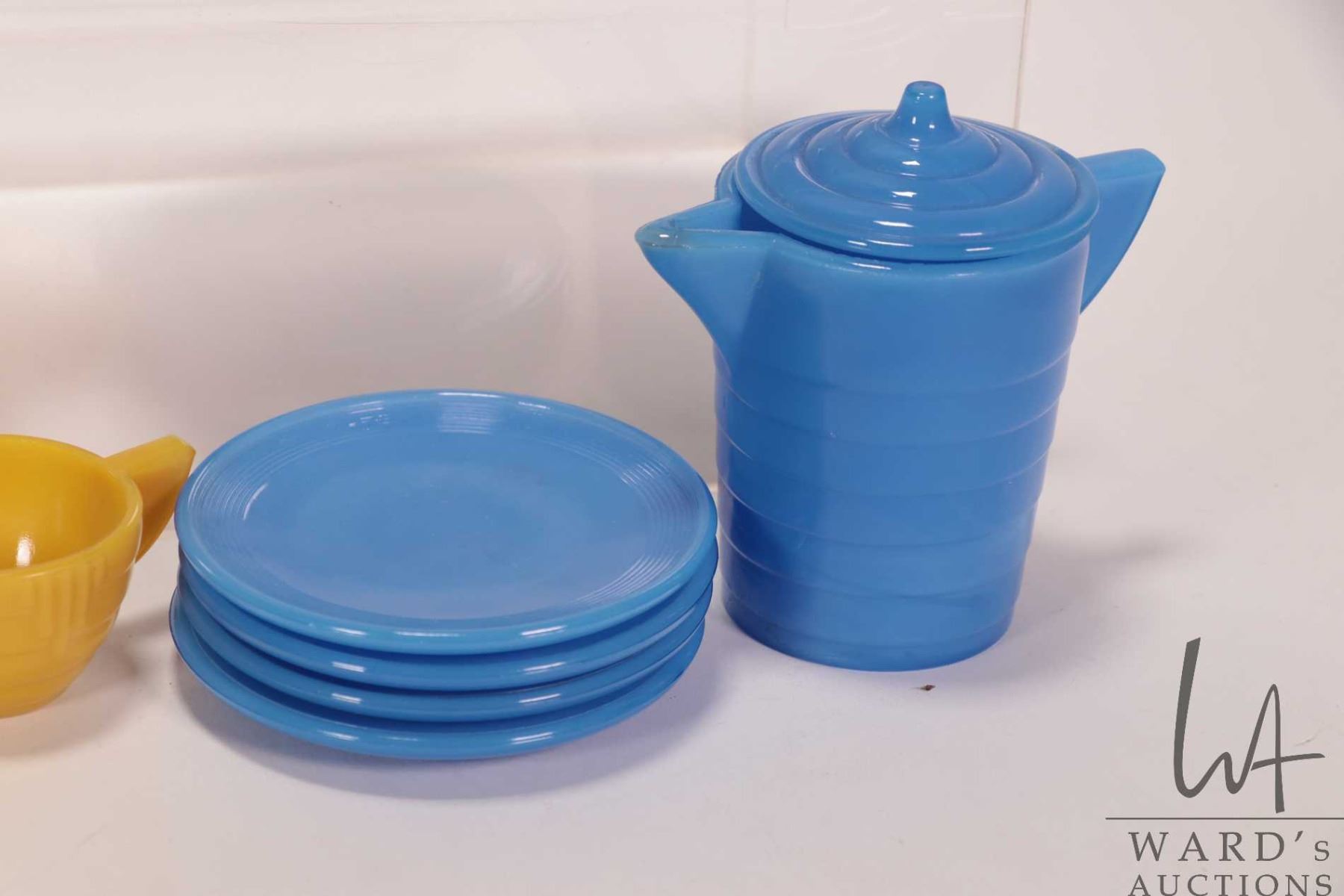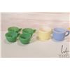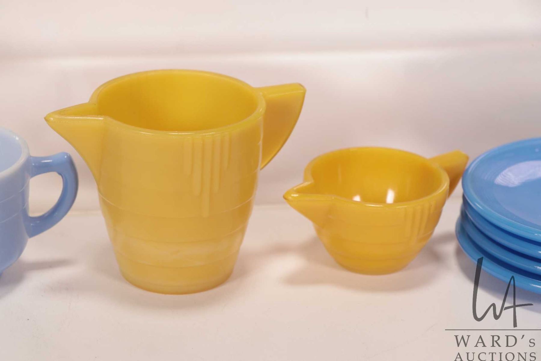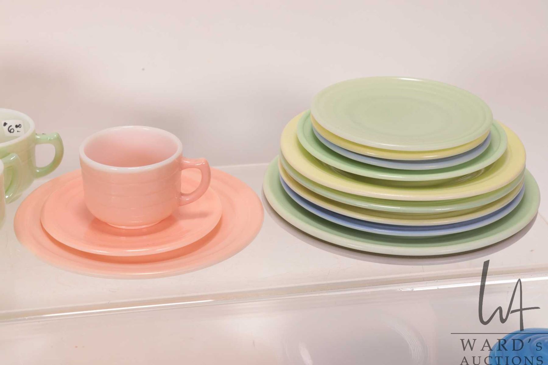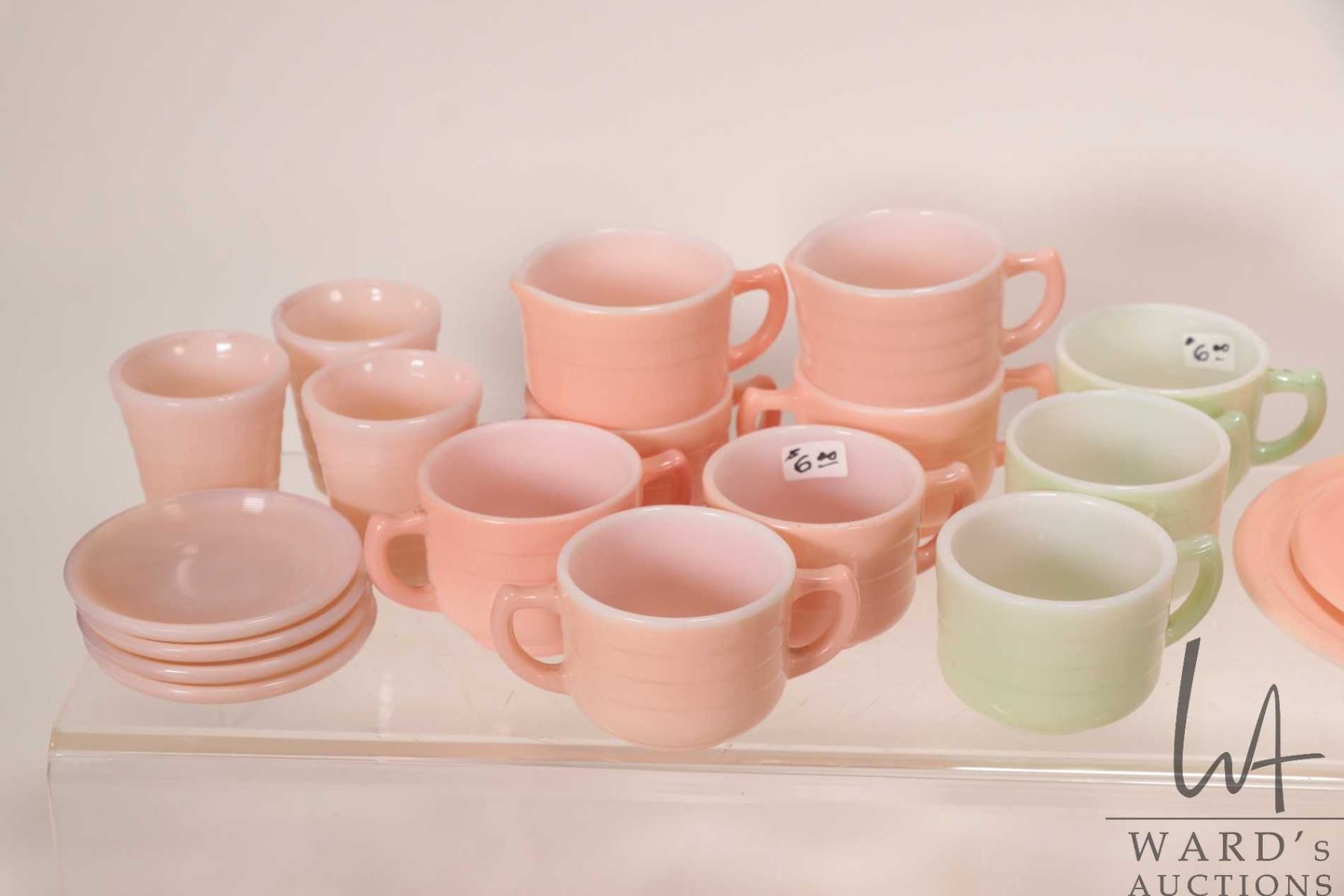 Large selection of child's glass dishware including creams and sugars, teacups and saucers, small ju