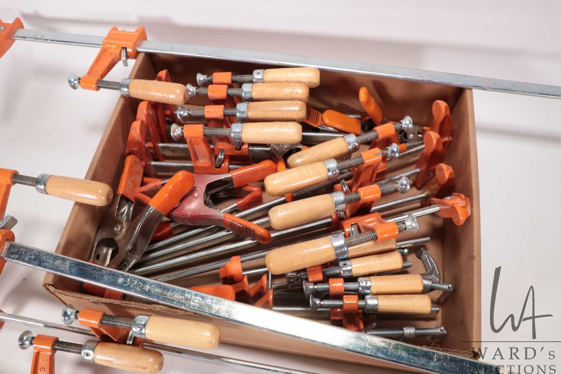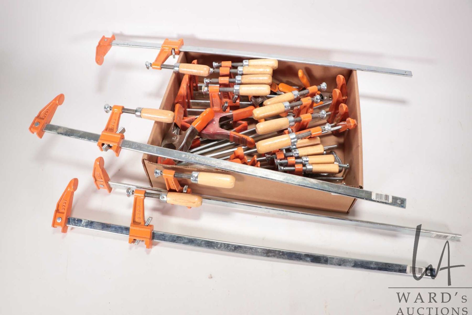 Large selection of clamps including seventeen Jorgensen bar clamps in assorted sizes, spring clamps