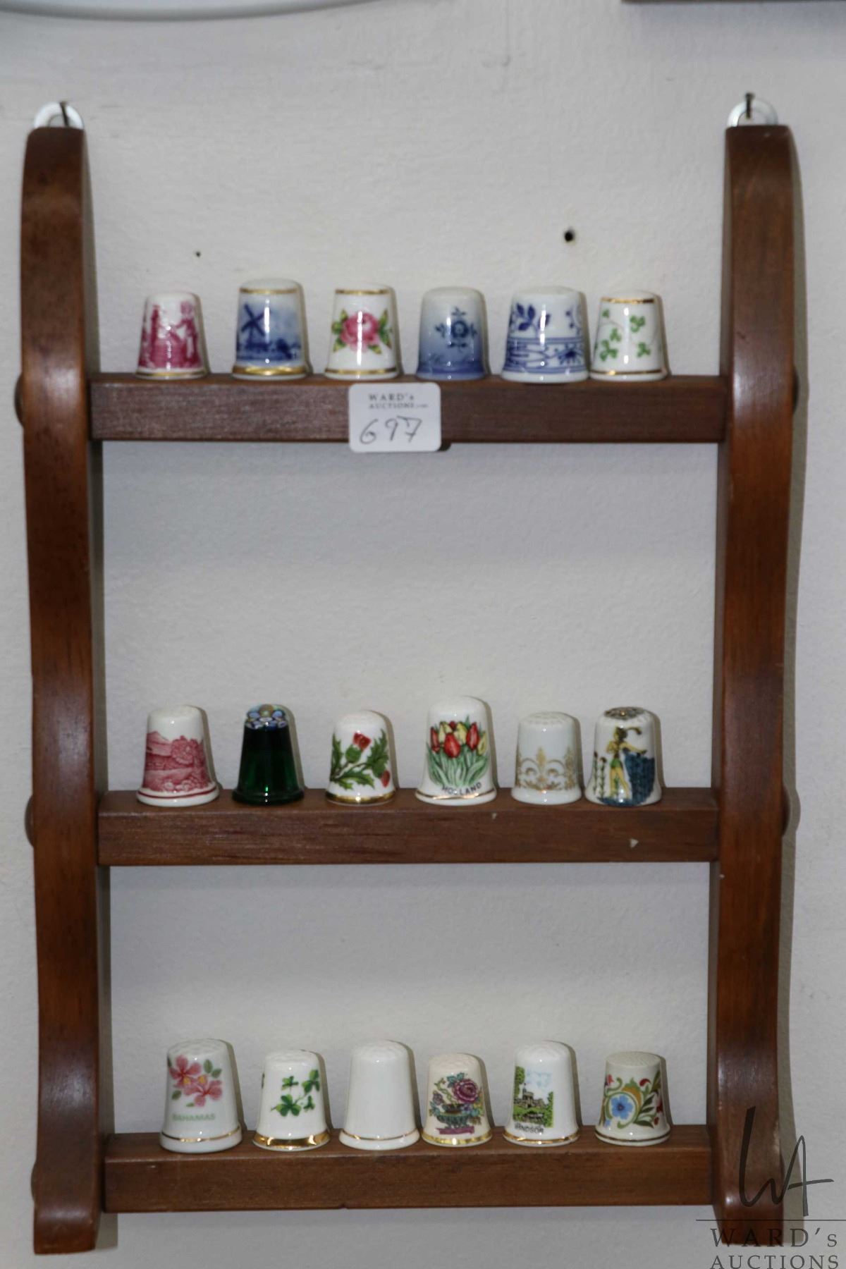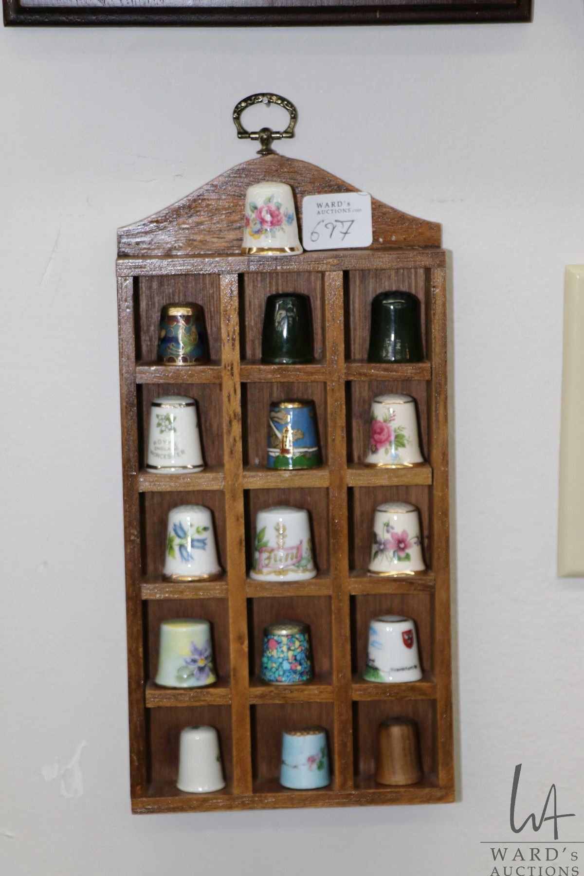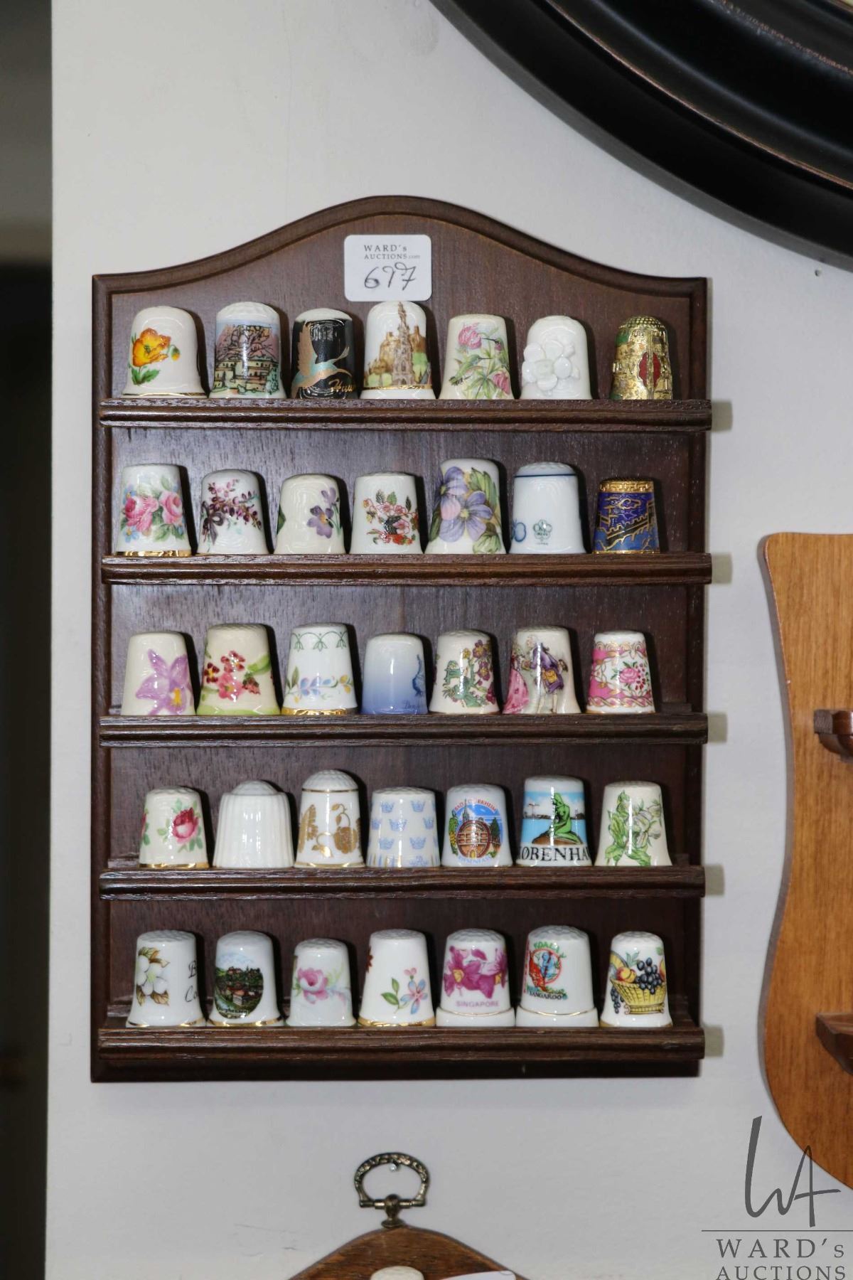 Large selection of collectible thimbles including "Thimbles of the World's Greatest Porcelain Houses", metal thimbles, jade thimble, Murano glass etc. plus five wooden wall mount thimble holders