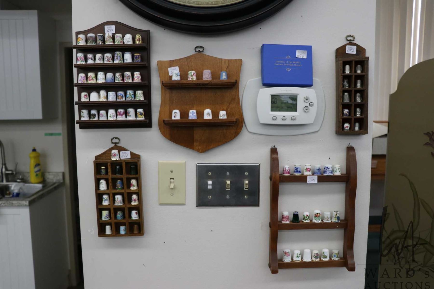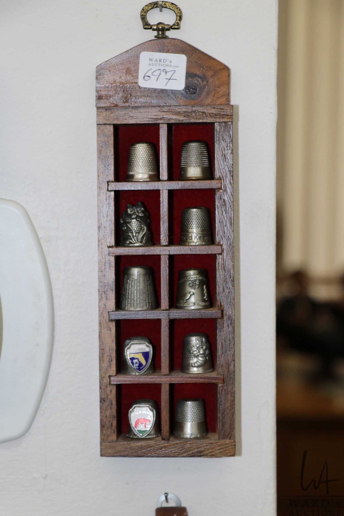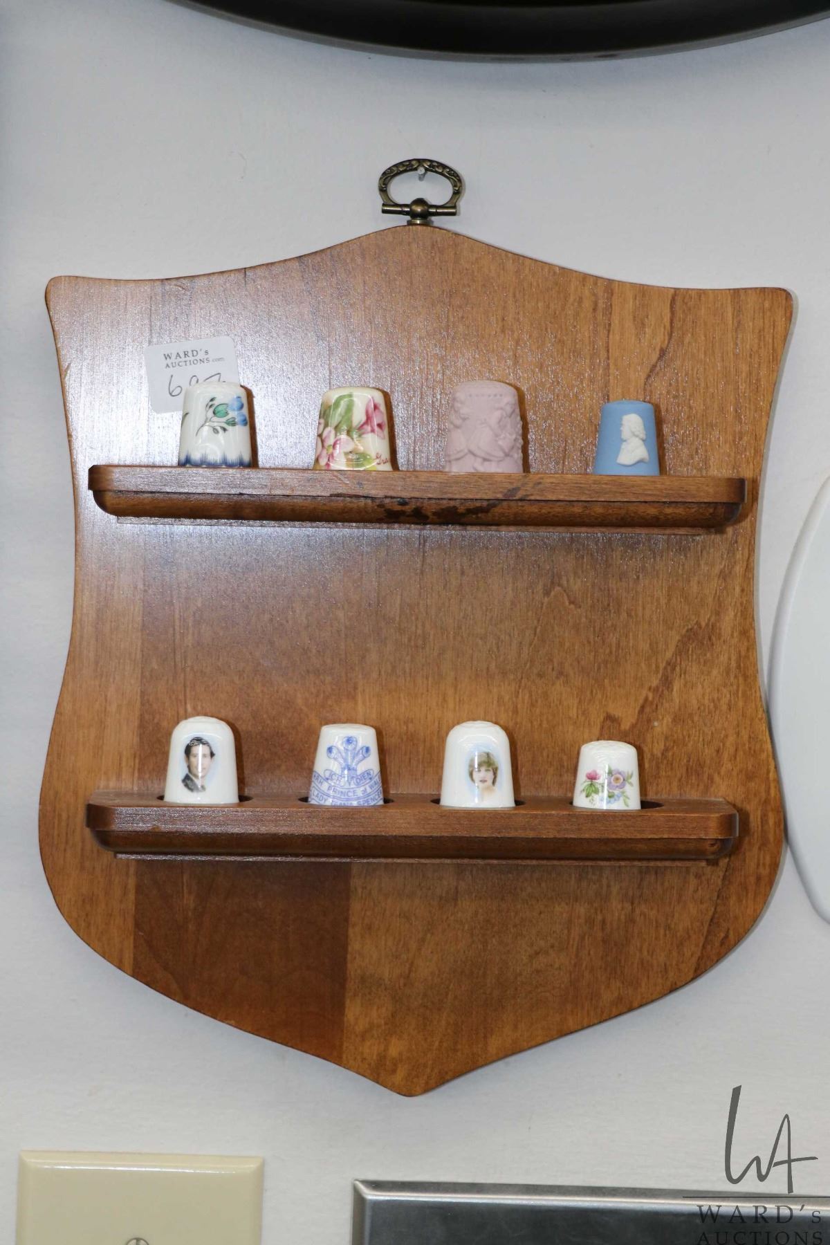 Large selection of collectible thimbles including "Thimbles of the World's Greatest Porcelain Houses", metal thimbles, jade thimble, Murano glass etc. plus five wooden wall mount thimble holders