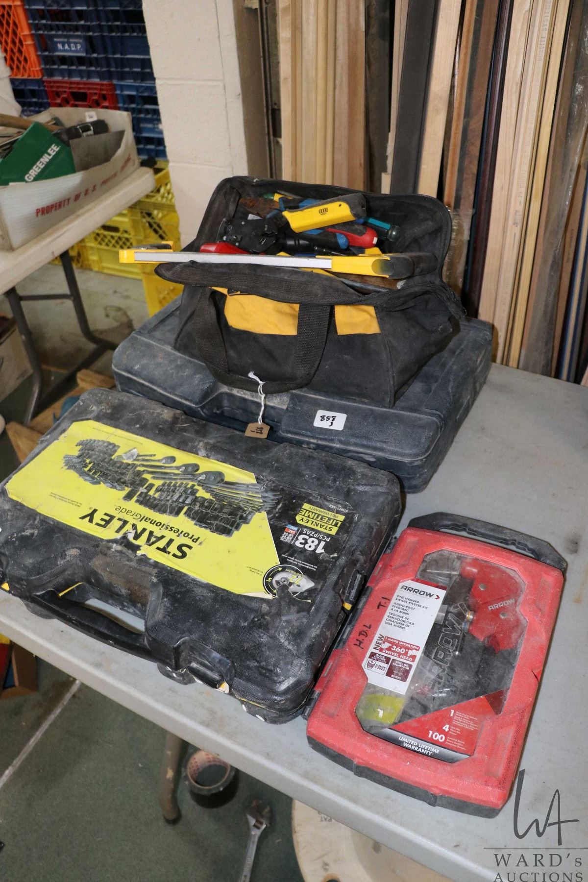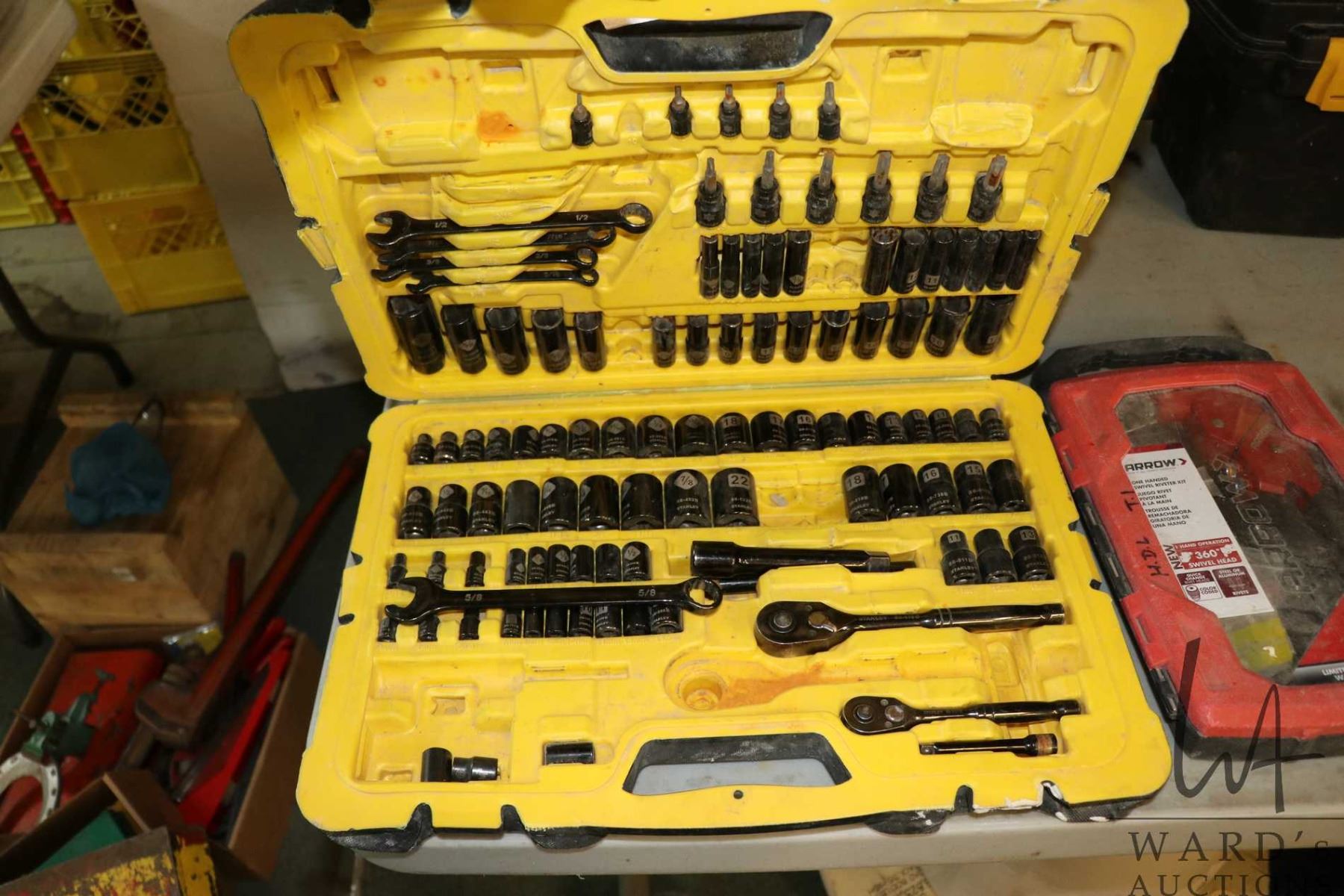 Large selection of hand tools including two socket sets, side cutters, pliers, Allen wrenches, screwdrivers, chisels, hammers, wrenches, rivot gun set etc.