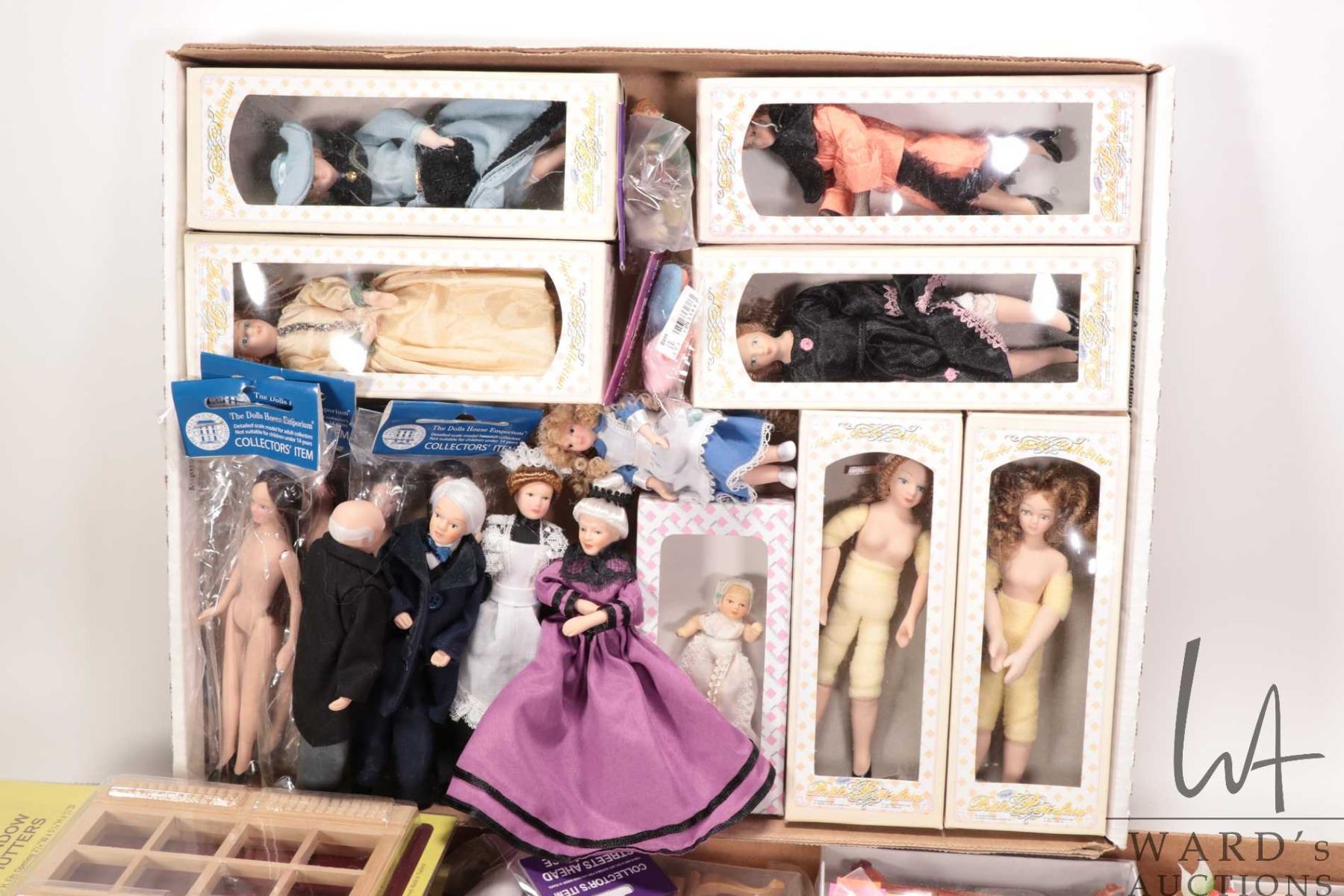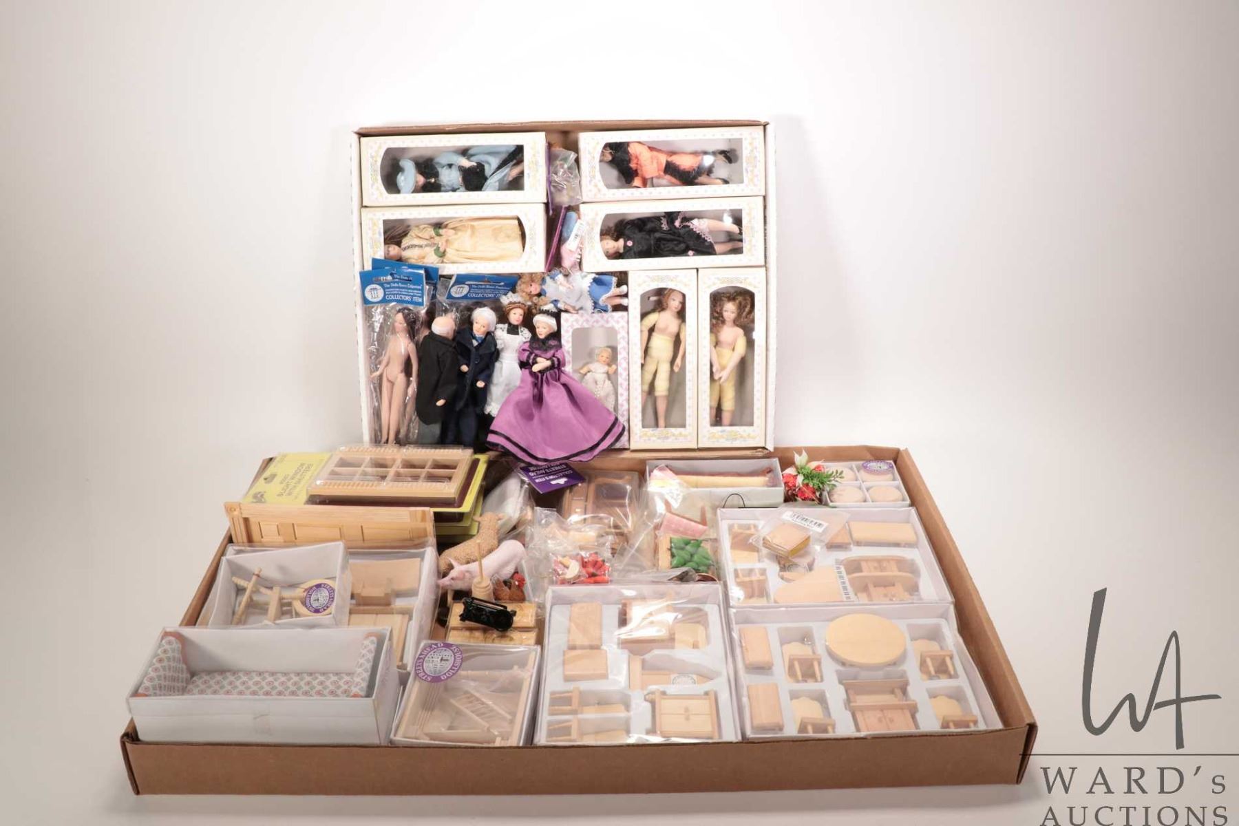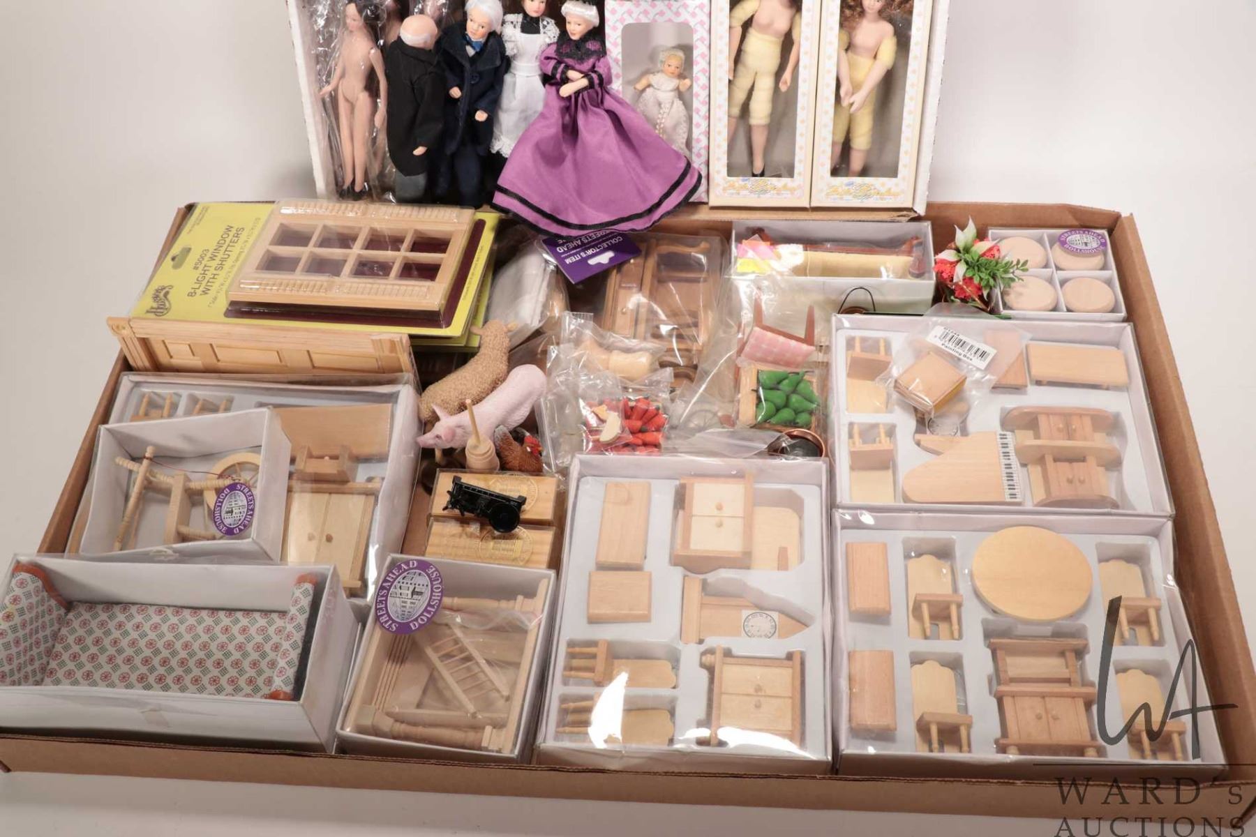 Large selection of new in box dolls house furniture and accessories including Houseworks packaged windows and door, furniture sets and a large selection of dolls house dolls etc.