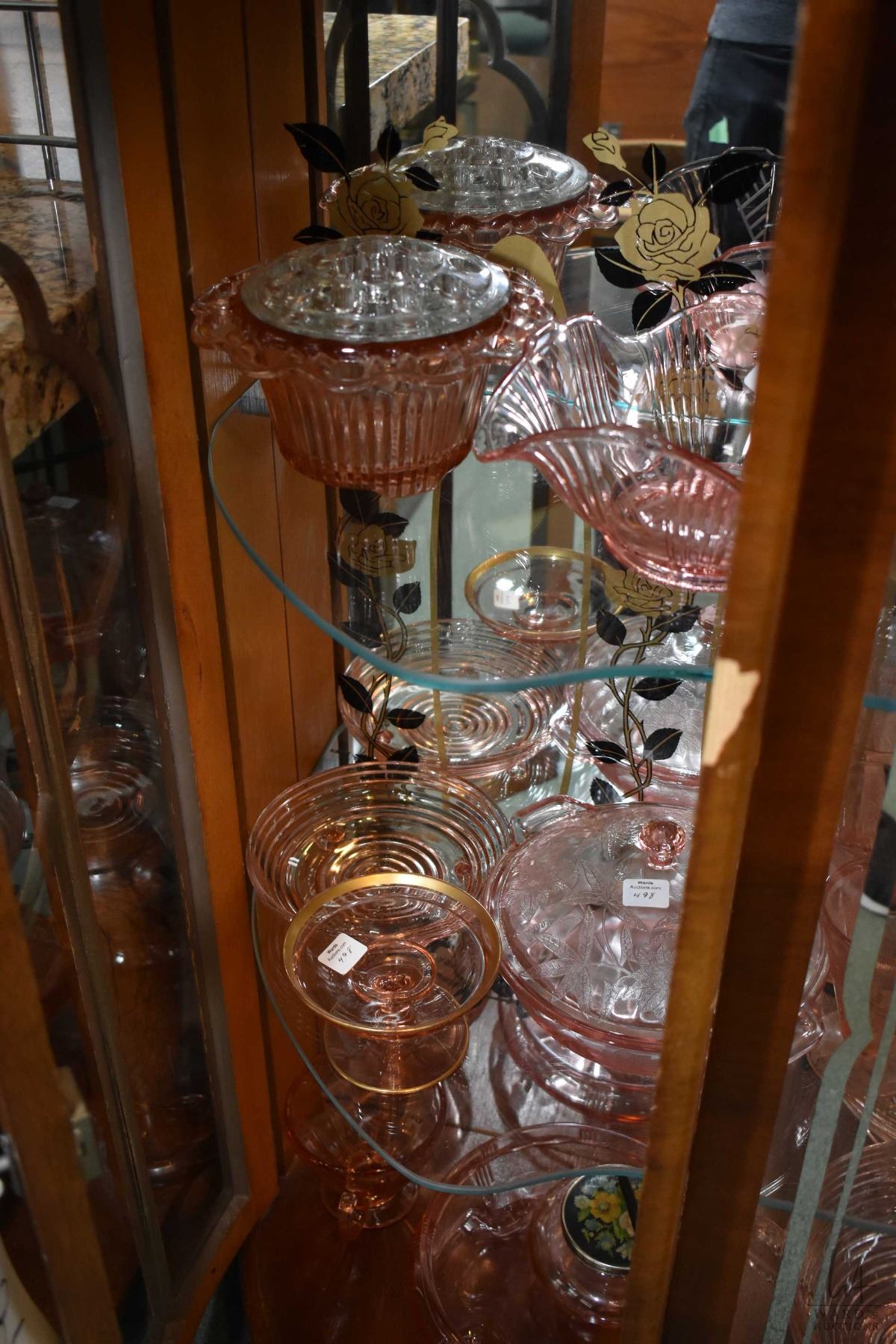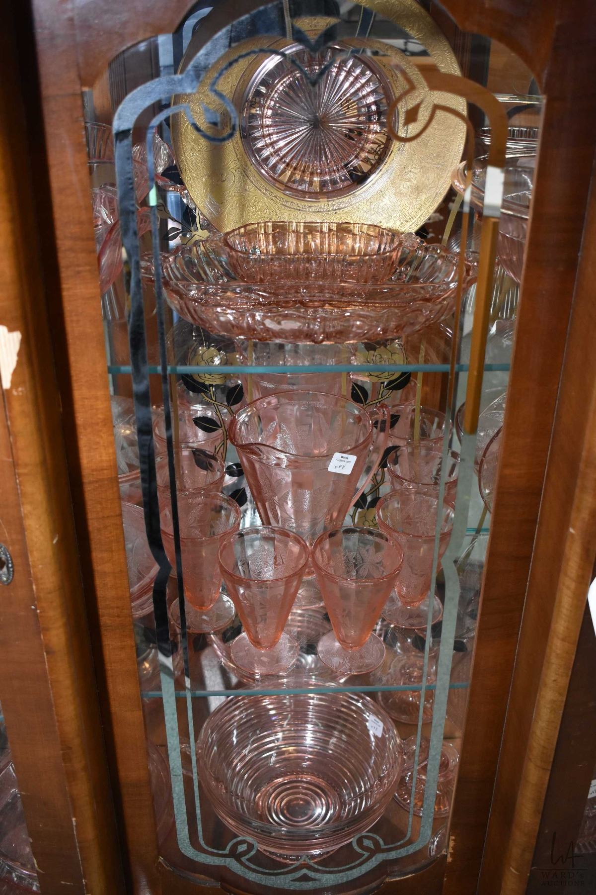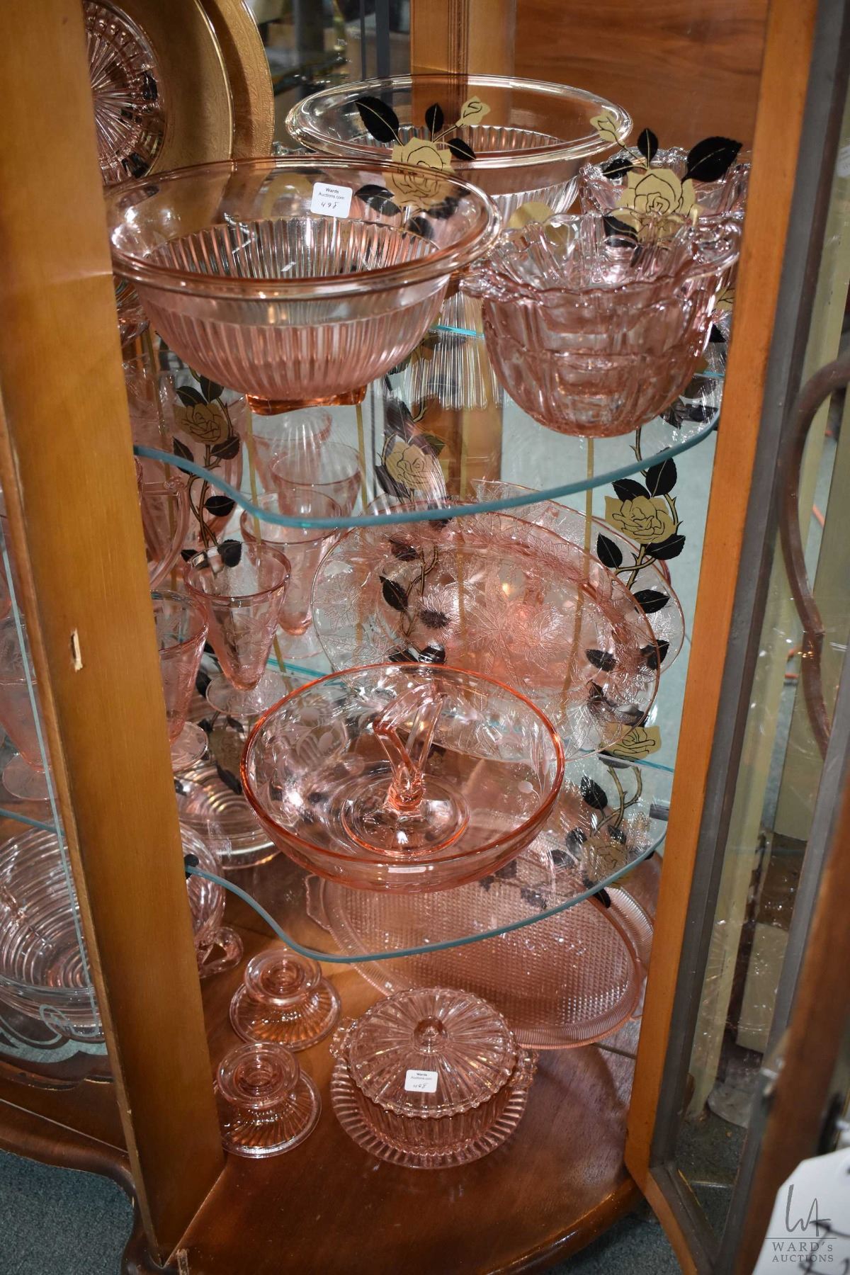 Large selection of pink depression glass including water jug and six glasses, large double handled bowl, mixing bowl, footed fruit bowl, shallow rose bowl with fitted colourless frog pink and gilt edged cake plate, two oval platters, a pair of candlesticks, lidded dresser box etc.. Note: No Shipping. Local Pickup Only