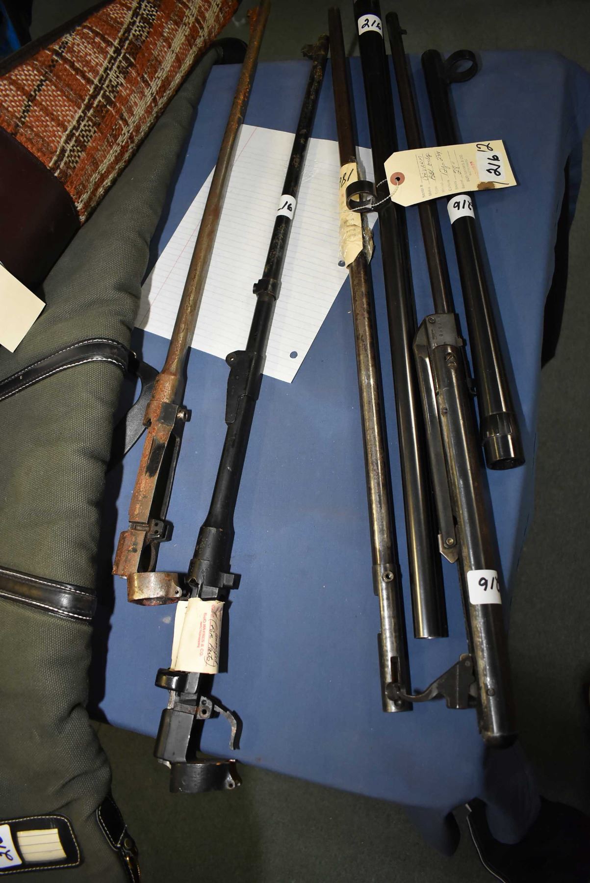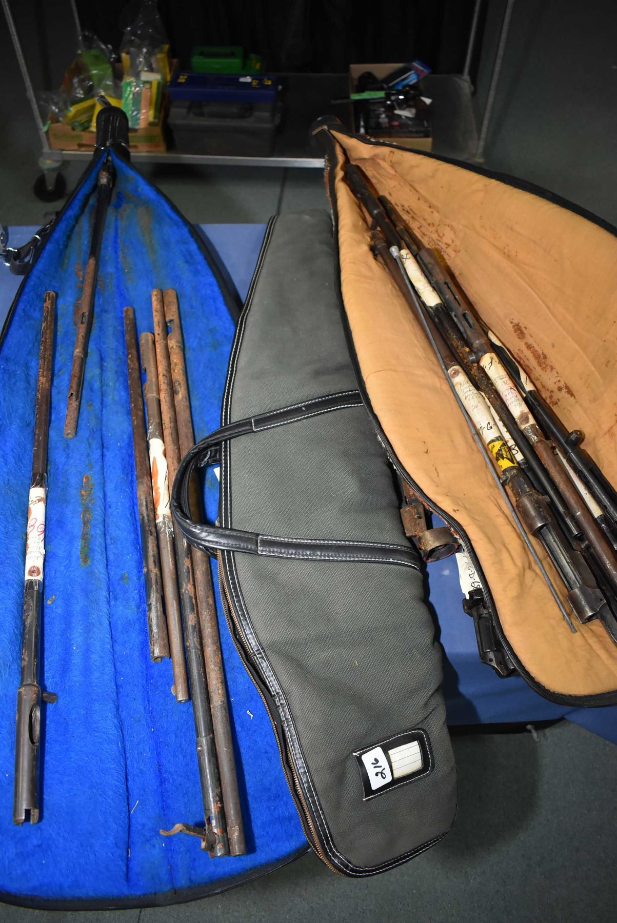 Large selection of rifle and shotgun barrels, a Slavia 620 air rifle with no stock, three soft cases etc.