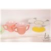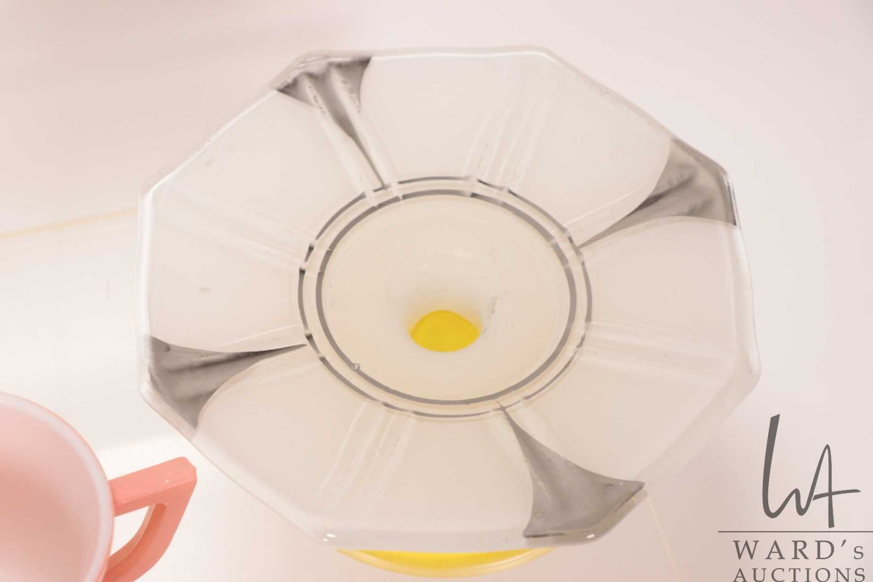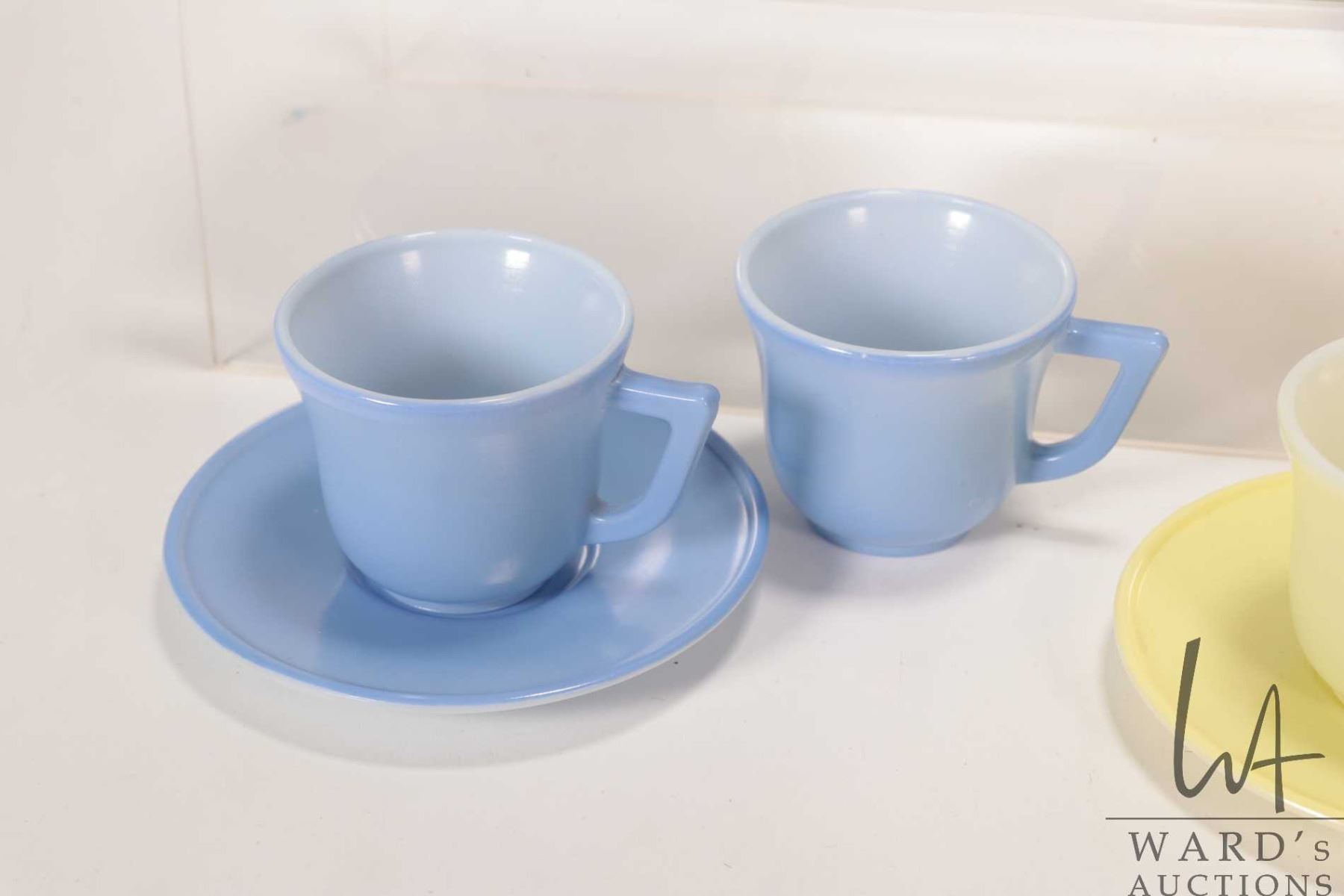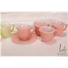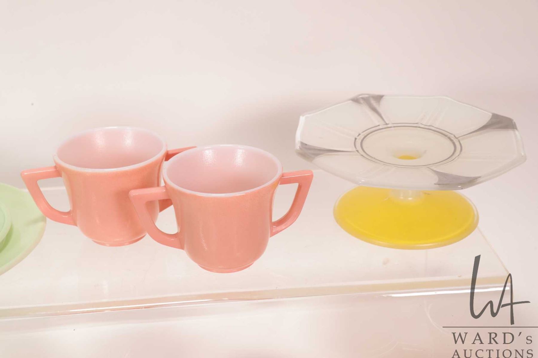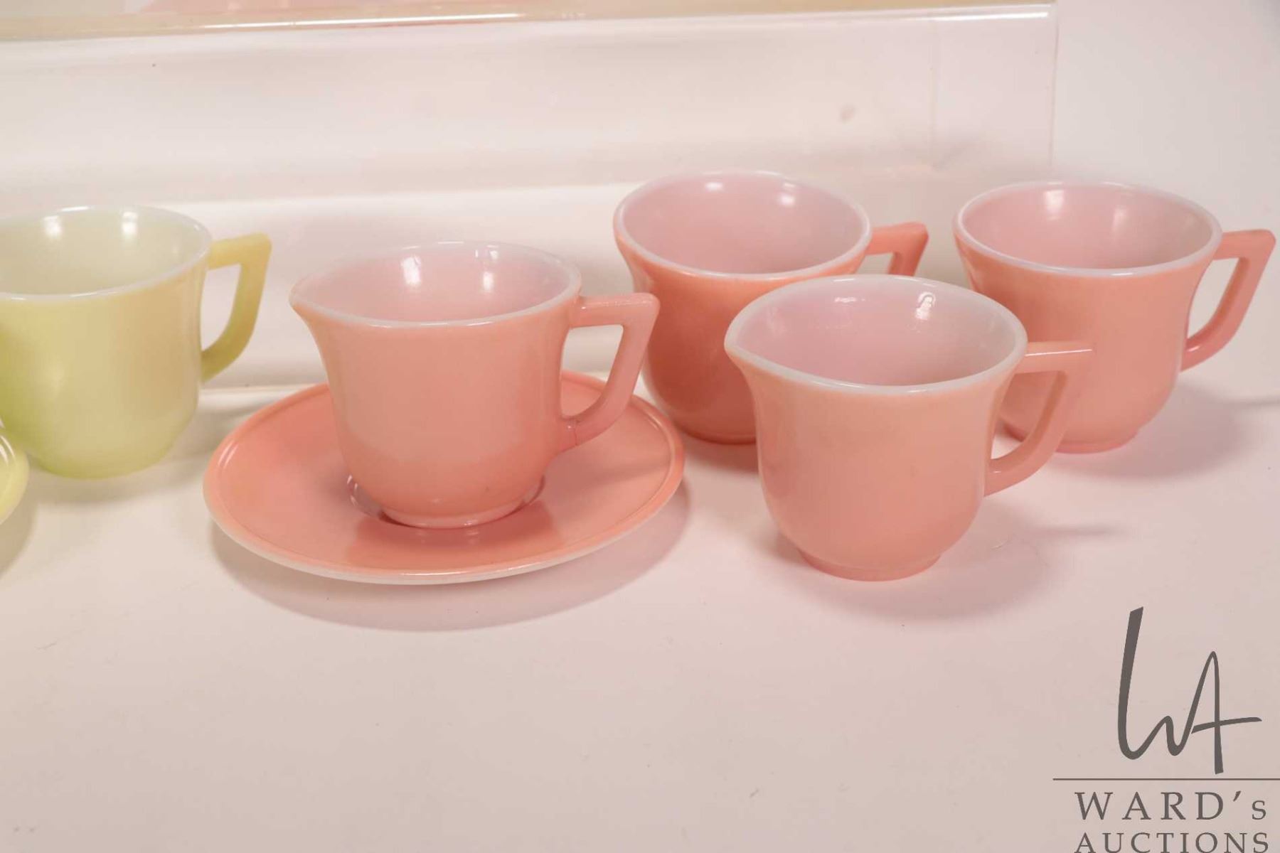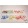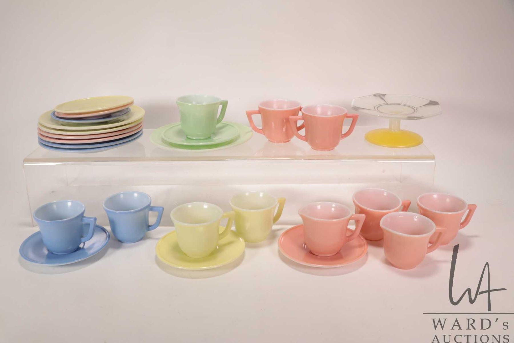 Large selection of vintage child's glass dishware including nine tea cups, seven saucers, seven side