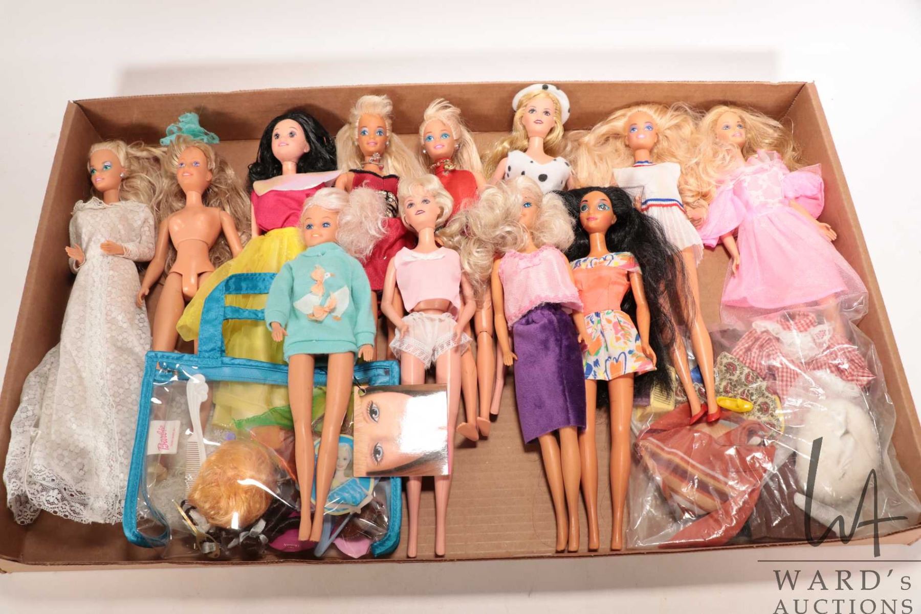 Large selection of vintage fashion dolls including Tootsie Toys, Disney, Barbie, Lucky Barbie clone etc. plus a selection of doll accessories. Note: all in played with condition