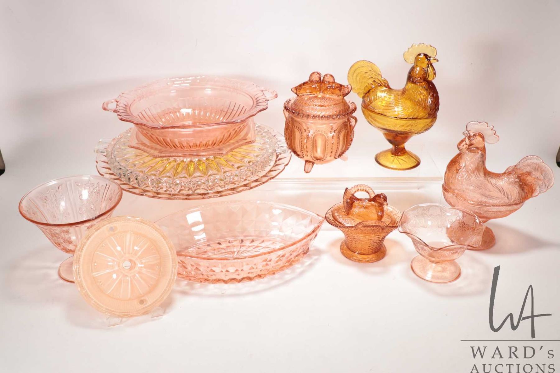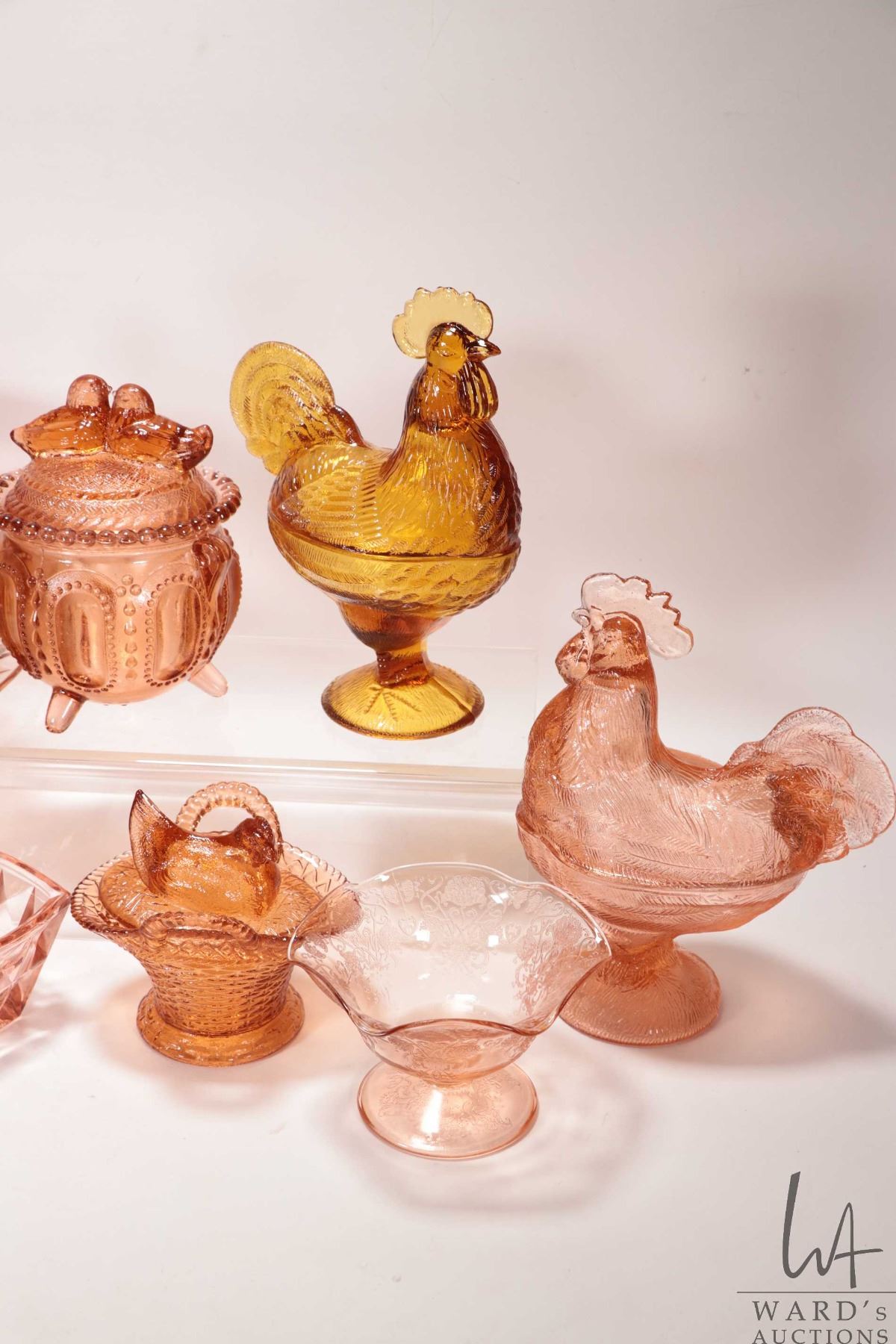 Large selection of vintage glass includings roosters, pot with lovebird finial lid, bowls, plates et