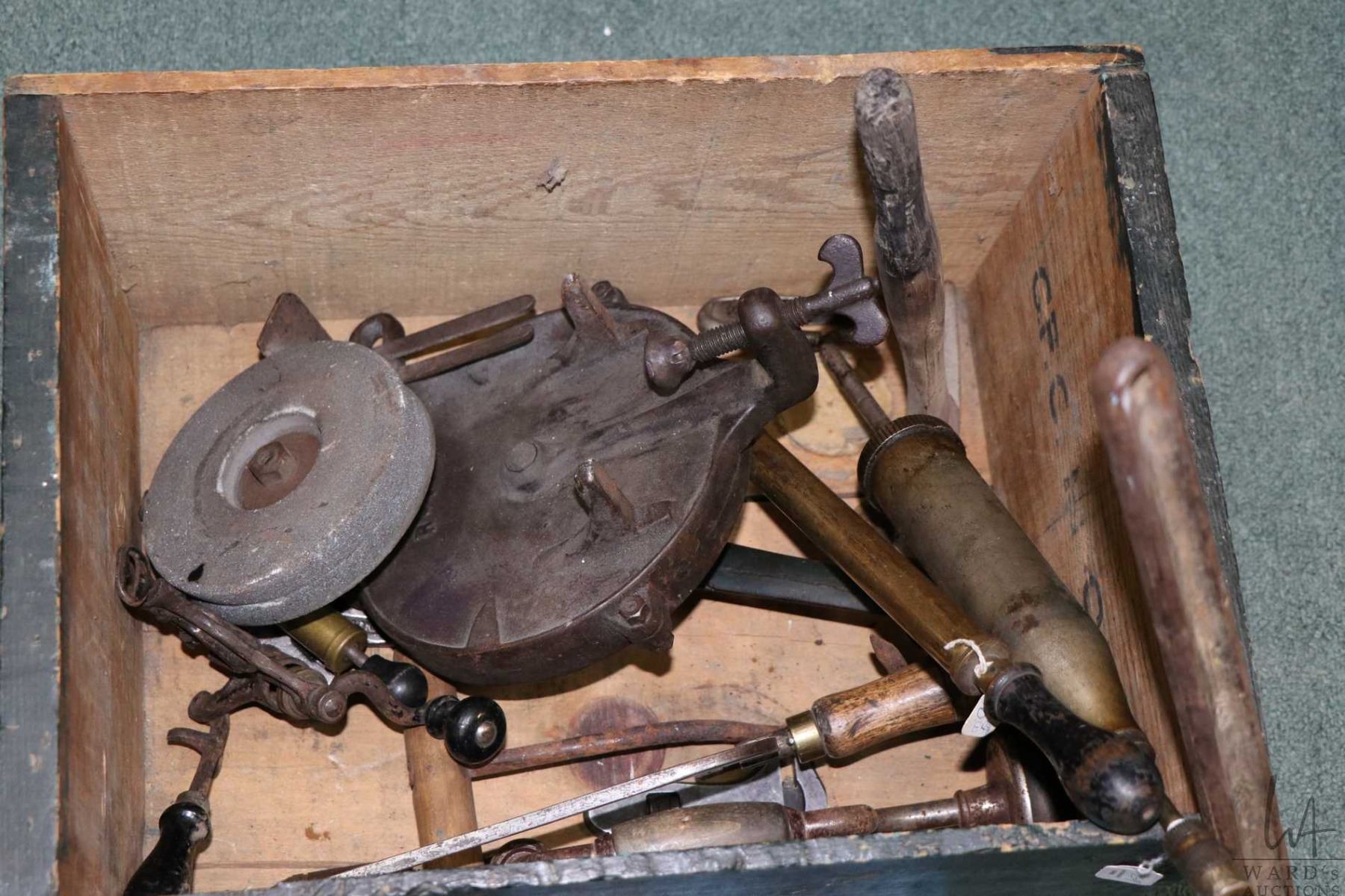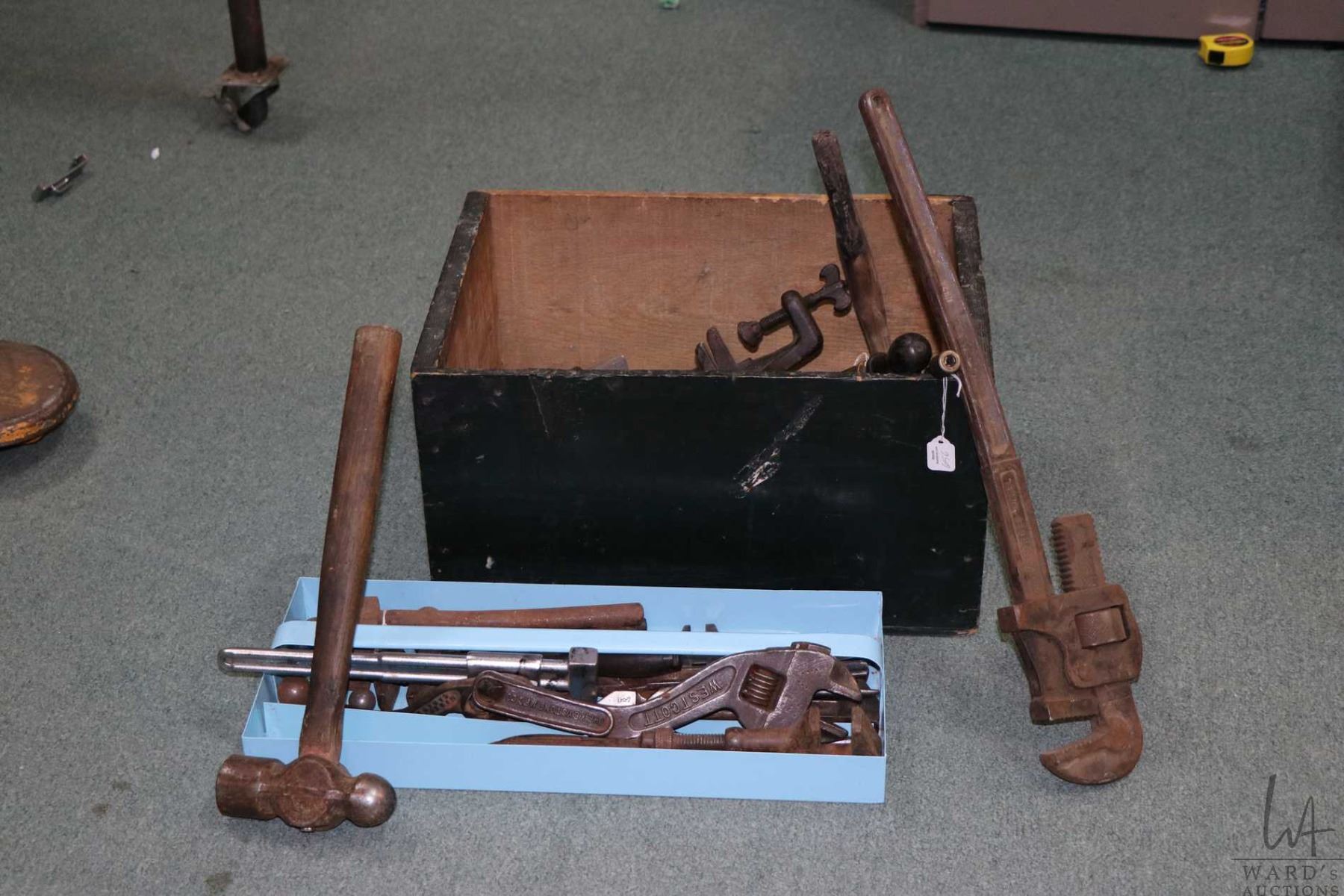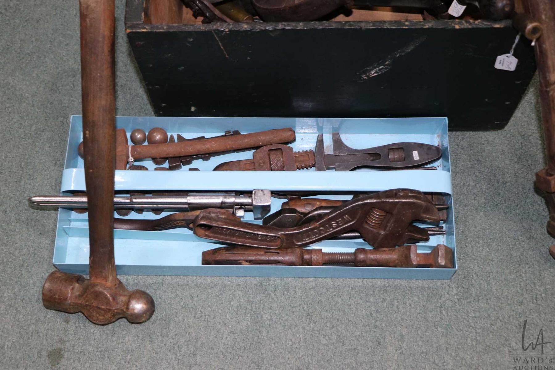 Large selection of vintage hand tools including adjustable wrenches, pipe wrenches, pliers, hammers, hand drills, hand grinders etc.