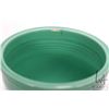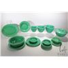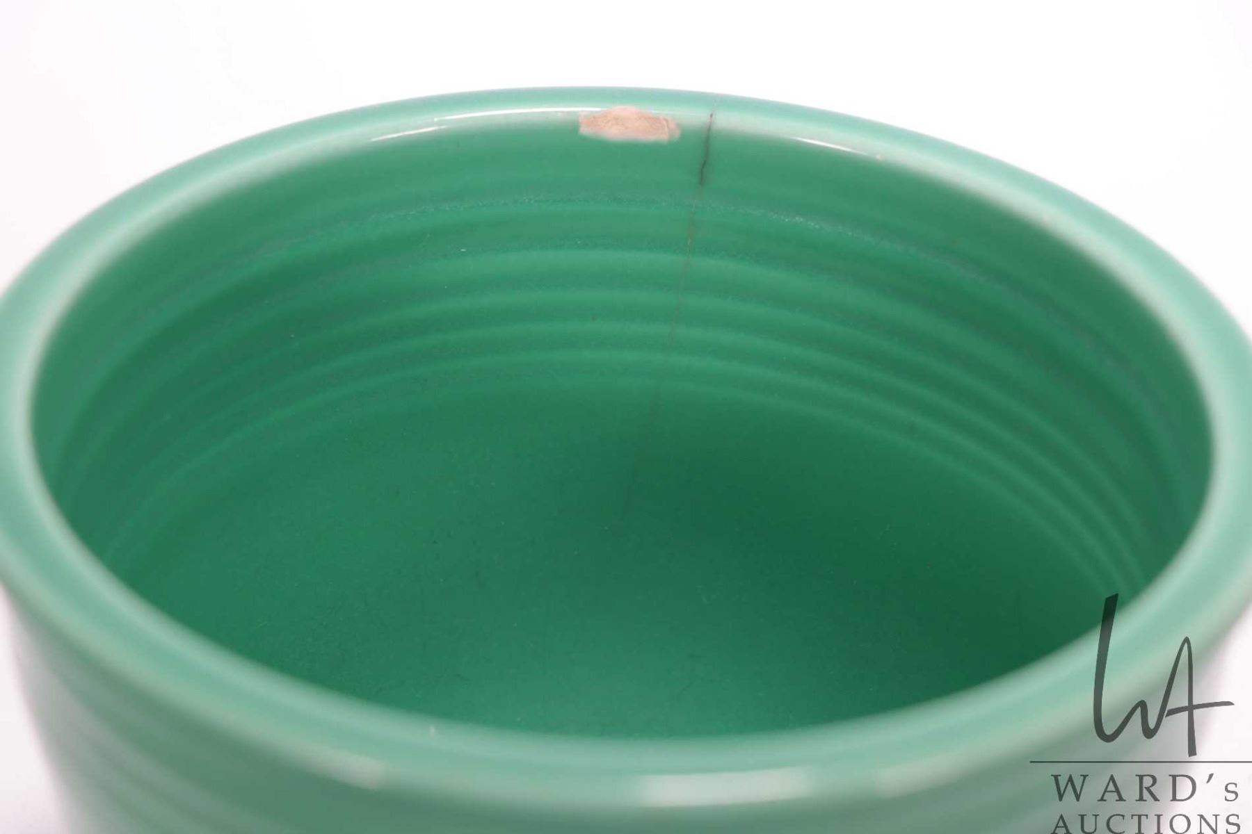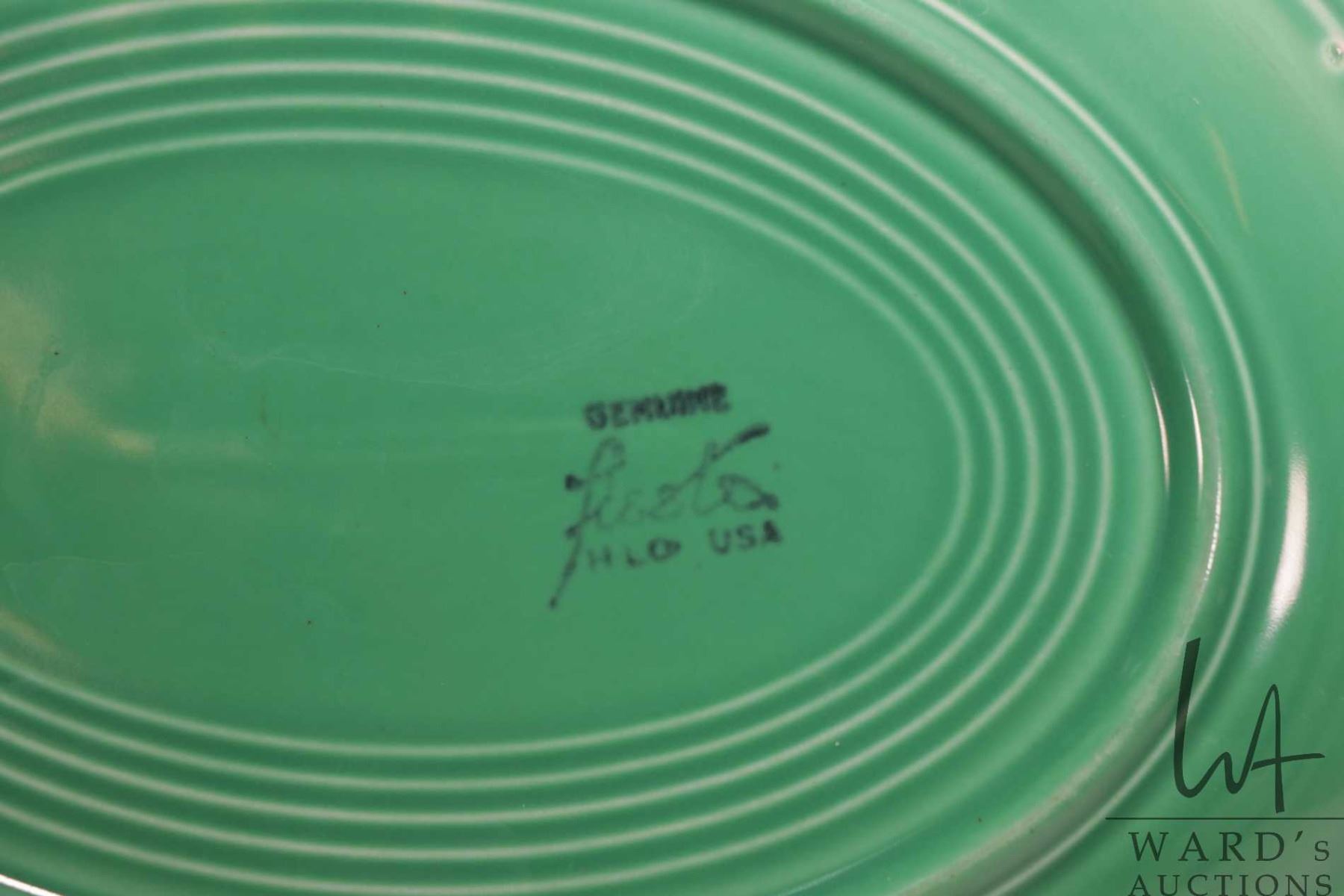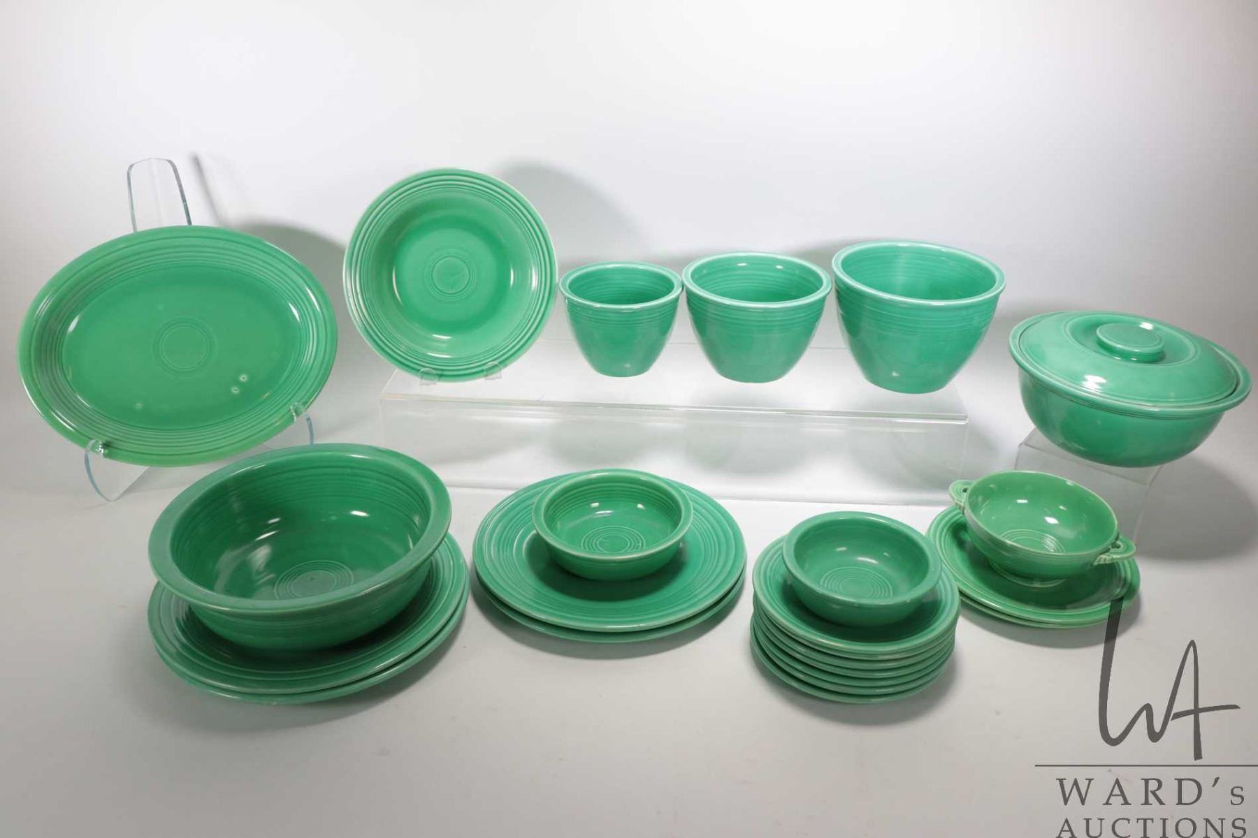 Large selection of vintage meadow green Fiestaware including two 10 1/2" dinner plates, two 9 1/2" dinner plates, two 7 1/2" plates, seven 6 1/4" plates, one soup bowl, two assorted dip bowls, double handled dish, graduated set of three dip bowls, lidded vegetable dish, open vegetable dish and a 12 1/2" oval platter. Note: Not available for shipping. Local pickup only