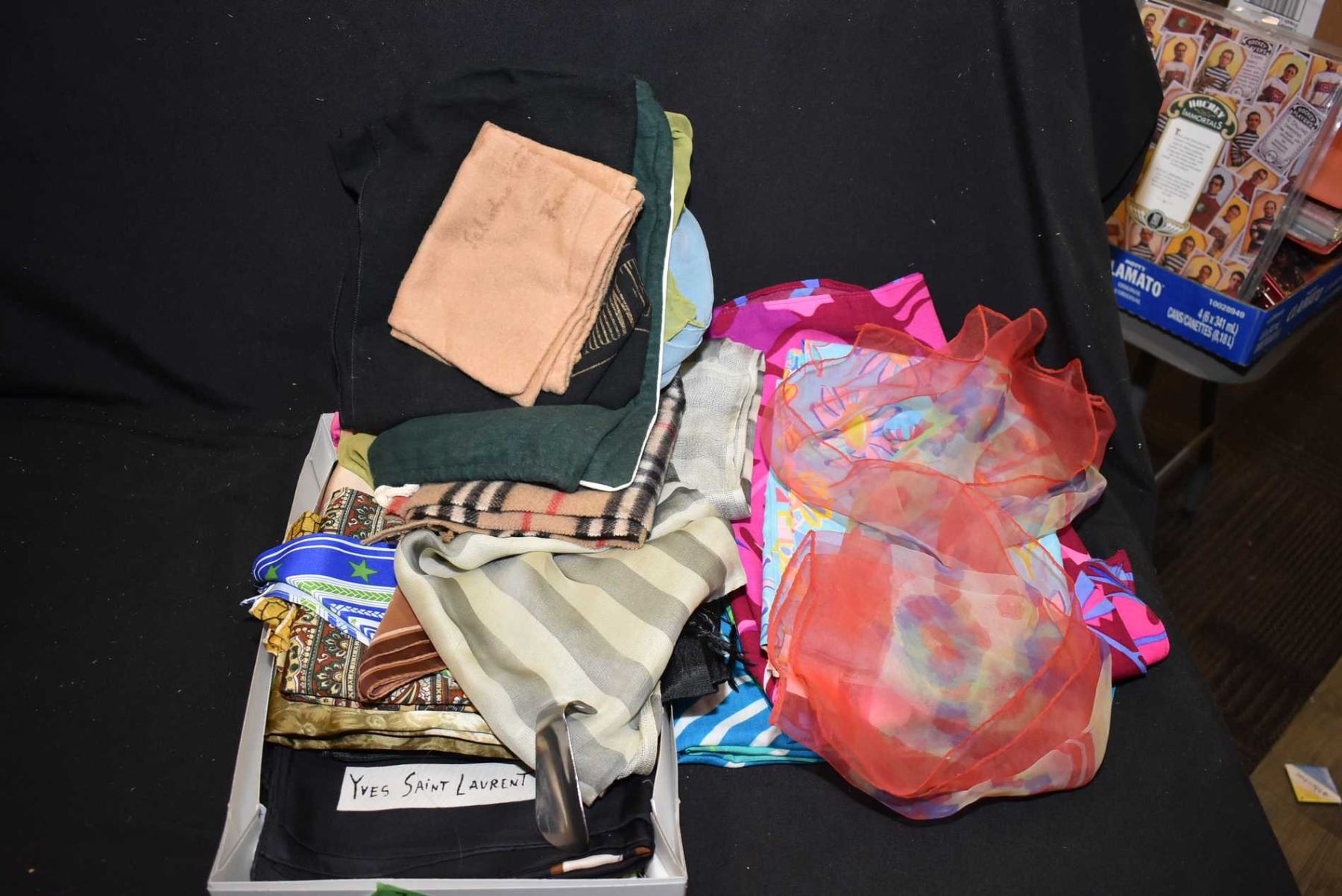 Large selection of vintage scarves including designer, silk, chiffon, Yves St. Laurent, Burberrys et