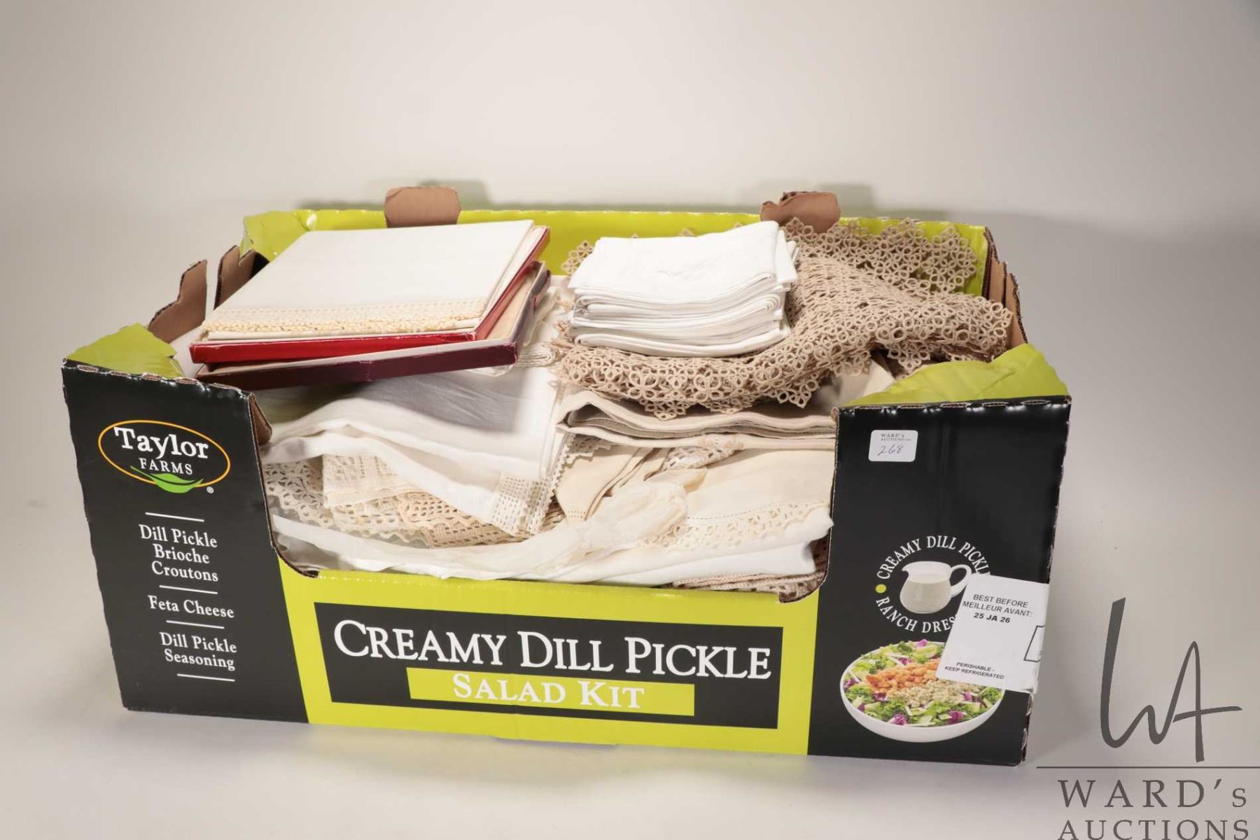 Large selection of vintage table linens including monogrammed napkins, tatted runners, tablecloths,