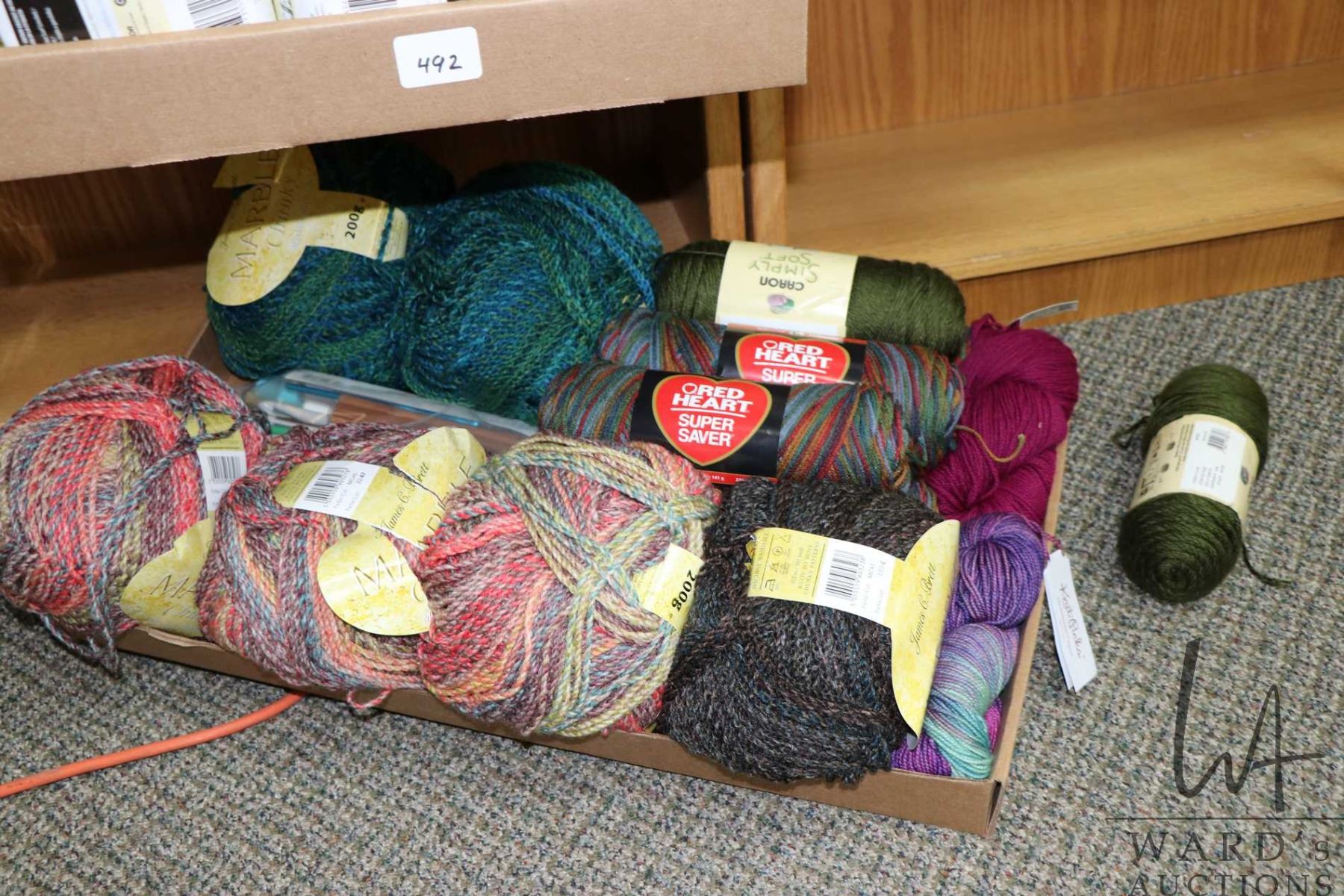 Large selection of wool/ yarn including six 200 gram balls of Marble Chunky, five 5 oz. Coats and Clark Red Heart Worsted No.4, Knit Picks 100 gram skein of sports weight 80% Superwash fine Highland wool, one 100 gram skein Berroco Vintage DK No.3 light and two balls of Caron Simply Soft Medium No. 4 plus a plastic caddy containing a multitude of crochet hooks