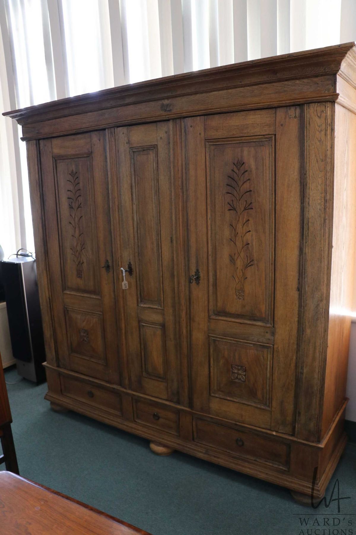 Large three door and three drawer European storage cabinet with carved raised panels, bun feet and m