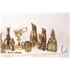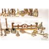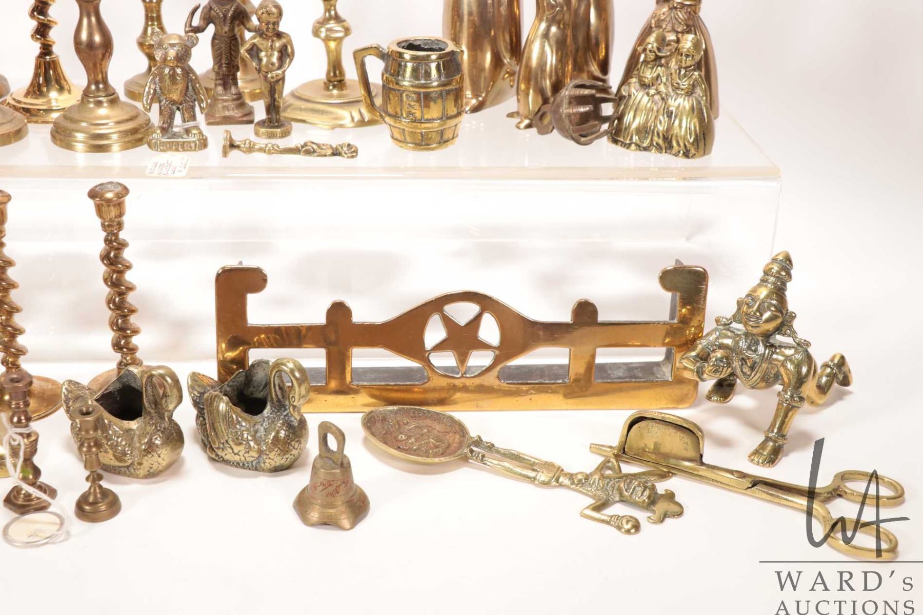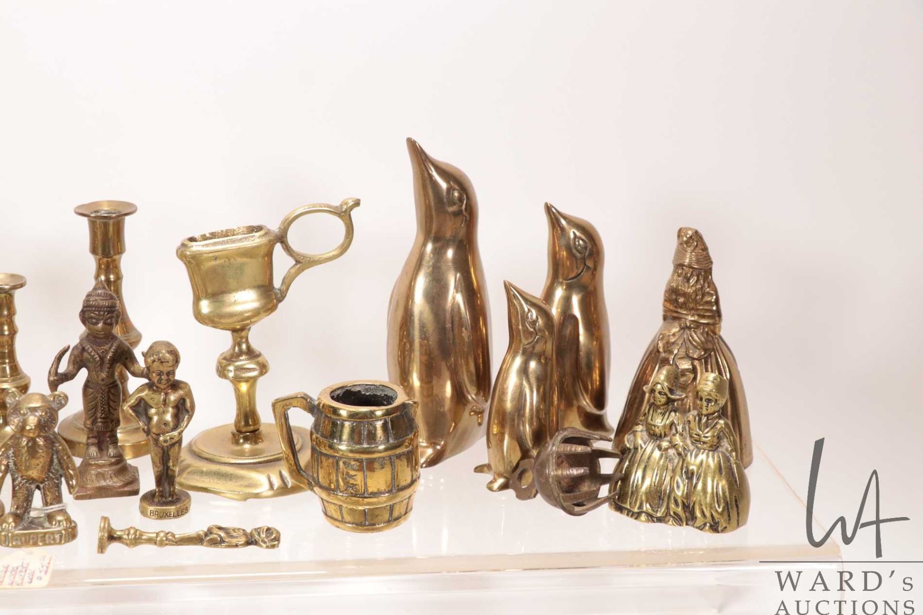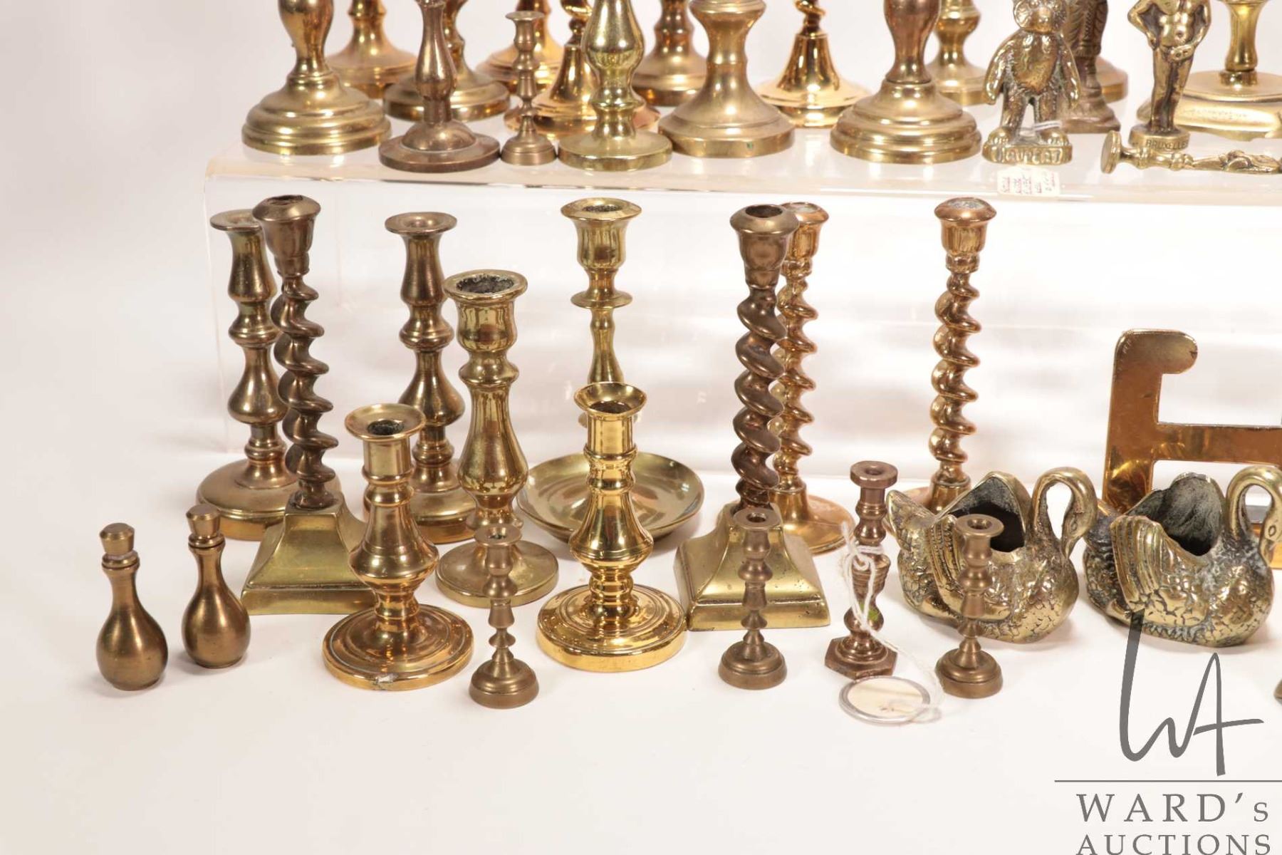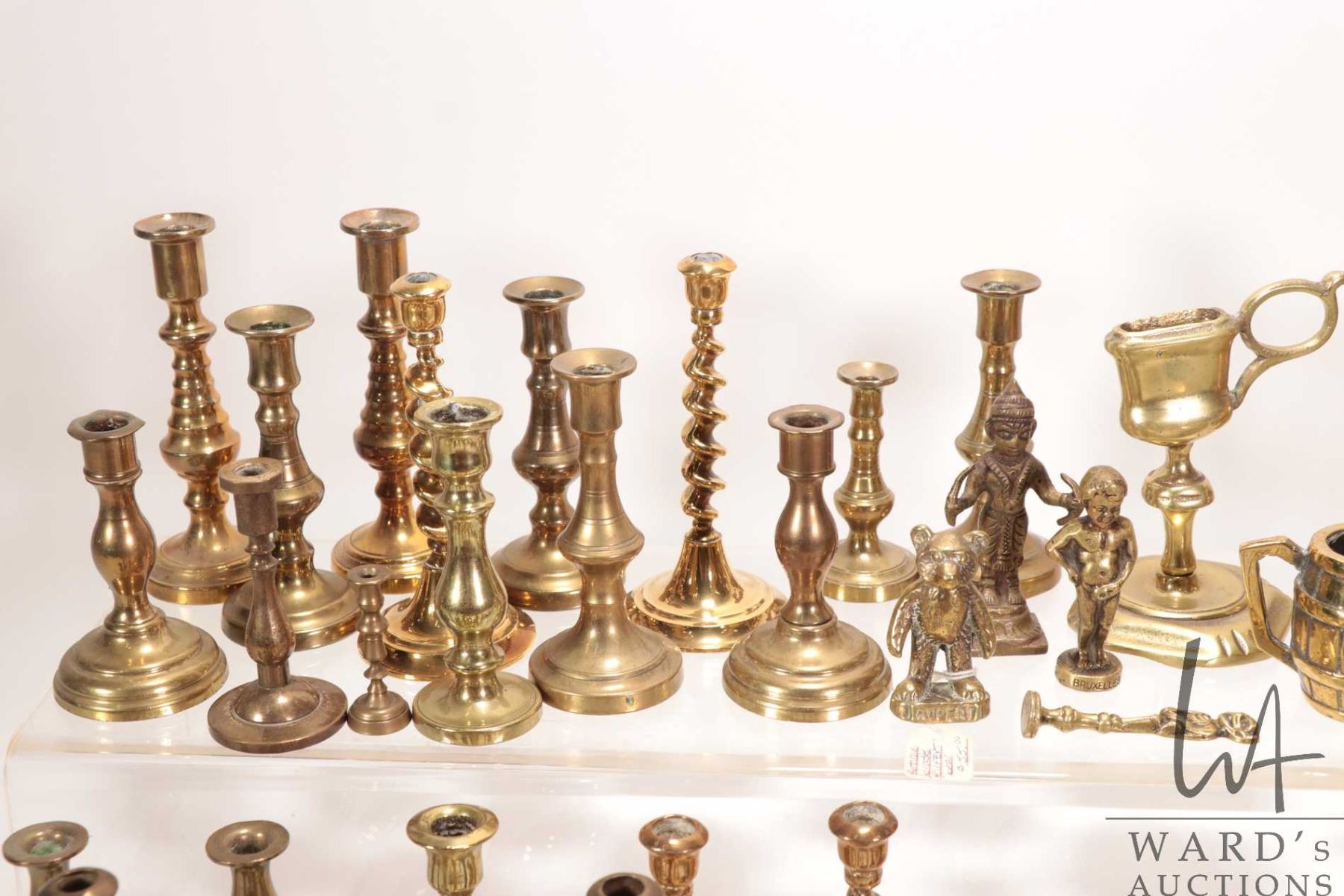 Large tray of brassware including candles sticks, candle snuffers, figures etc.