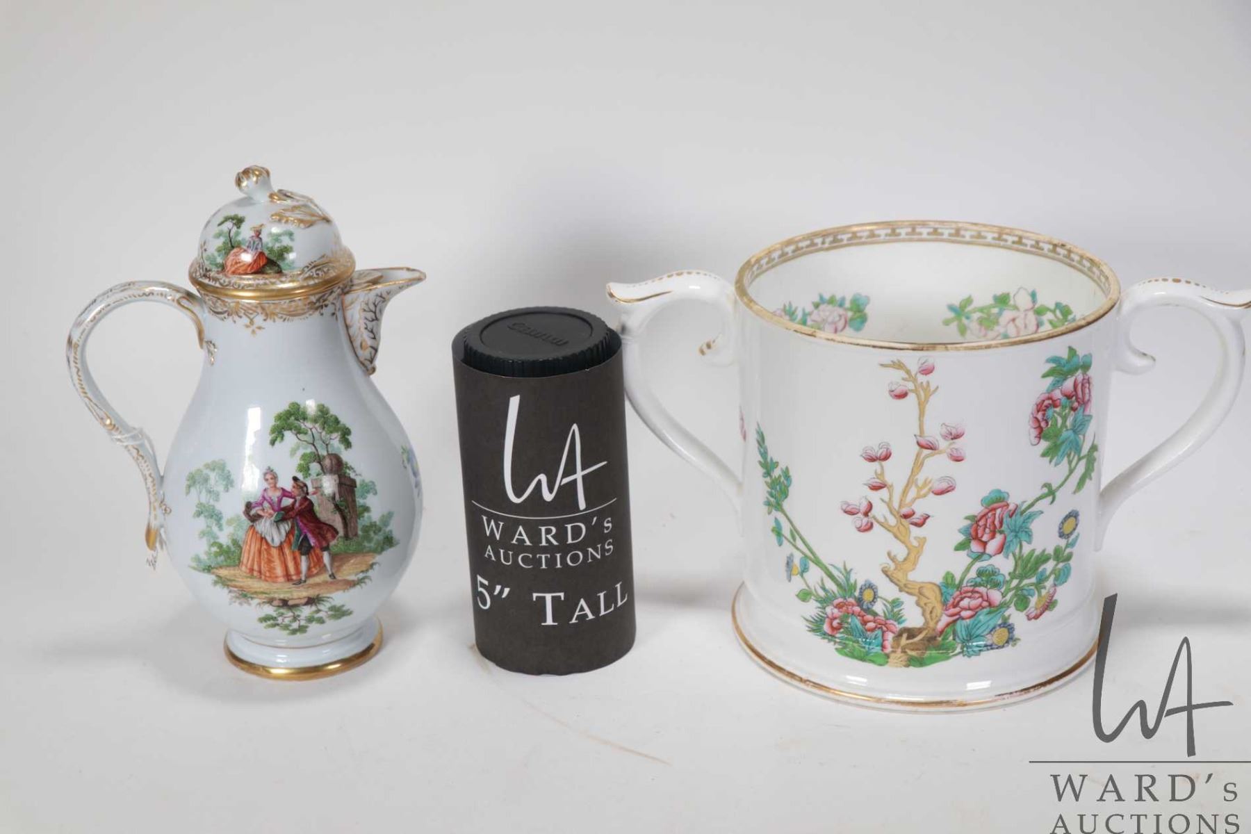 Large unmarked antique hand painted porcelain cup 6" high and a early Meissen cocoa pot with love story scenes and gilt decoration.