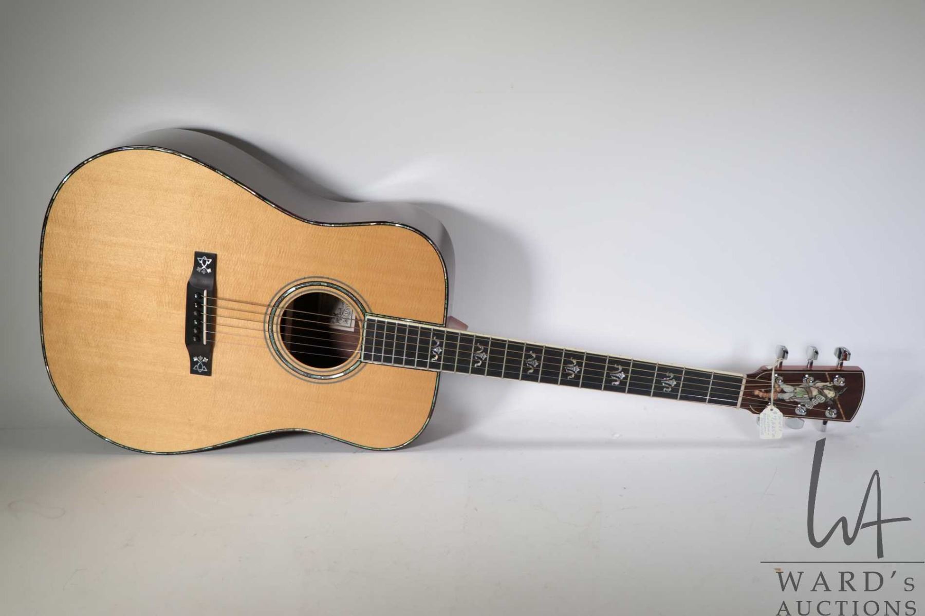 Larrivee D-10B acoustic six string custom guitar with Indian Rosewood body ( as per manufacturers website) , mahogany neck and Sitka spruce body front, plus abalone and pearl inlay "Robin Hood" inlay on the top of head and "Torch and Wing" inlay finger board. Serial number 18706. Appears virtually unused with original price still attached and original receipt. Purchased in 1998 at Alfie Myhre's Music Edmonton in 1998 for $6,500.00. Includes fitted branded Larrivee hard case and original manual