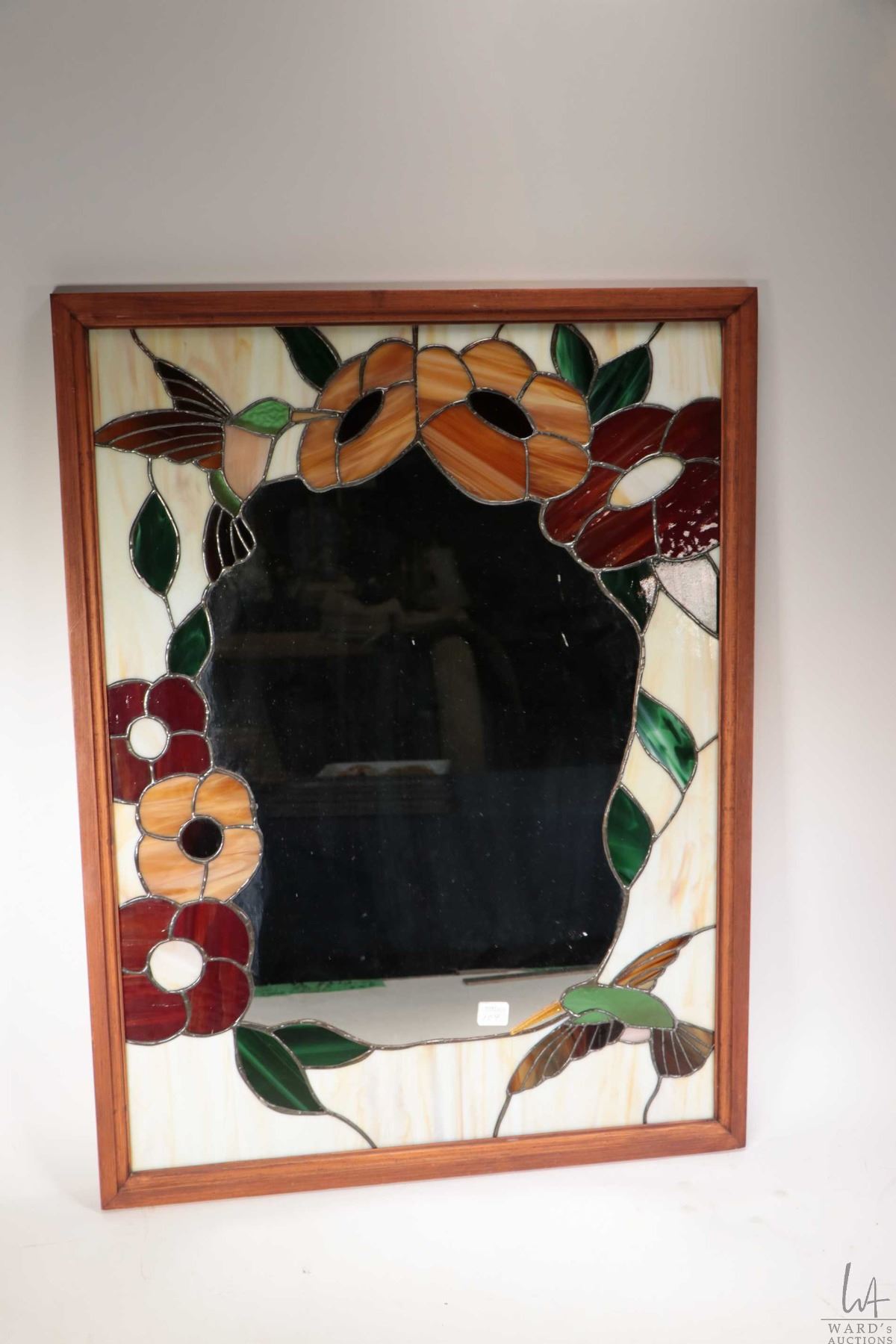 Leaded glass mirror, floral and hummingbird motif, overall dimensions 29" X 22"