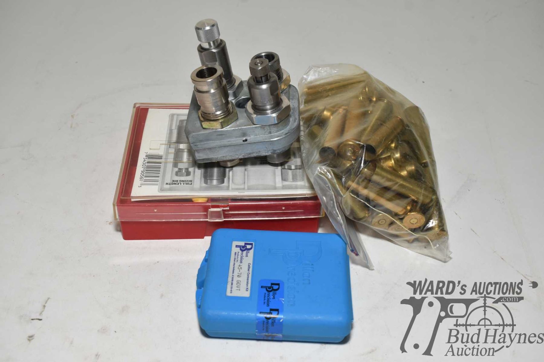 Lee .45-70 gov die set in Dillon tool block, caliber conversion kit and a 65 count bag of .45-70 gov brass