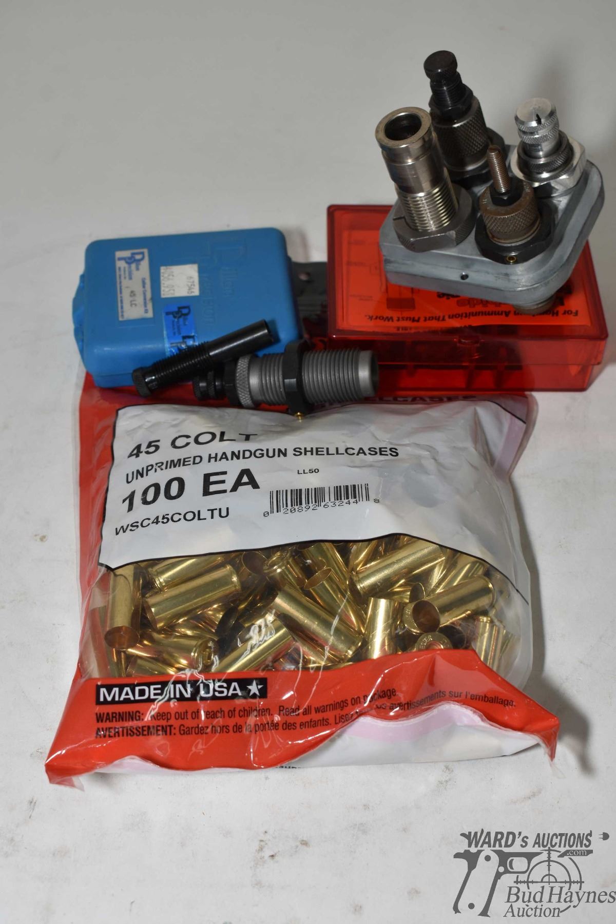 Lee .45 colt die set in Dillon tool block, caliber conversion kit and one full 50 count bag Winchester .45 colt unprimed brass