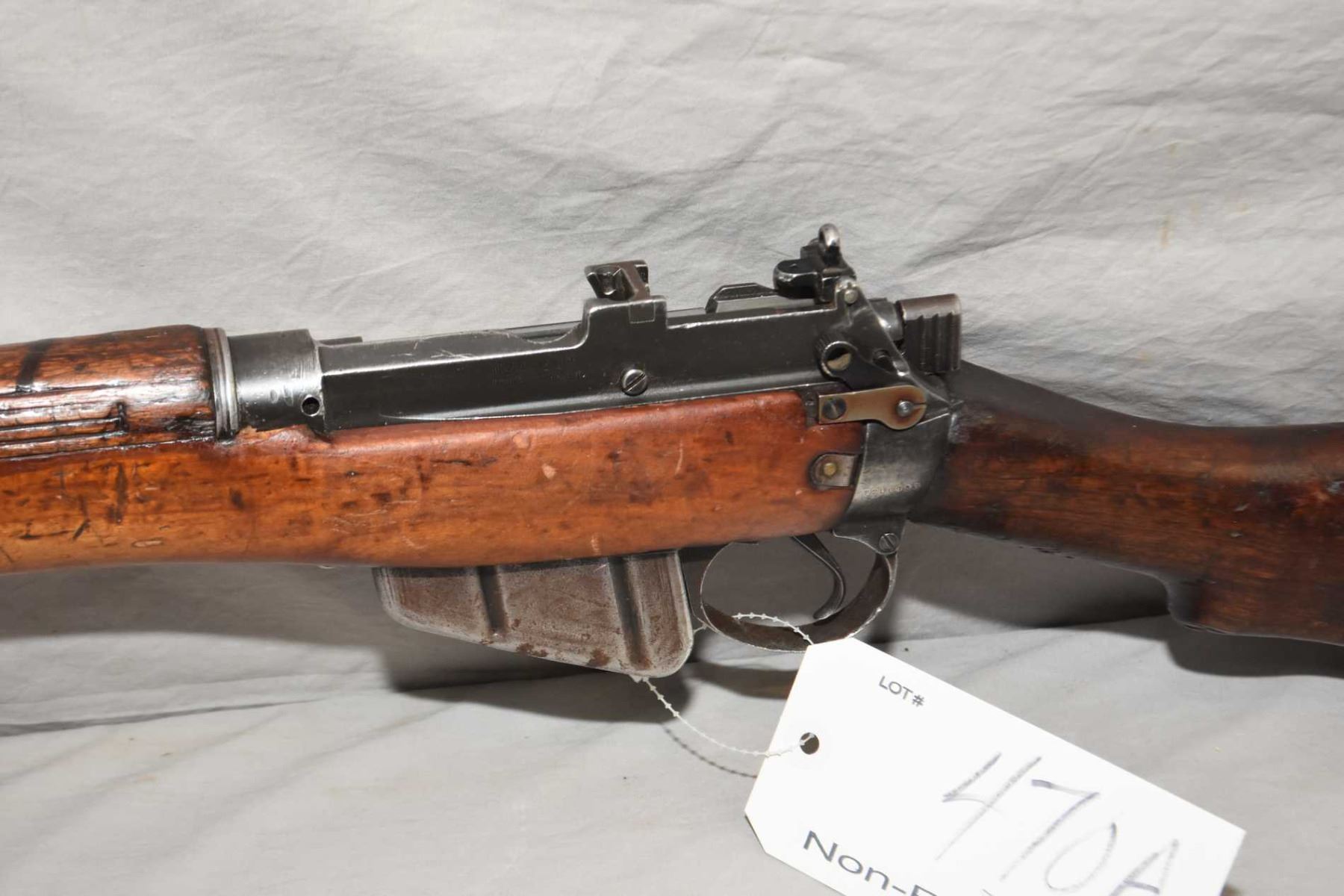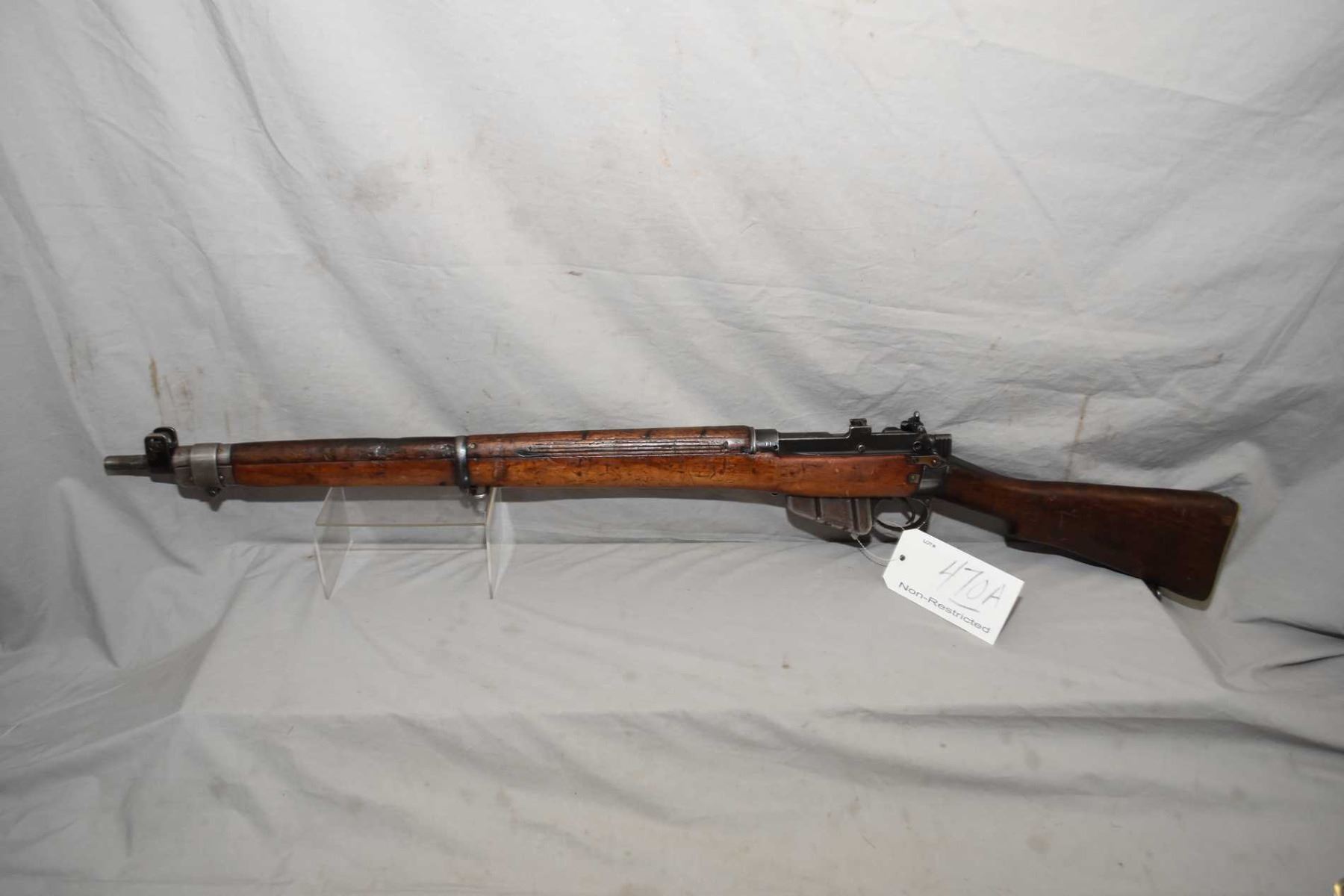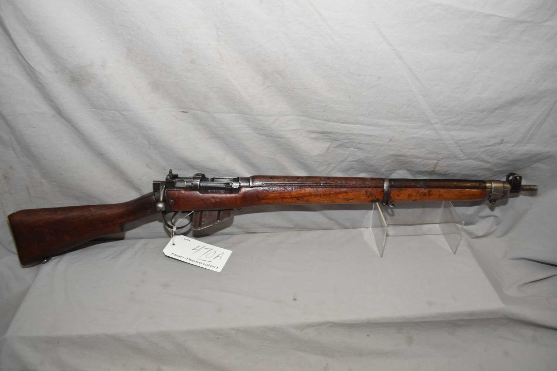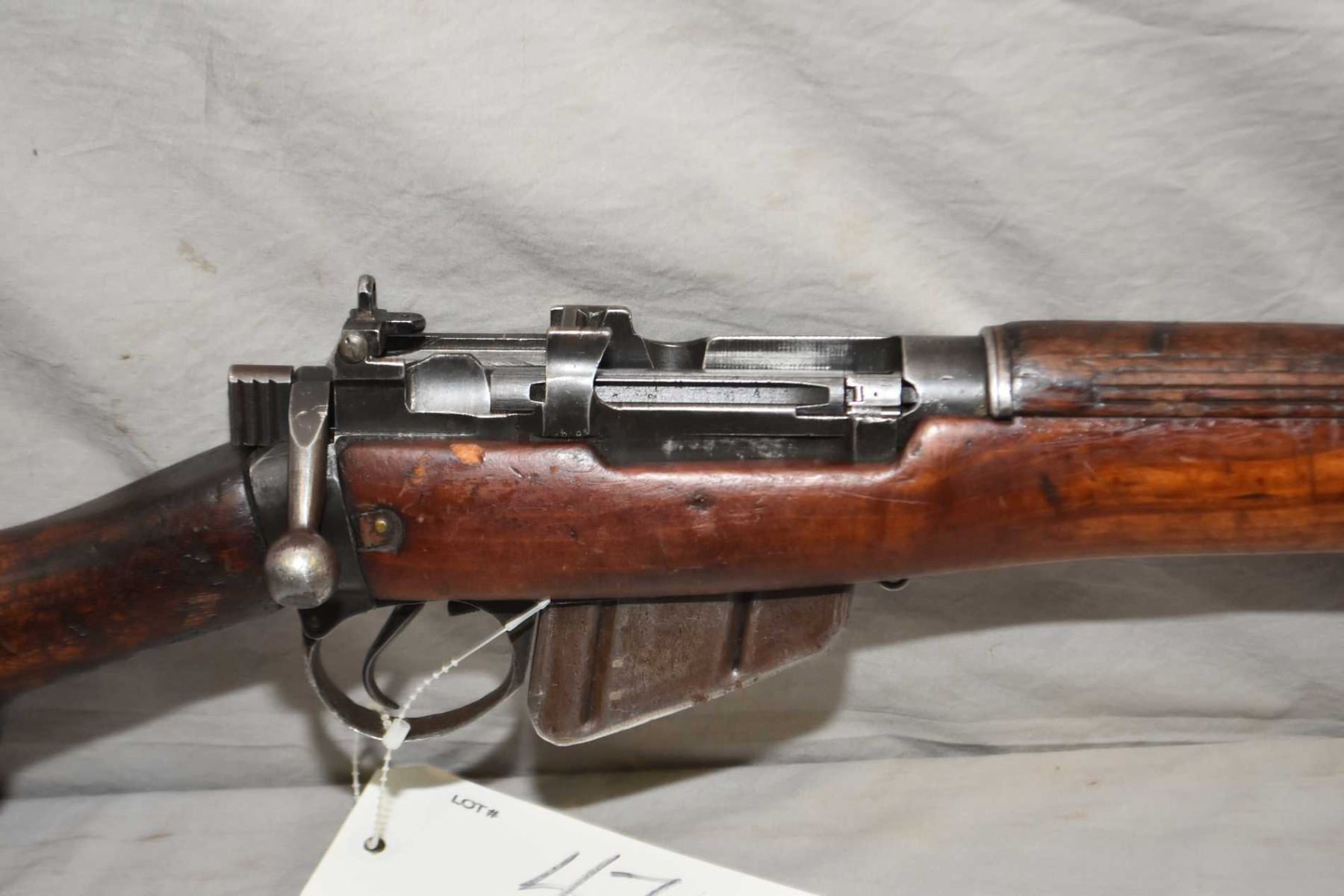 Lee Enfield ( Long Branch Dated 1943 ) Model No. 4 Mark 1* .303 Brit Cal Full Wood Bolt Action Mag Fed Military Rifle w/ 25 1/4" bbl [ fading blue finish to grey in some areas, and turning brown in some areas, full wood stock with various marks and gouges, non matching numbered bolt, brass butt plate, sling swivels, various marks and scratches to wood and metal ] Ser # 22L6983