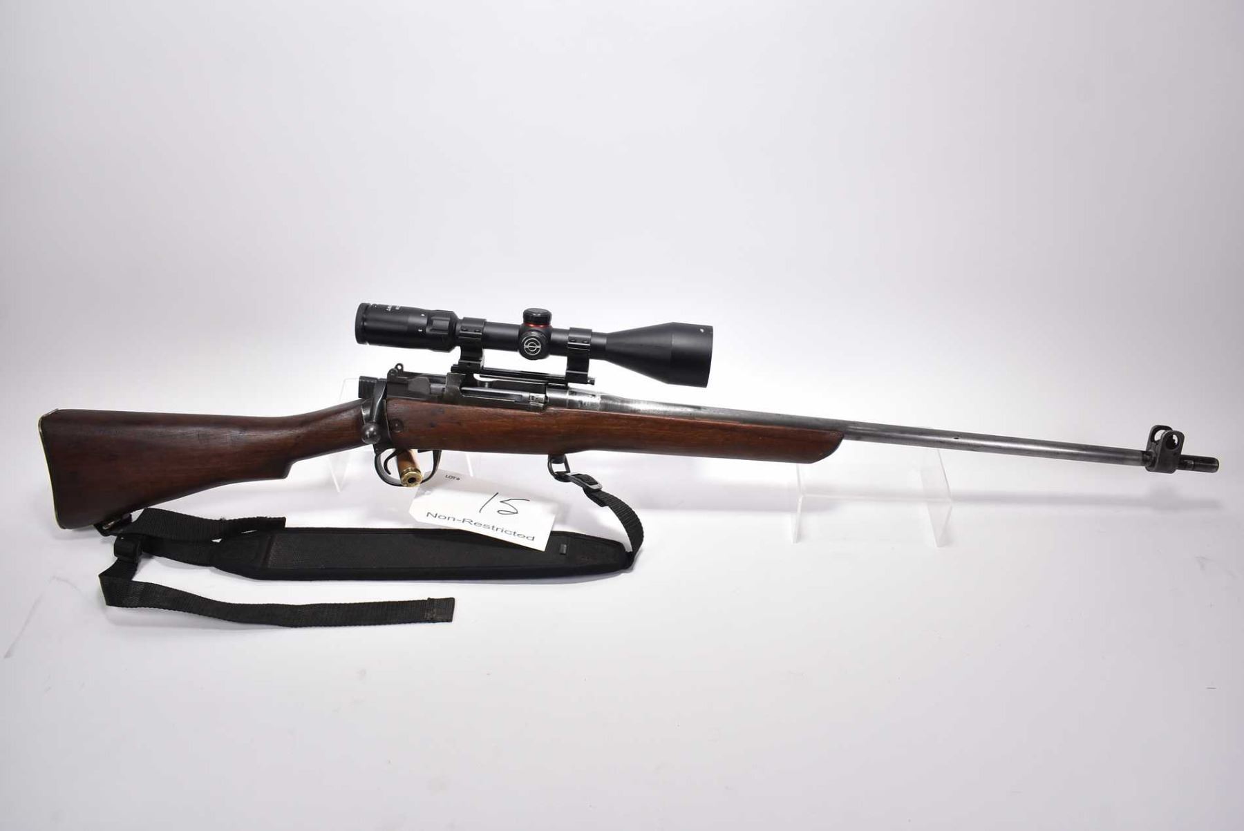 Lee Enfield ( Long Branch Dated 1950 ) Model No. 4 Mark 1* .303 Brit Cal Bolt Action Mag Fed Sporterized Rifle w/ 25 1/4" bbl [ fading blue finish, back sight removed, fitted w/ 3 x 9 x 50 8 - Point Variable Scope w/ rings and base, fair sporterized wood, w/ Butler Creek black sling, mismatched numbered bolt, various marks and scratches to wood and metal ] Note : missing the mag ] Ser # 95L5854