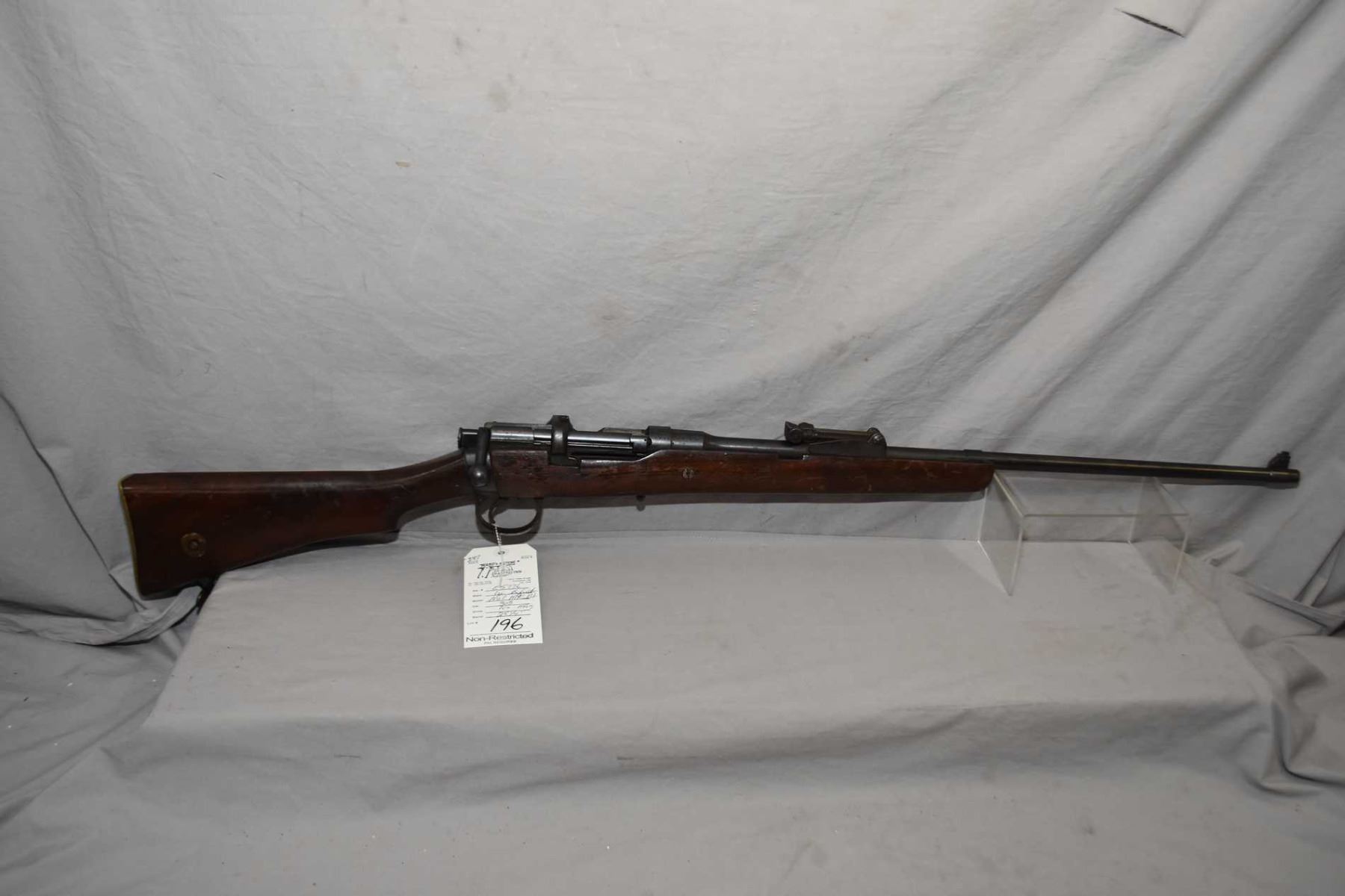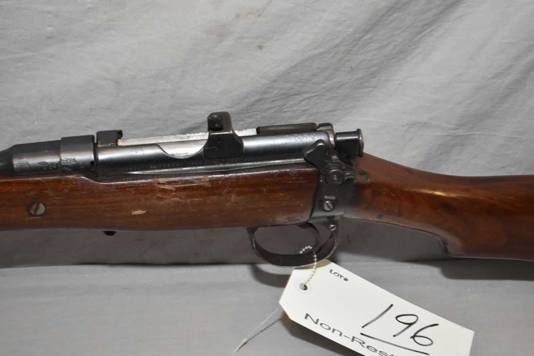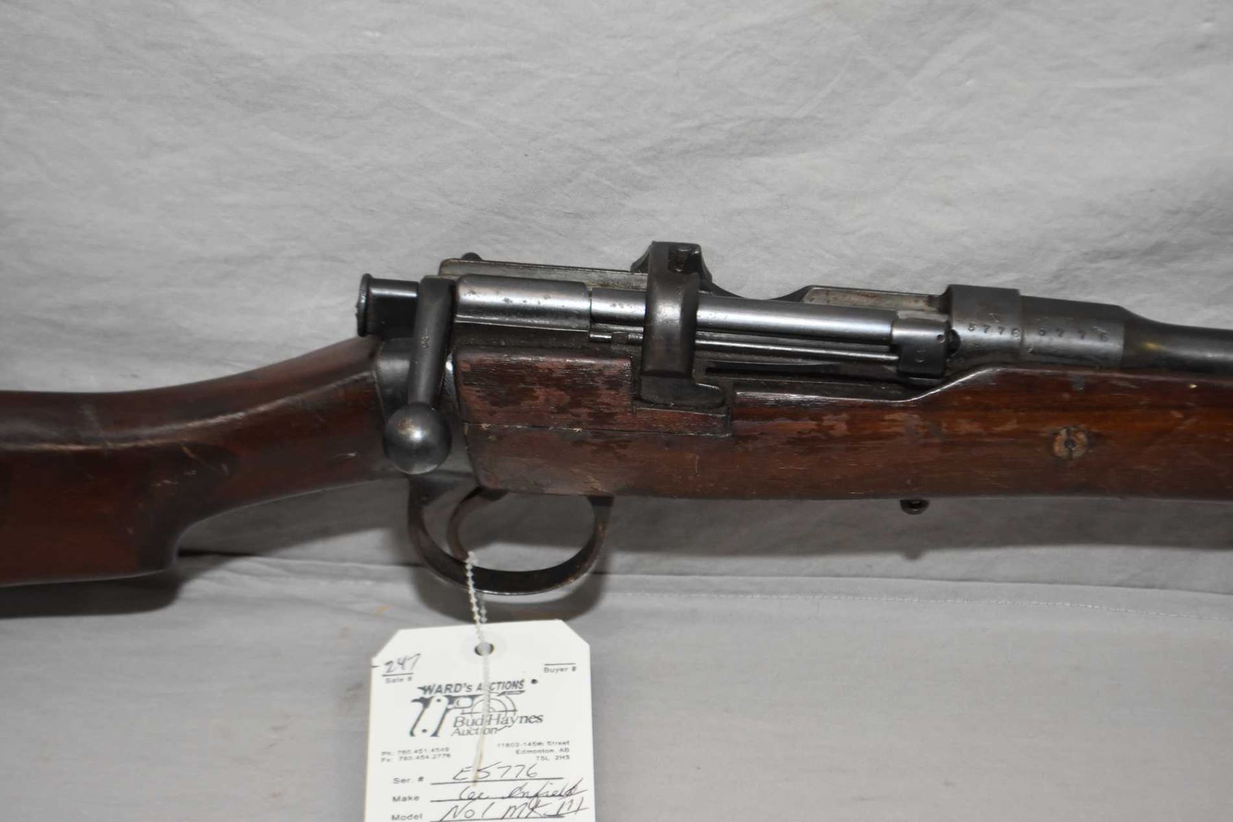 Lee Enfield Sht Le Dated 1912 No. 1 Mark III .303 Brit Cal Mag Fed Bolt Action Sporterized Rifle w/ 25 1/4" bbl [ fading blue finish with some marks and scratches, matching numbered bolt, barrel sights, some rust to metal, sporterized wood, with crack in front of right side receiver, rear sling swivel , Note : Missing the Mag ] Ser # E5776