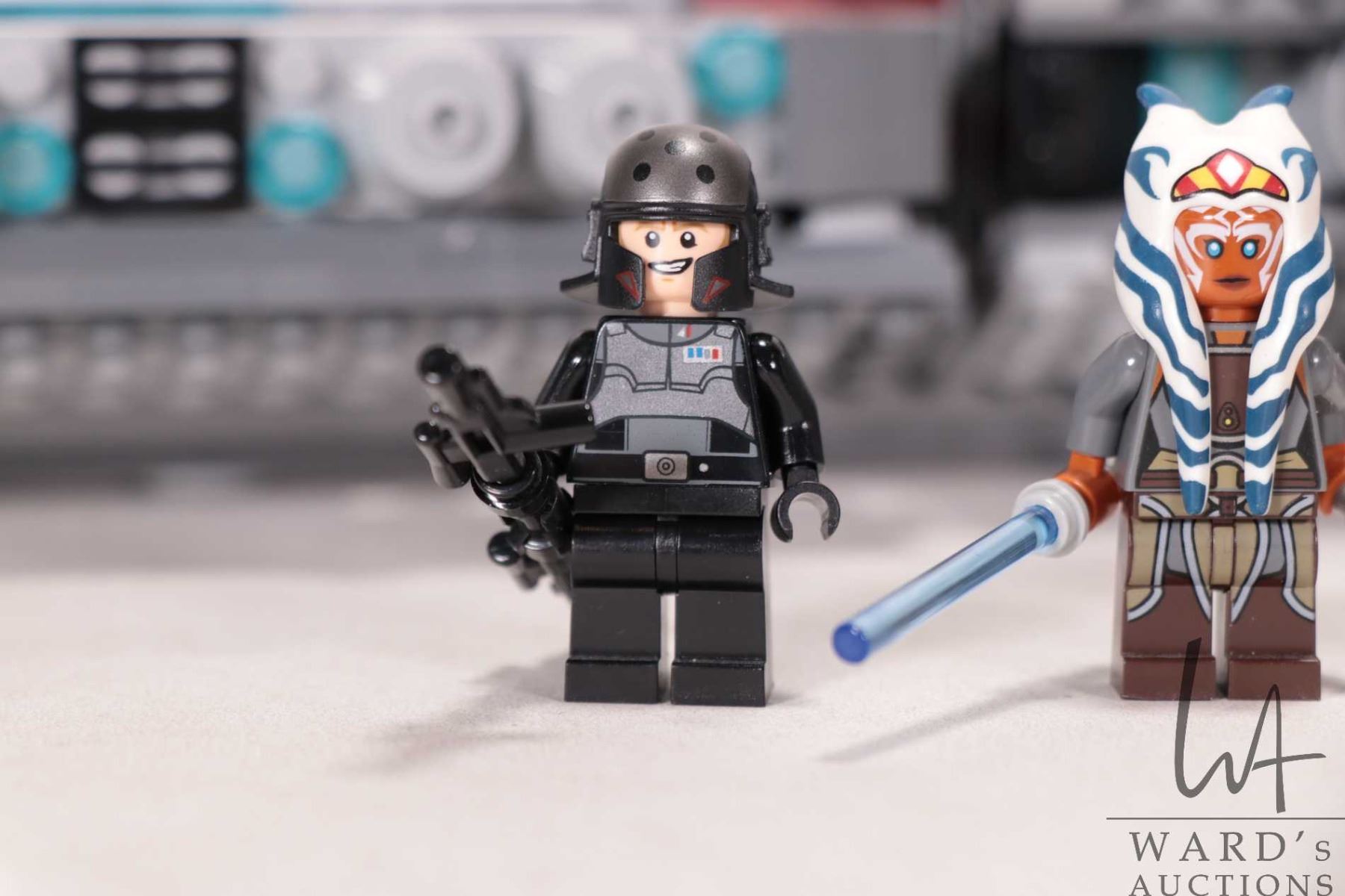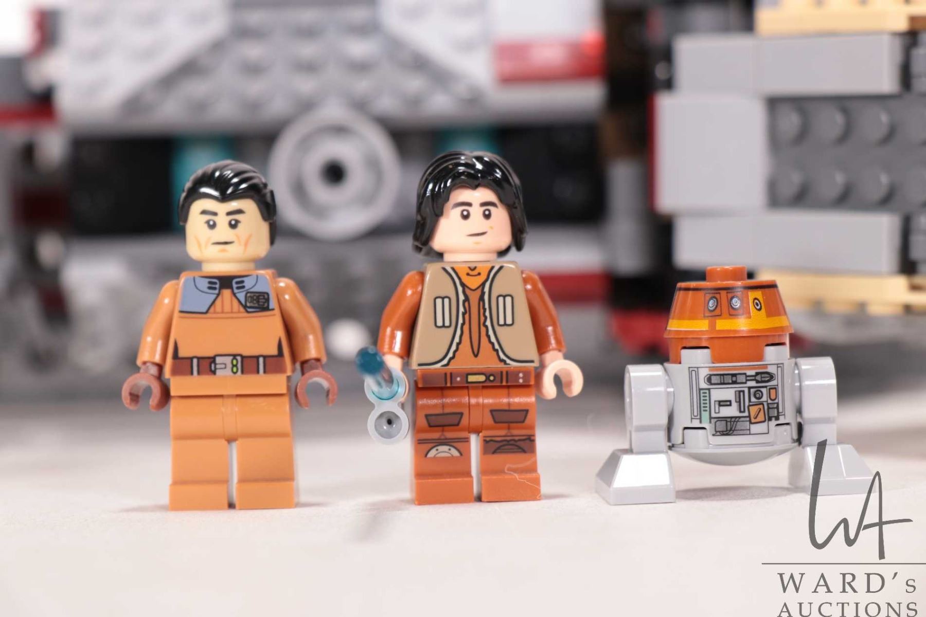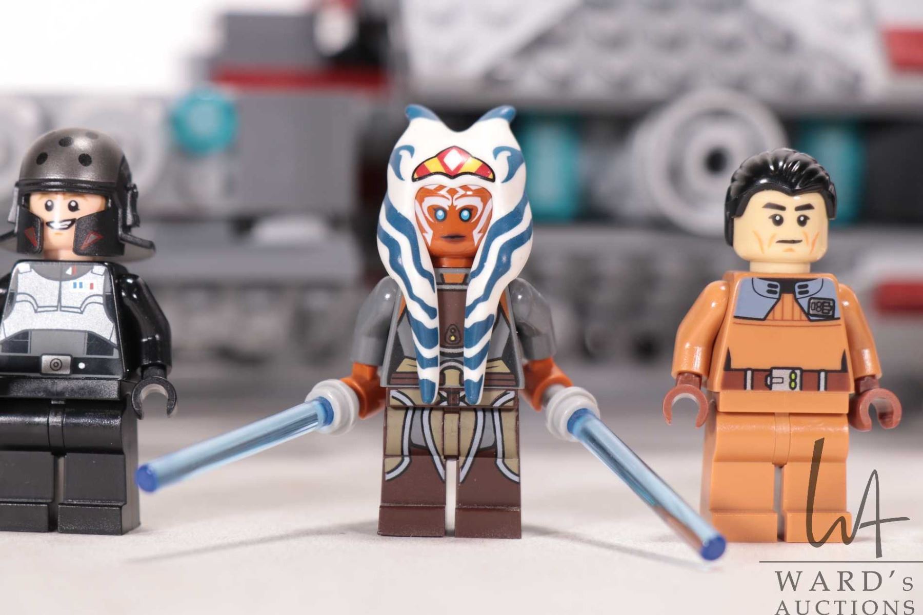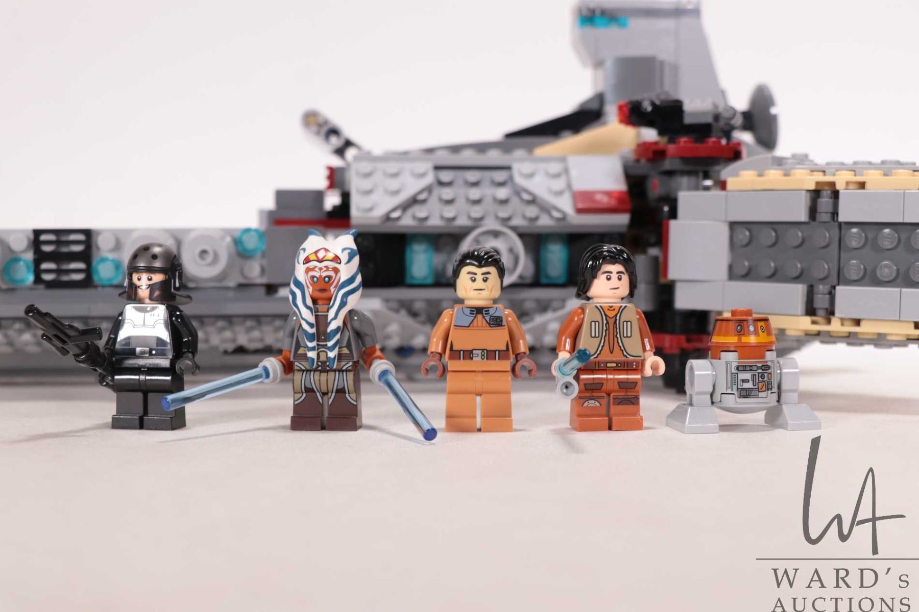Lego "Star Wars" set no. 75158 Rebel Combat Frigate, vehicle appears complete, or near complete, with figures including Ahsoka Tano (adult), Agent Alexsandr Kallus, Chopper, Commander Sato, and Ezra Bridger. Completeness not guaranteed