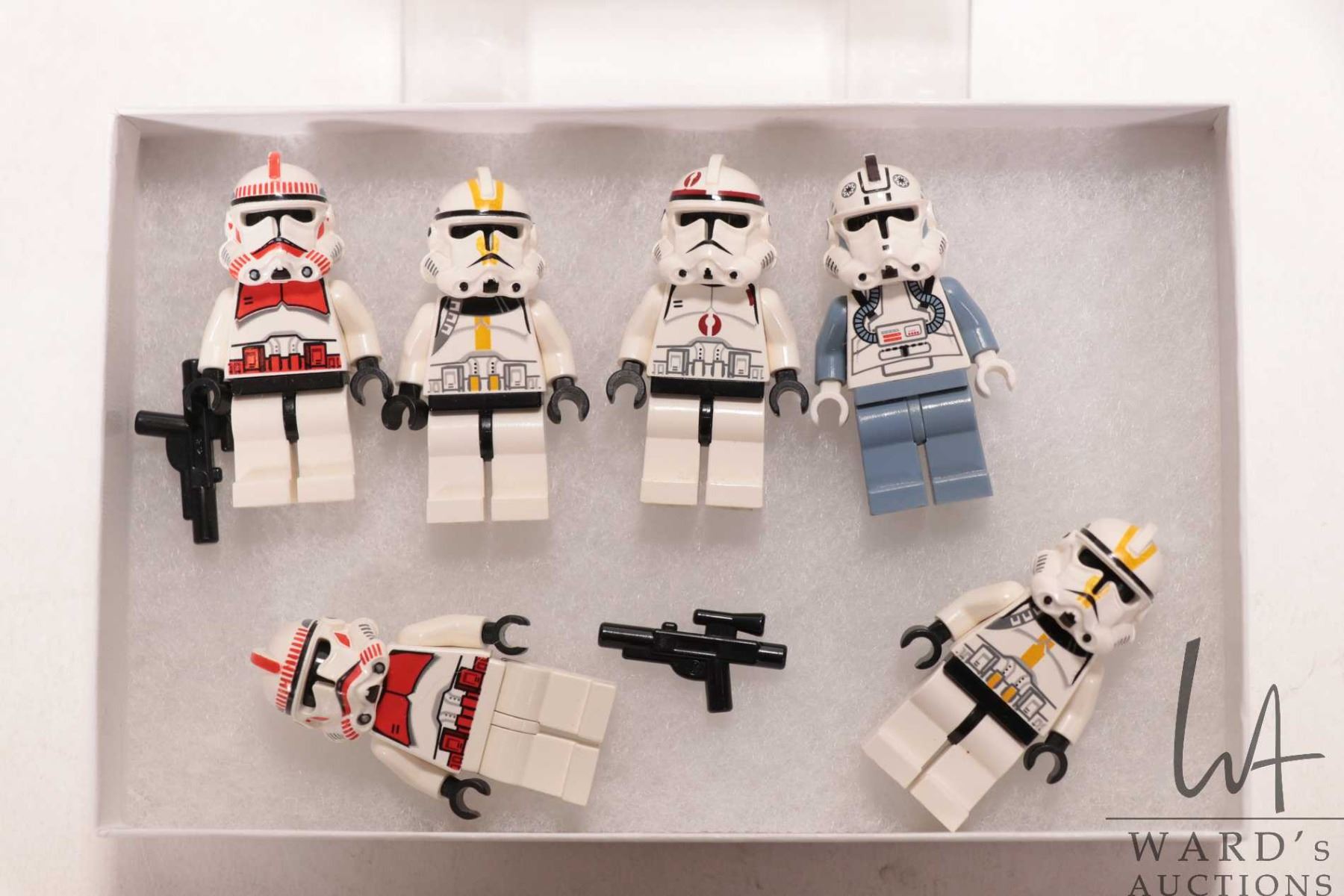 Lego "Star Wars" six mini Storm Trooper figures including yellow and red markings