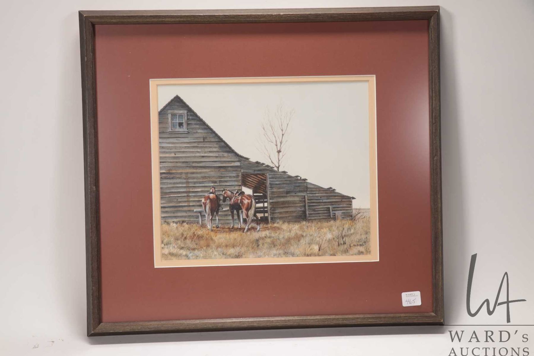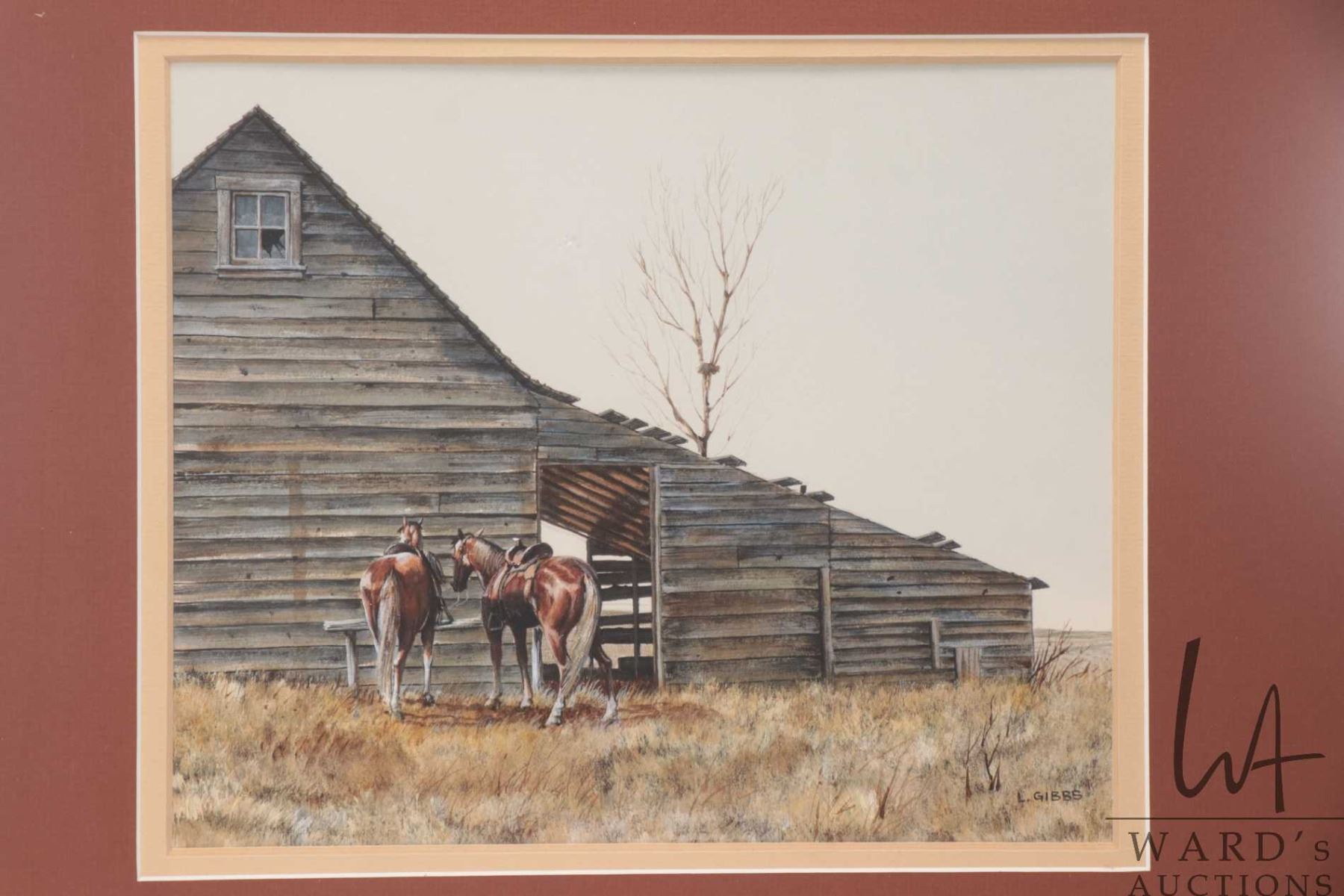 Len Gibb, framed original watercolour painting, titled on verso " Shasta and Dolly, L.J. Gibbs, Location-Sketch Trip in Antelope Country Near Cereal, Alberta, Painted July. 1970", 9 1/4" X 11 1/4"