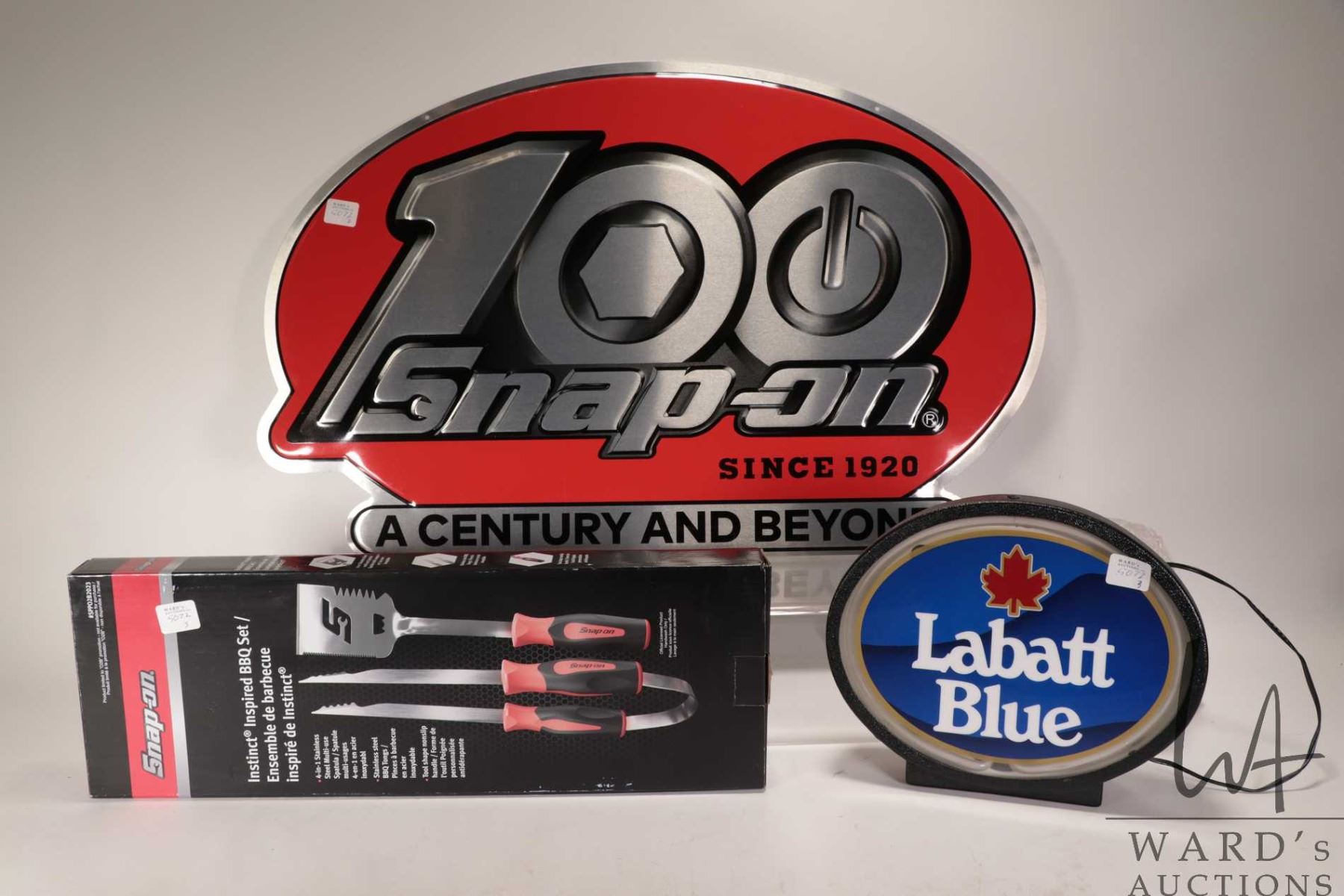 Light up Labatt's Blue sign, a two piece Snap-on barbecue set and a Snap-on 100 years sign