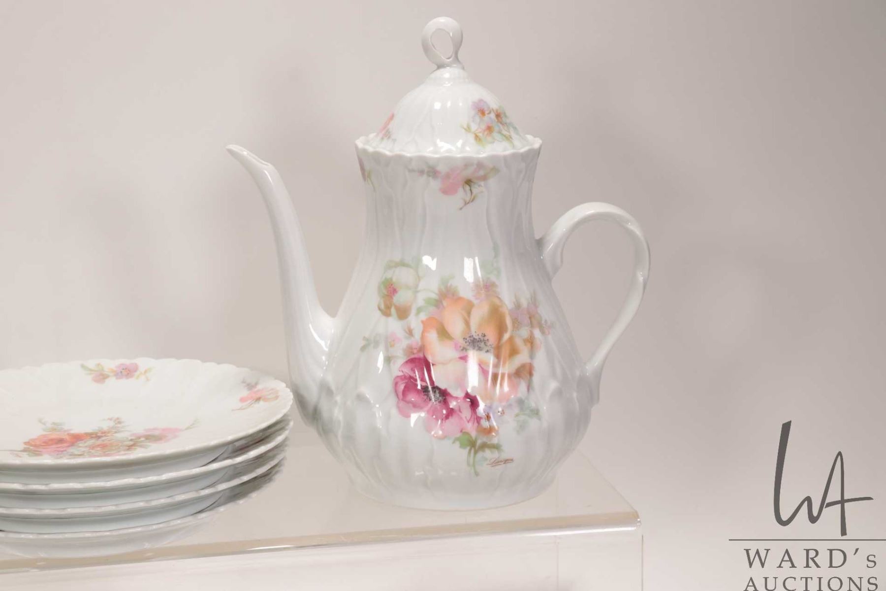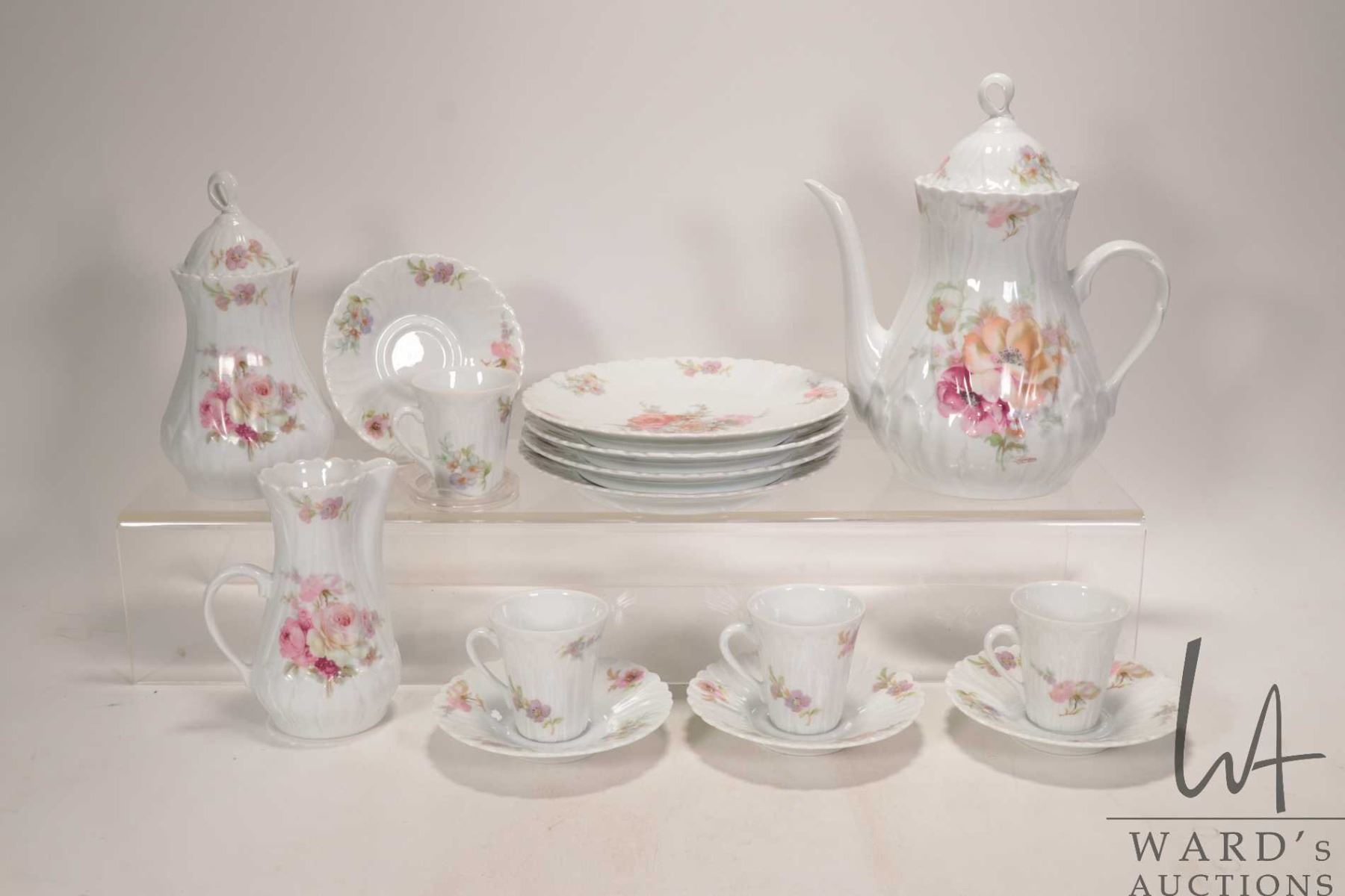 Limoge coffee set with coffee pot, cream and lidded sugar and four snack plates and four demis and saucers