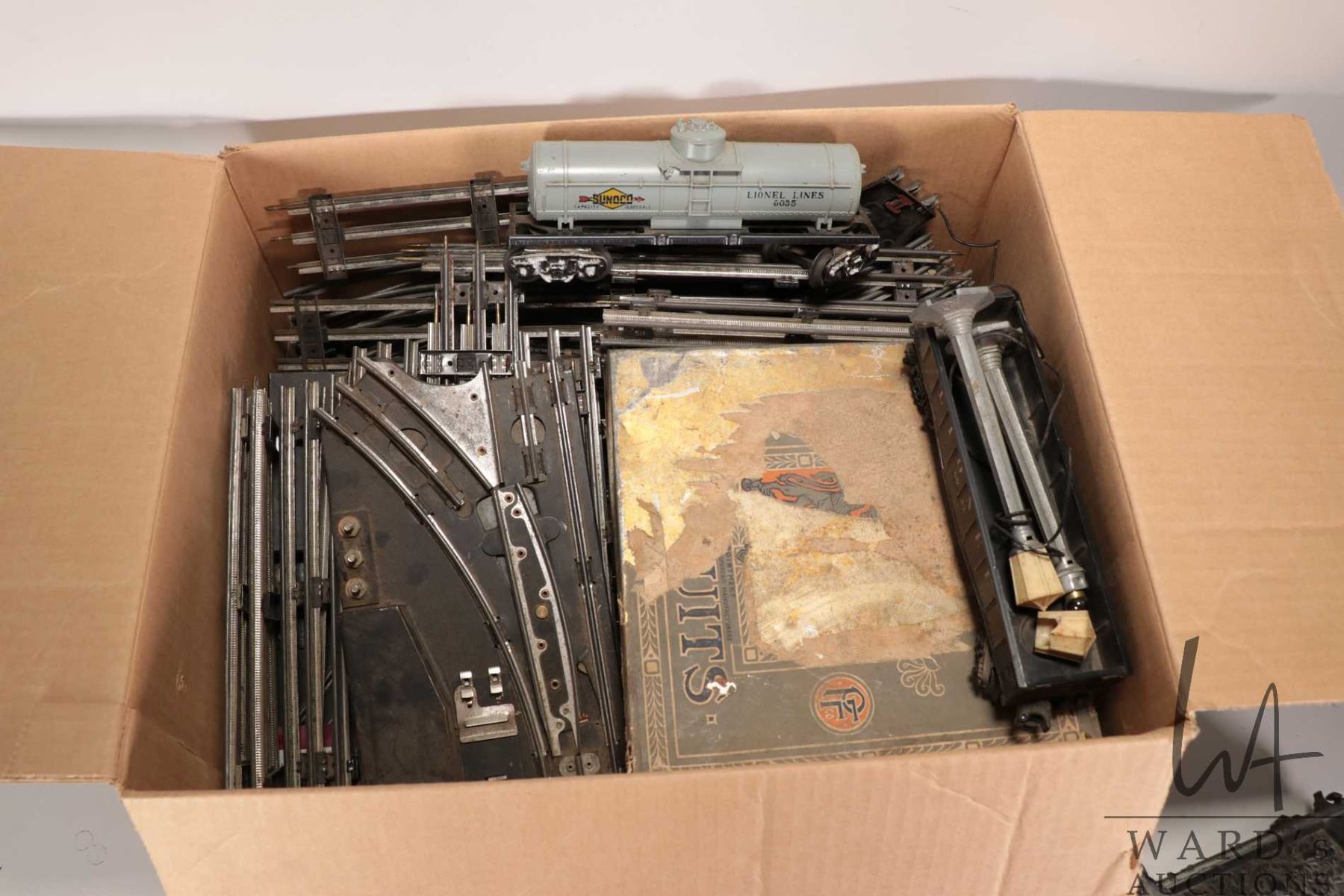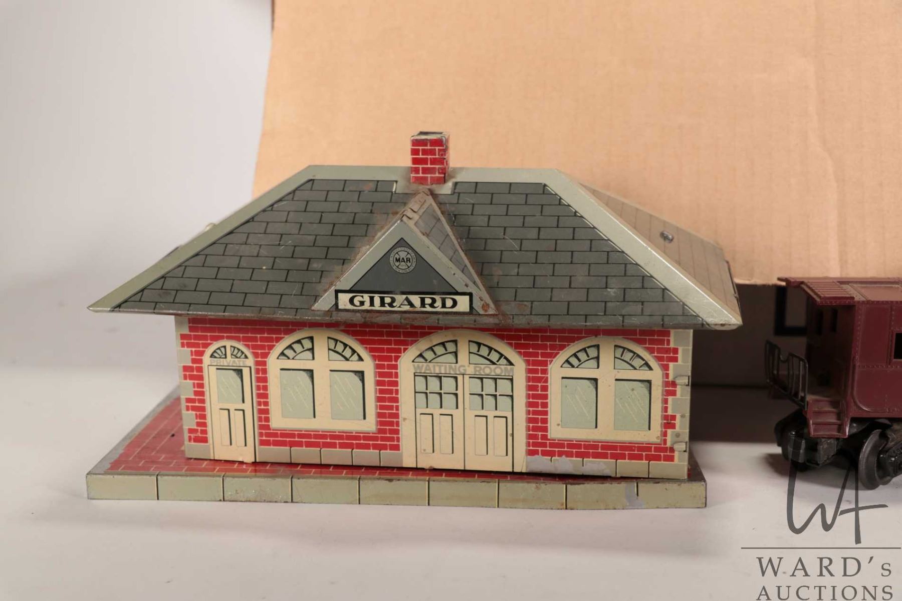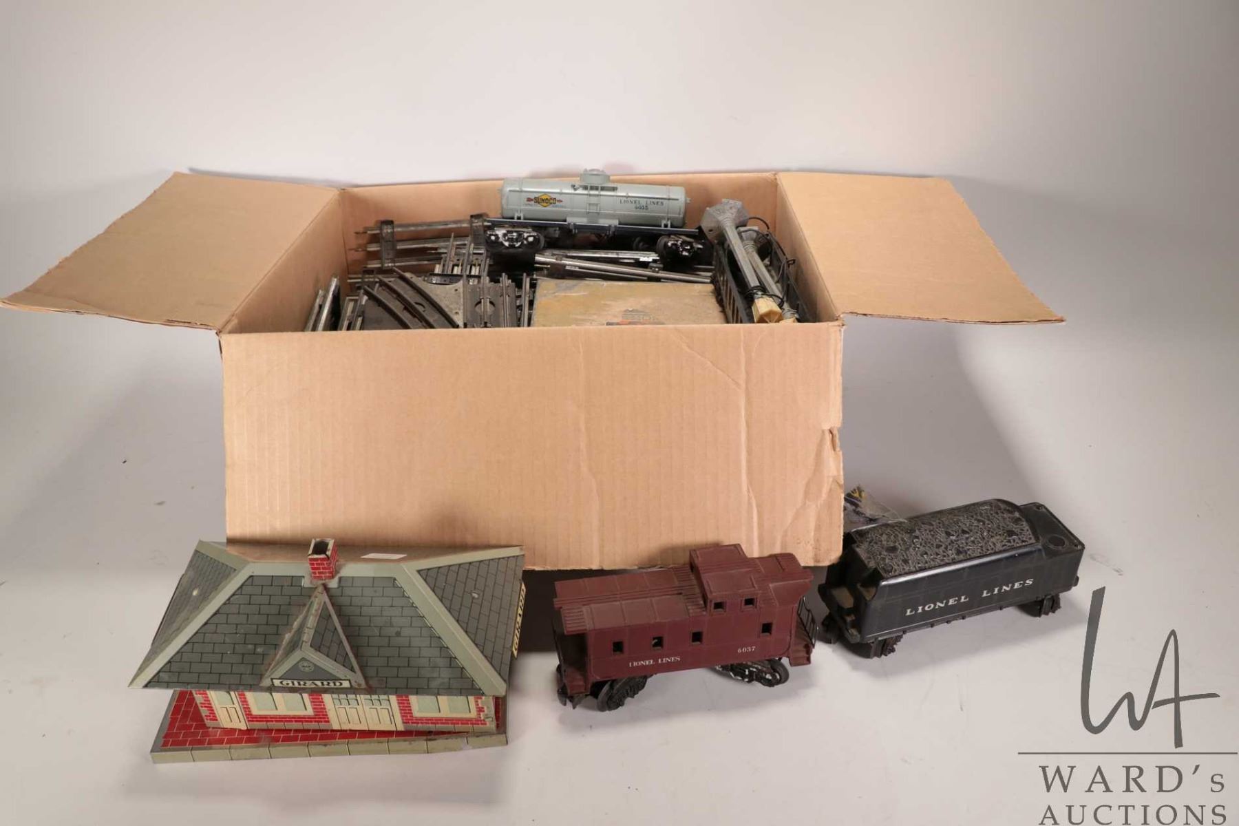 Lionel Train set including multi control "TRAIN master" power supply, four rolling stock a selection of track plus Girard pressed steel building, nothing tested at time of cataloguing