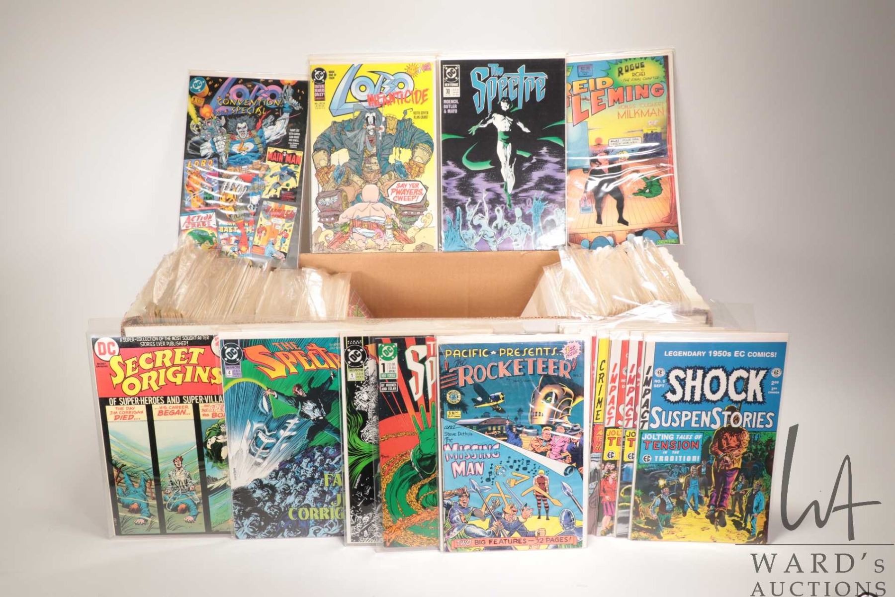 Long box of comics including "The Spectre", "Lobo", "Reid Fleming", "Weird Science, etc.
