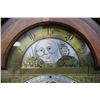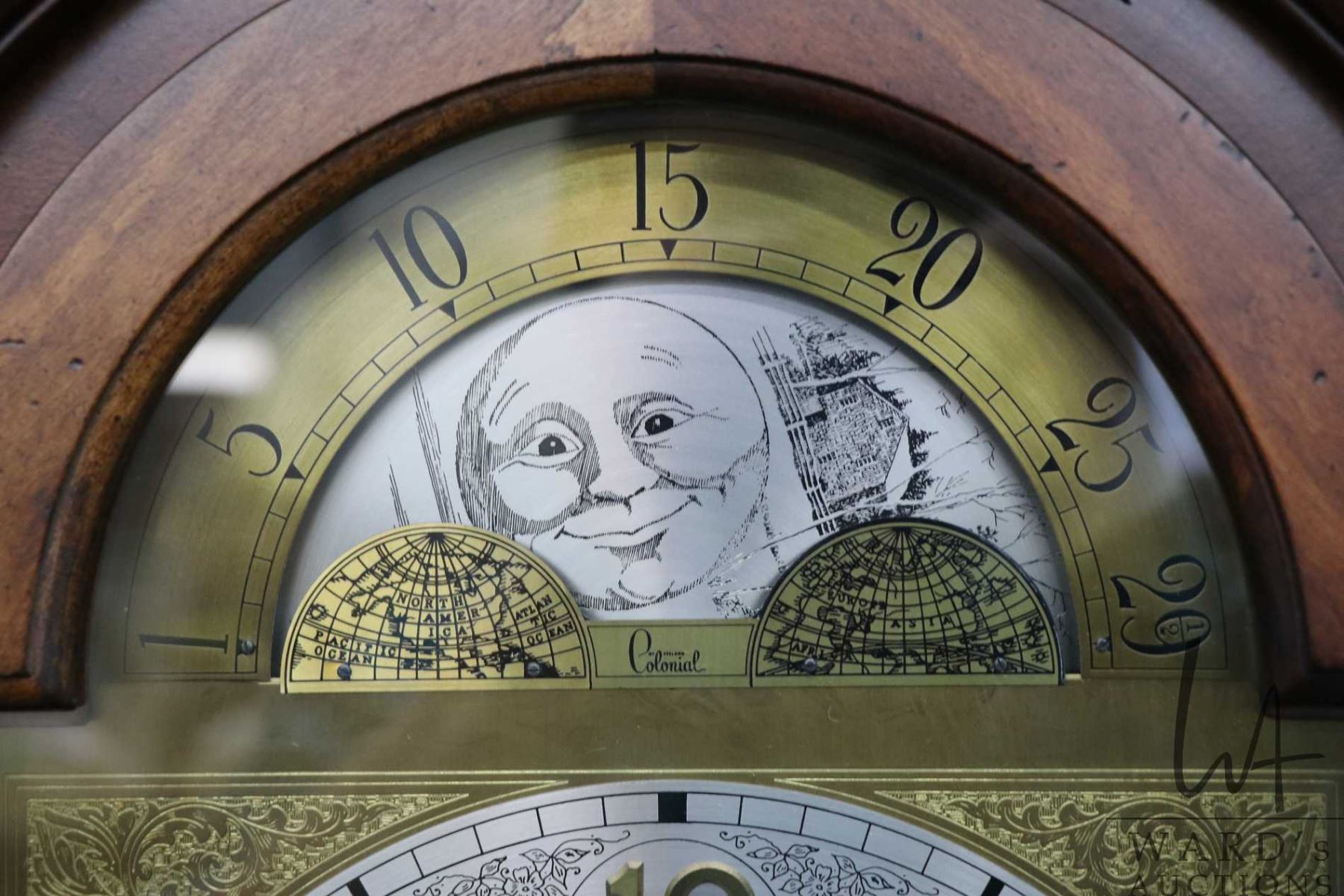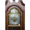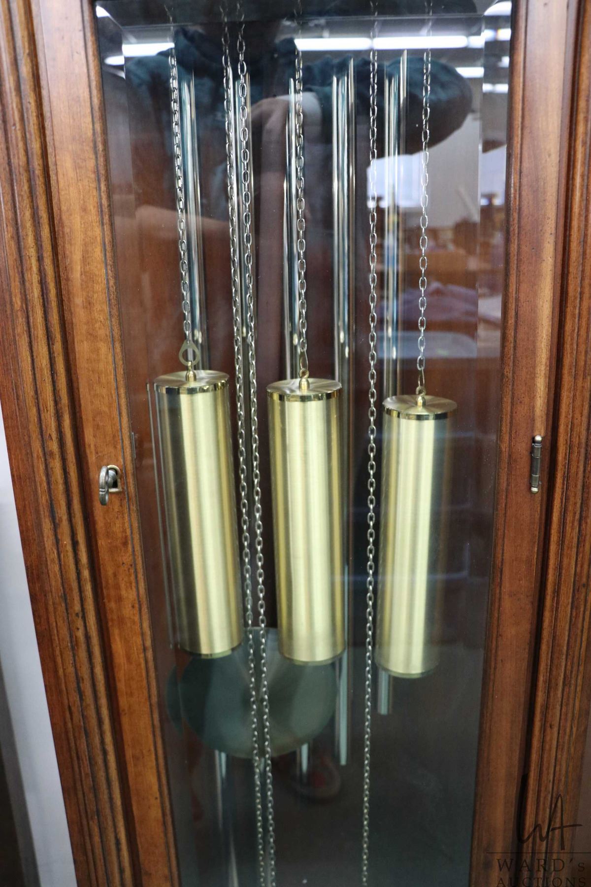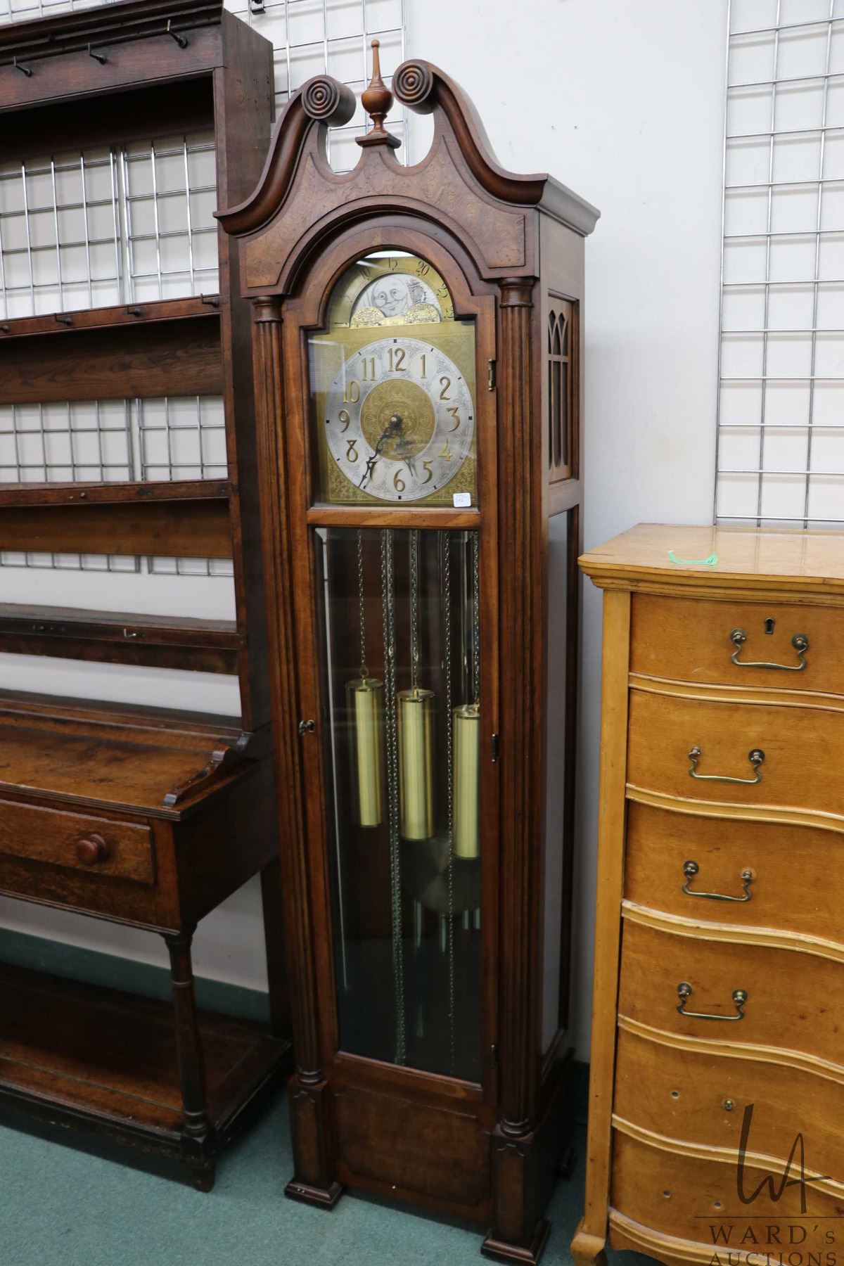 Long case clock in wooden cabinet with swan neck frieze, visible pendulum and brass and stainless face with phases of the moon and tubular chime, working at time of cataloguing, 78" in height