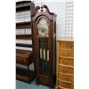 Long case clock in wooden cabinet with swan neck frieze, visible pendulum and brass and stainless fa