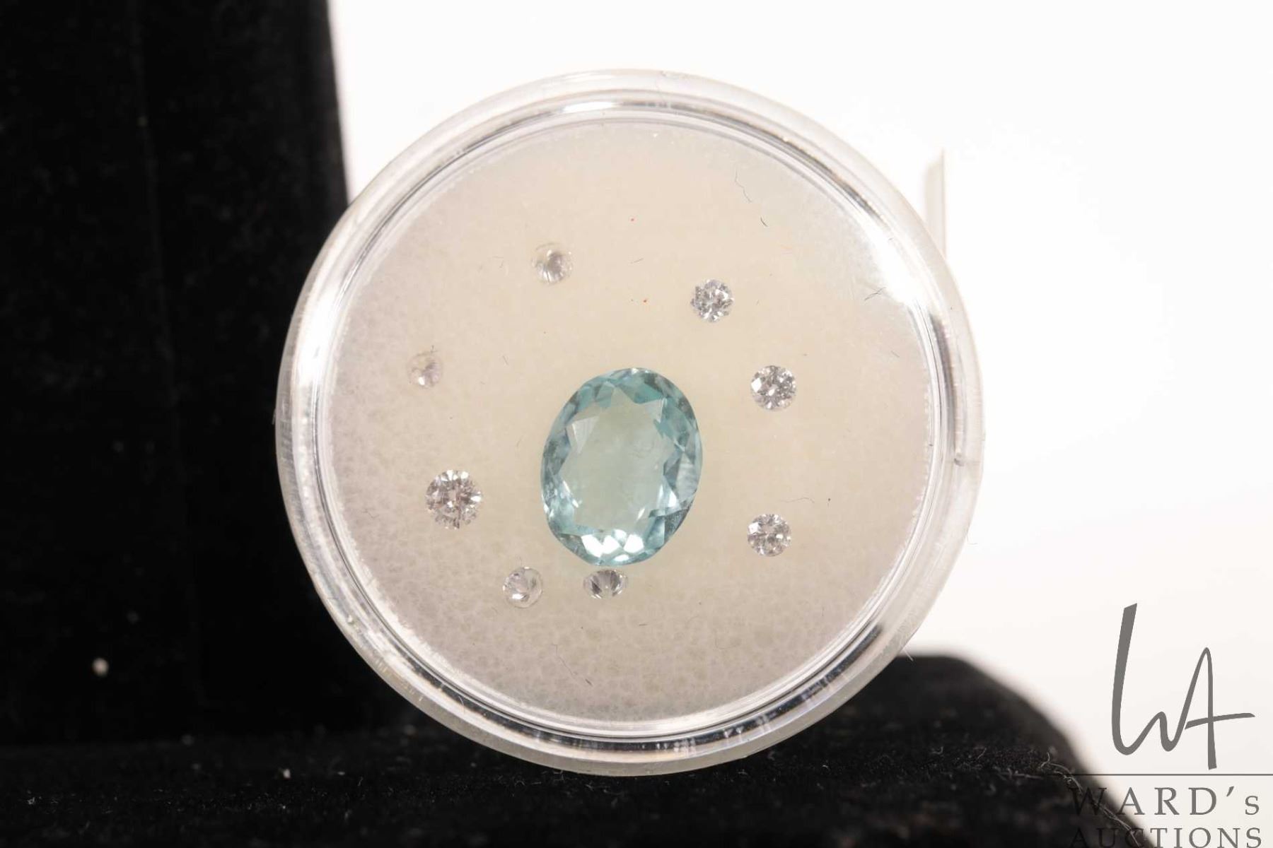Loose citrine/ aqua blue oval cut gemstone and eight small gemstones that test as diamond