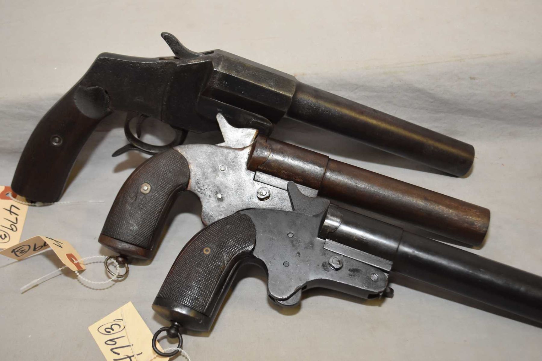Lot of Three 1" Flare Launchers [ one marked 6A in a rectangle # 63 checkered blue with checkered wooden grips - one marked SA turning brown with checkered wooden grips - one marked B & E Ser # 3548 with wooden grips ] NO PAL REQ