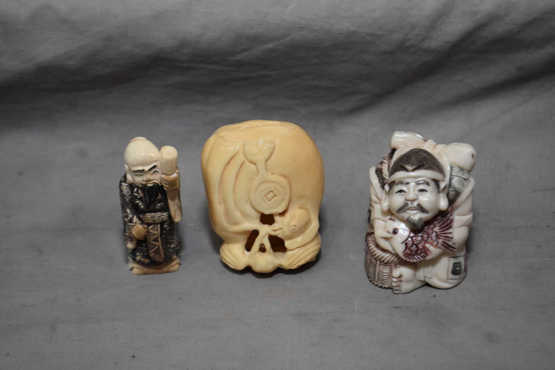 Lot of Three Carved Netskes [ Oriental Fisherman w/ basket - Oriental Man - Oriental Fish & Carved Letters ]