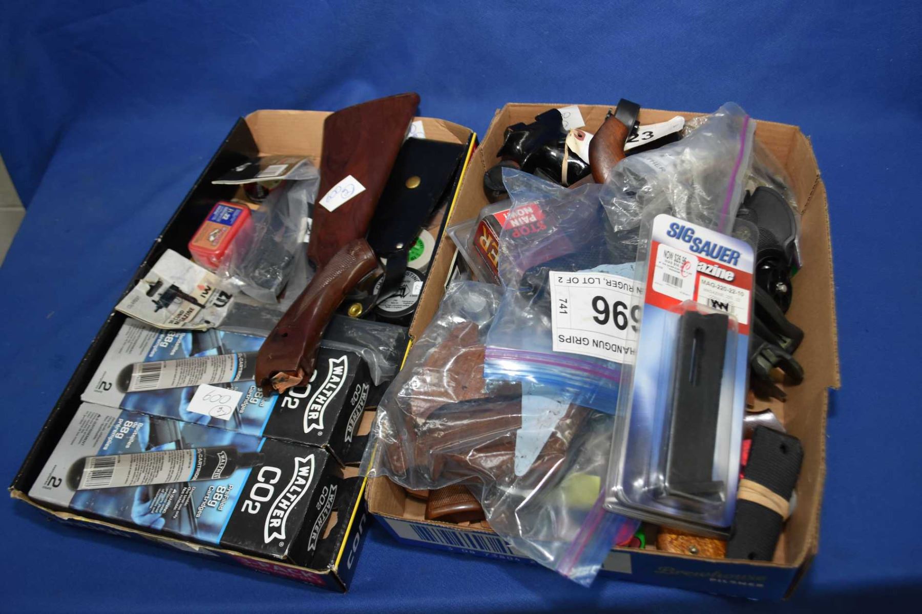 Lot of Two Boxes : Hand Gun Accessories Includ : Over Thirteen Sets of Grips - Speed Loaders - Plus Sig Mag - 2 Sets of Limb Saver Hand Gun Grips - Walther C02 Ctgs - Pellets - Nylon Stock for BB Gun - Air Soft Mag - Walther Accessories for PPQ etc.