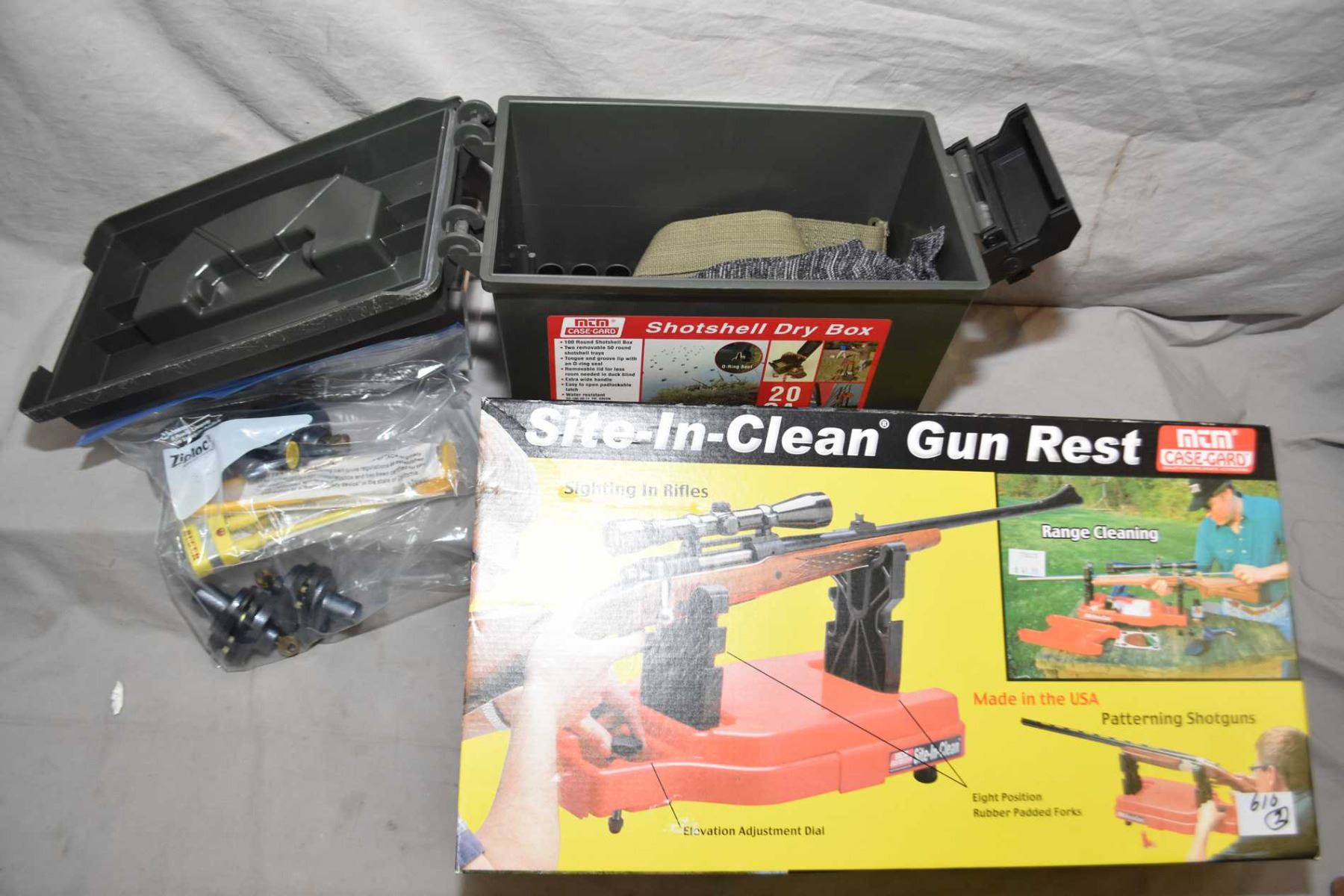 Lot of Two Items : Case Guard Gun Rest [ new in box ] - Plastic Ammo Box : w/ two shot shell trays,