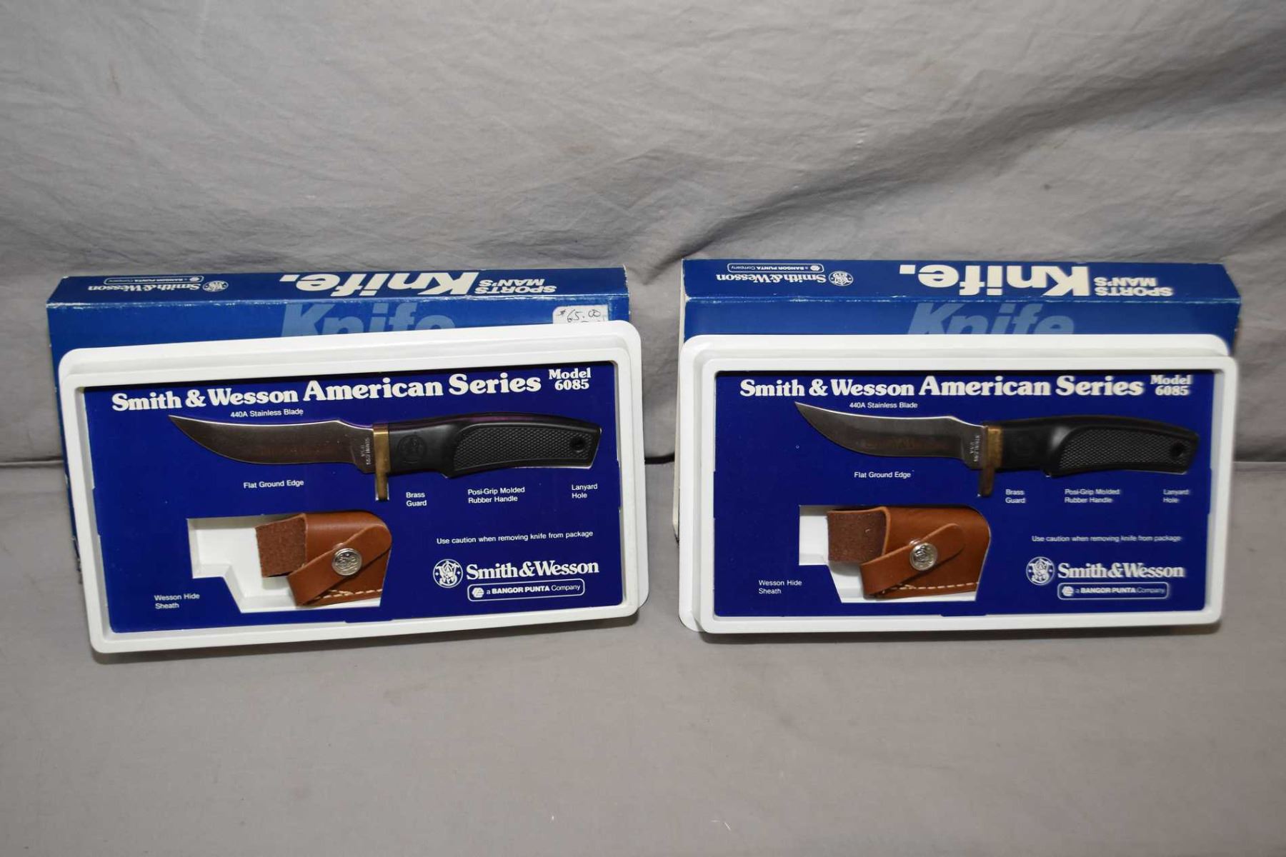 Lot of Two Smith & Wesson American Series Mode 6085 Sportsman's Knives w/ leather sheaths in New in original pkgs, Circa 1970's