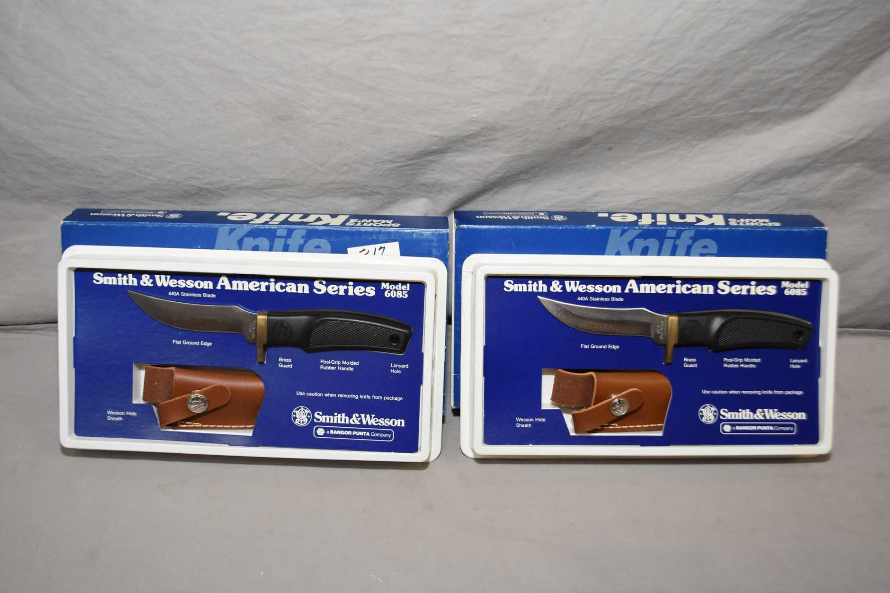 Lot of Two Smith & Wesson American Series Mode 6085 Sportsman's Knives w/ leather sheaths in New in original pkgs, Circa 1970's