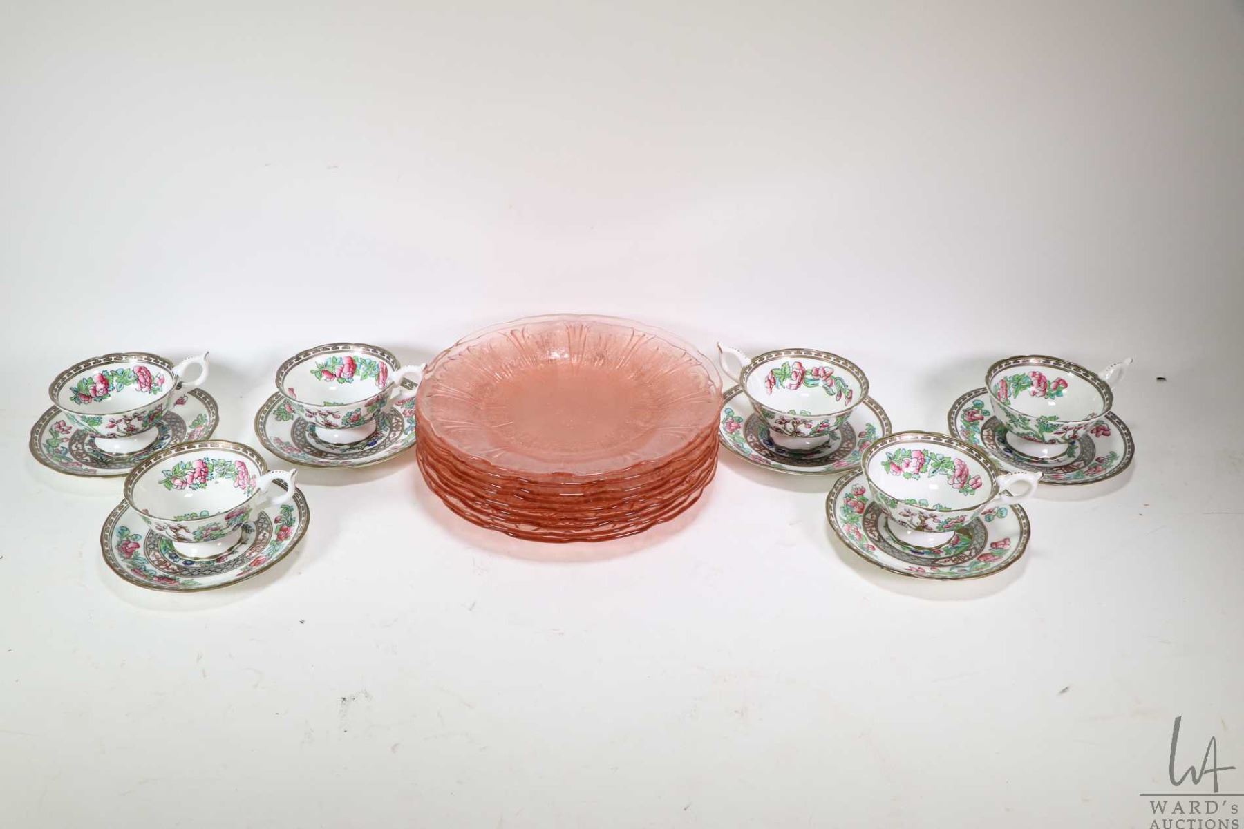 Lot of six Coalport hand painted Indian Tree teacups and saucers plus nine retro pink cherry blossom glass dinner plates 9" in diameter. Note: Not available for shipping. Local pickup only