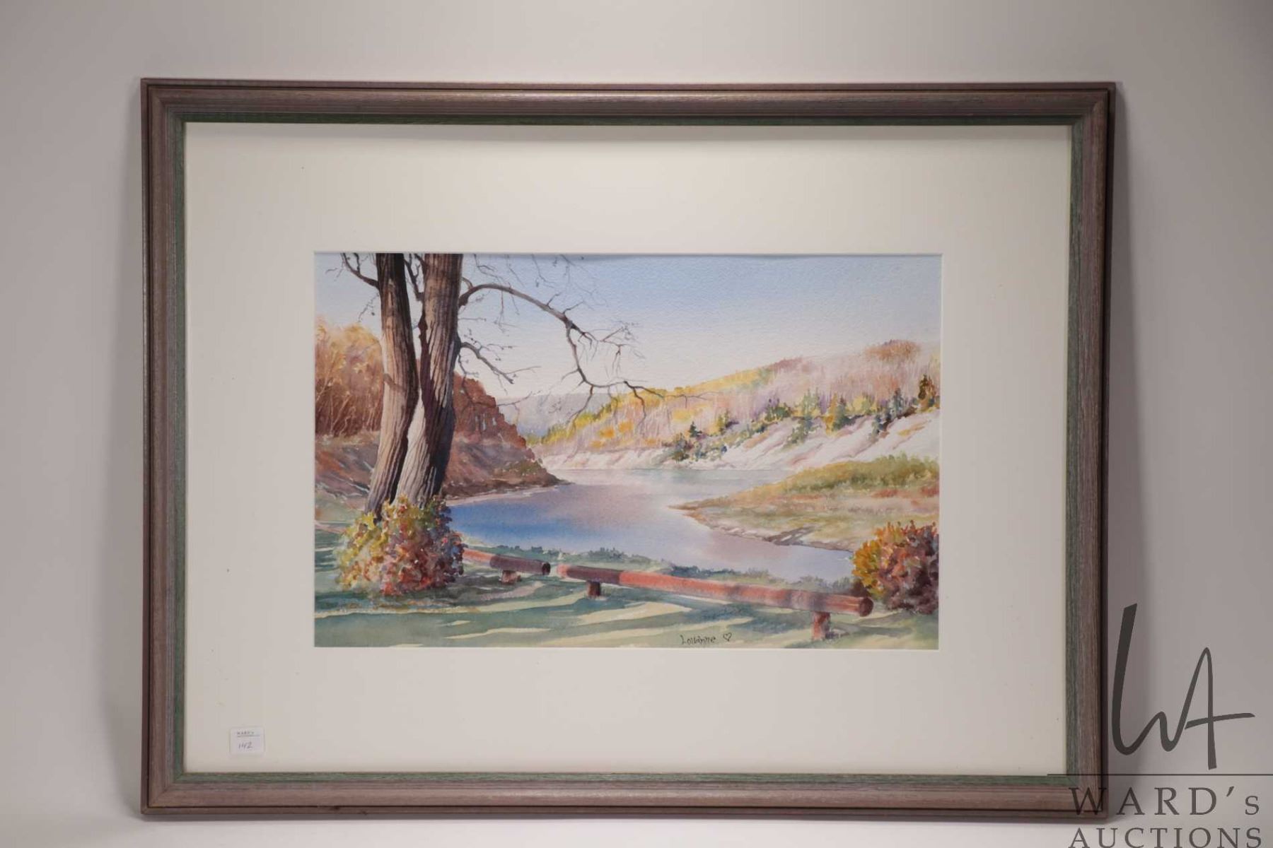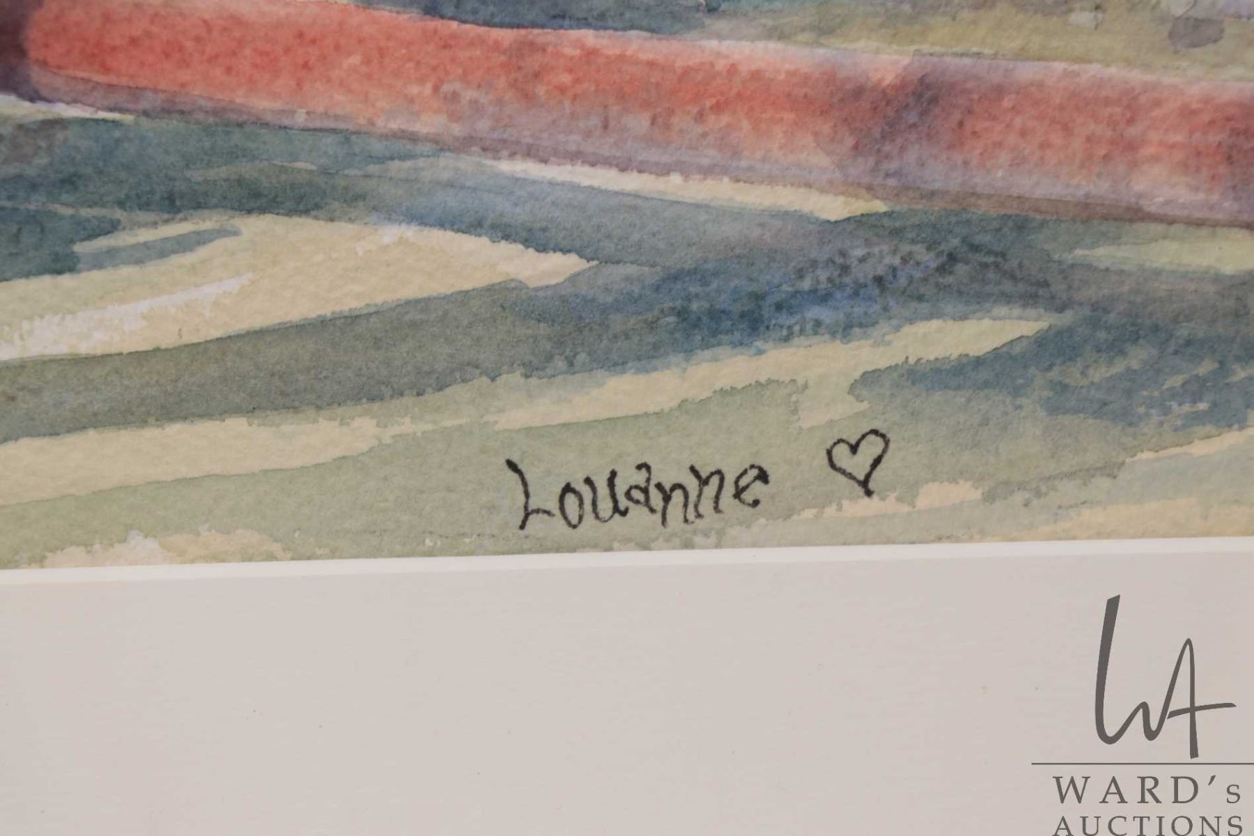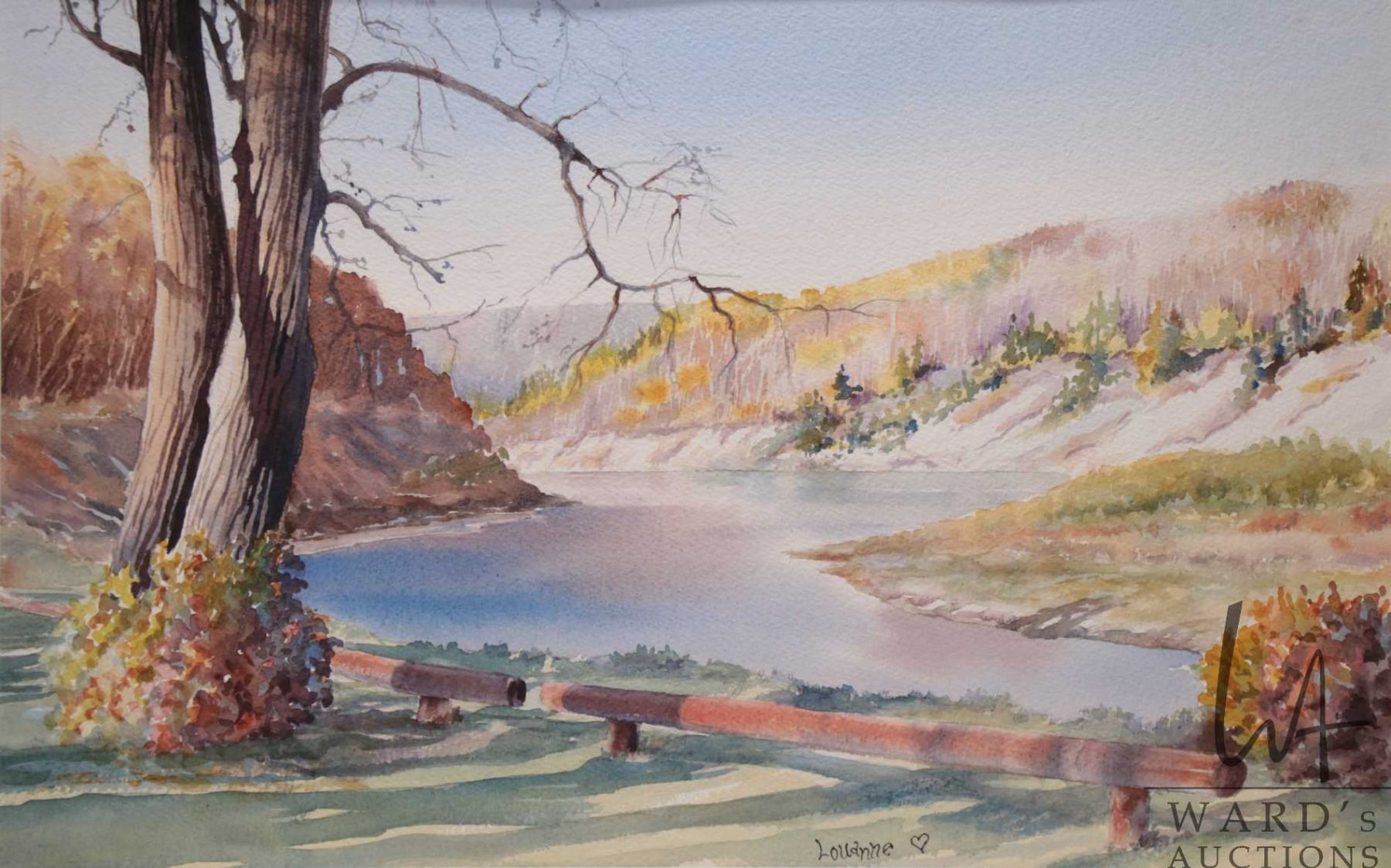 Louanne signed framed watercolour painting of a river valley, signed by artist 12" X 18 3/4"