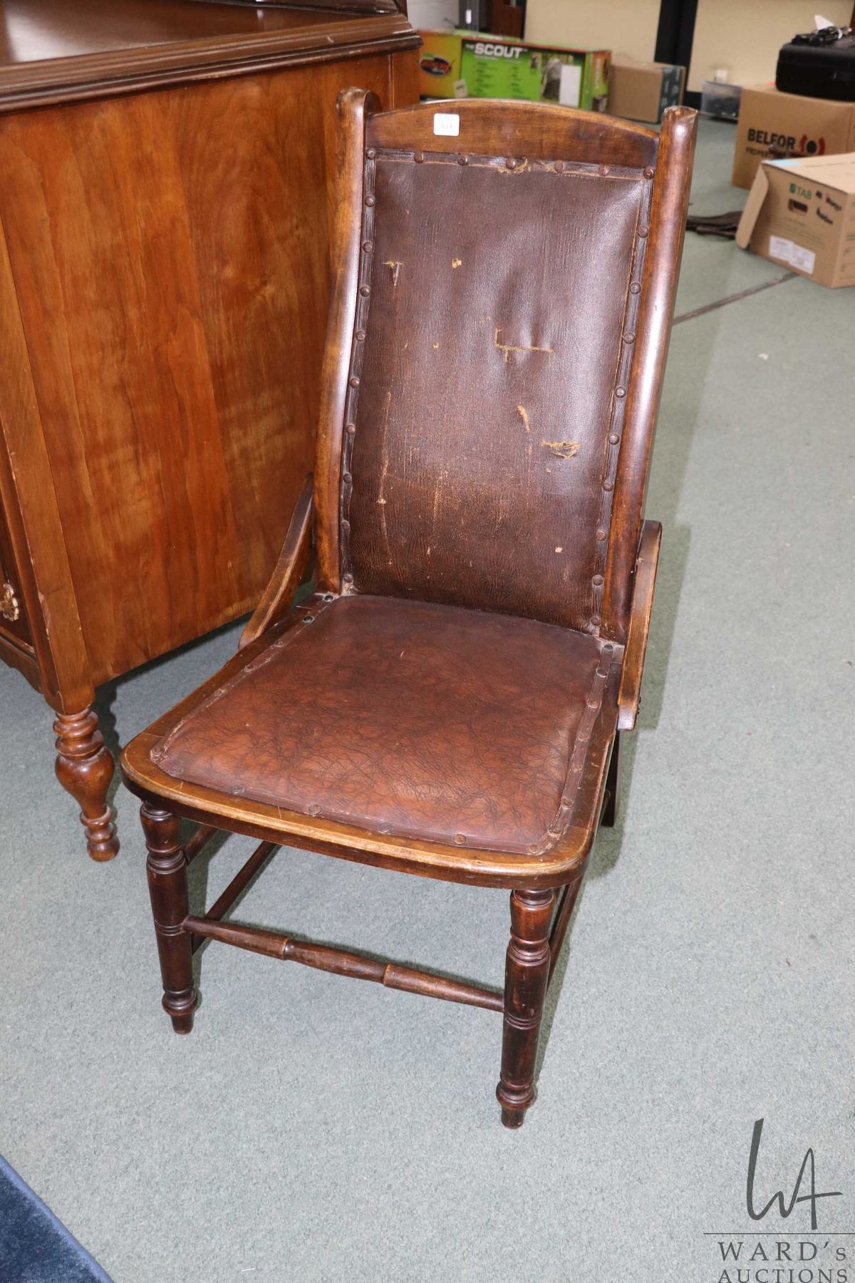 Low slung antique side chair with upholstered seat and back and decorative nail heads, 14" seat heig