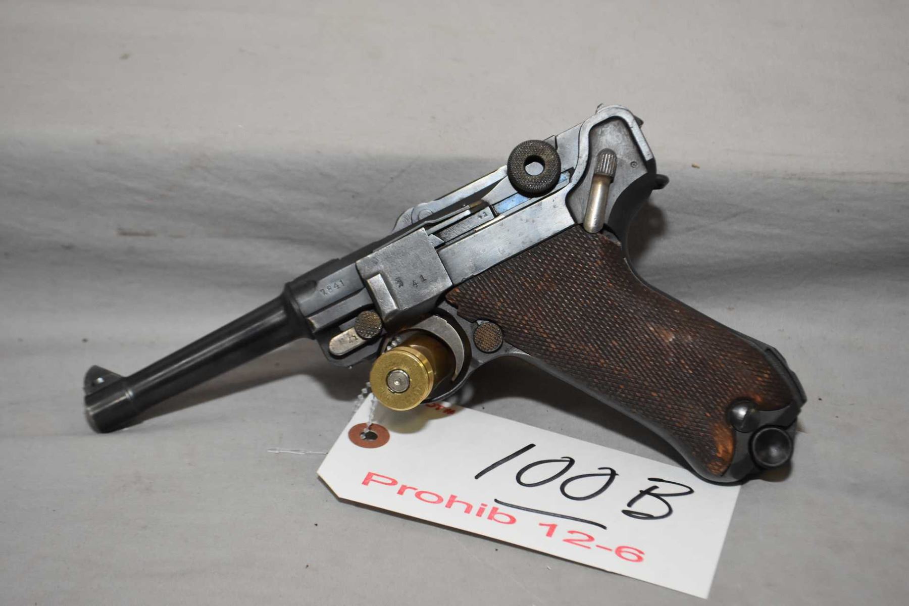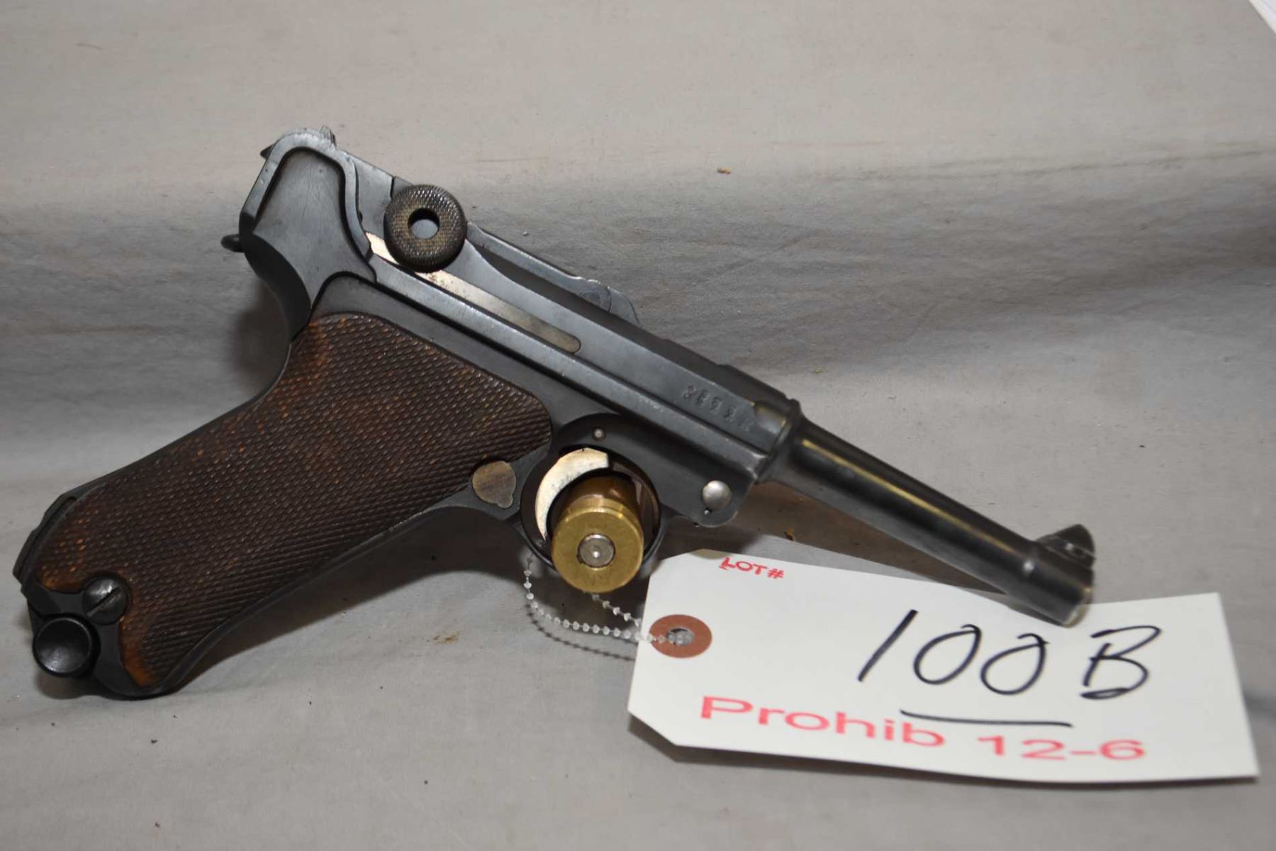 Luger ( DWM) Model P08 .9 MM Luger Cal 8 Shot Semi Auto Pistol w/ 102 mm bbl [ blued finish with few slight marks, slight holster wear, some marks to metal, checkered wooden grips with chip by safety switch, Luger is all matching with a degree of strawy remaining on all small parts, Luger Ser # 7841 bears undated chamber with the receiver cut for an LP - 08 Artillery sight. Most likely the Luger was destined for an Artillery configuration but was instead procured for the German Police Forces. Definately a Imperial era Luger due in part to the right receiver acceptances. Luger has the police Schiwy type rare safety on the receiver rendering the Luger incapable of firing while dismantled as it block the gear by mean of a small attached pin to a spring. Only police P08's have this feature on some of their Lugers. The Luger bears L.A. 33 on front grip strap which is a Prussia Unit mark for the District of Aurich or truly the Regierungsbezirk Aurich prior the Prussian Landgendanmenve being transformed into the NSPAP recongunization of all police states into one German police force called the Gendarmerie as a rural police force. A rare police unit marked Luger ] Ser # 7841 Prohib 12 - 6 Cert # 11567737 FRT # 23656 - 1 EXPECT DELAYS IN TRANSFER